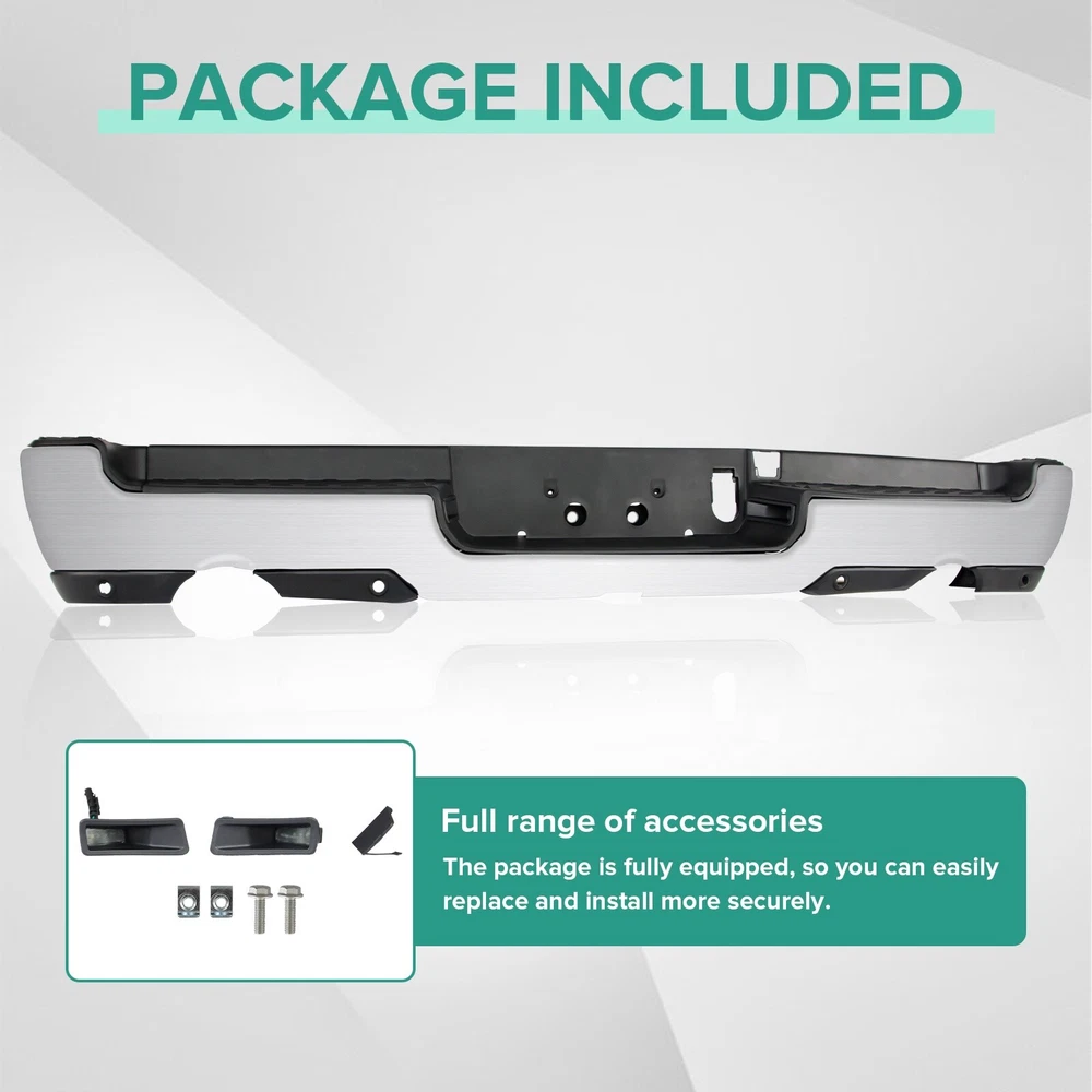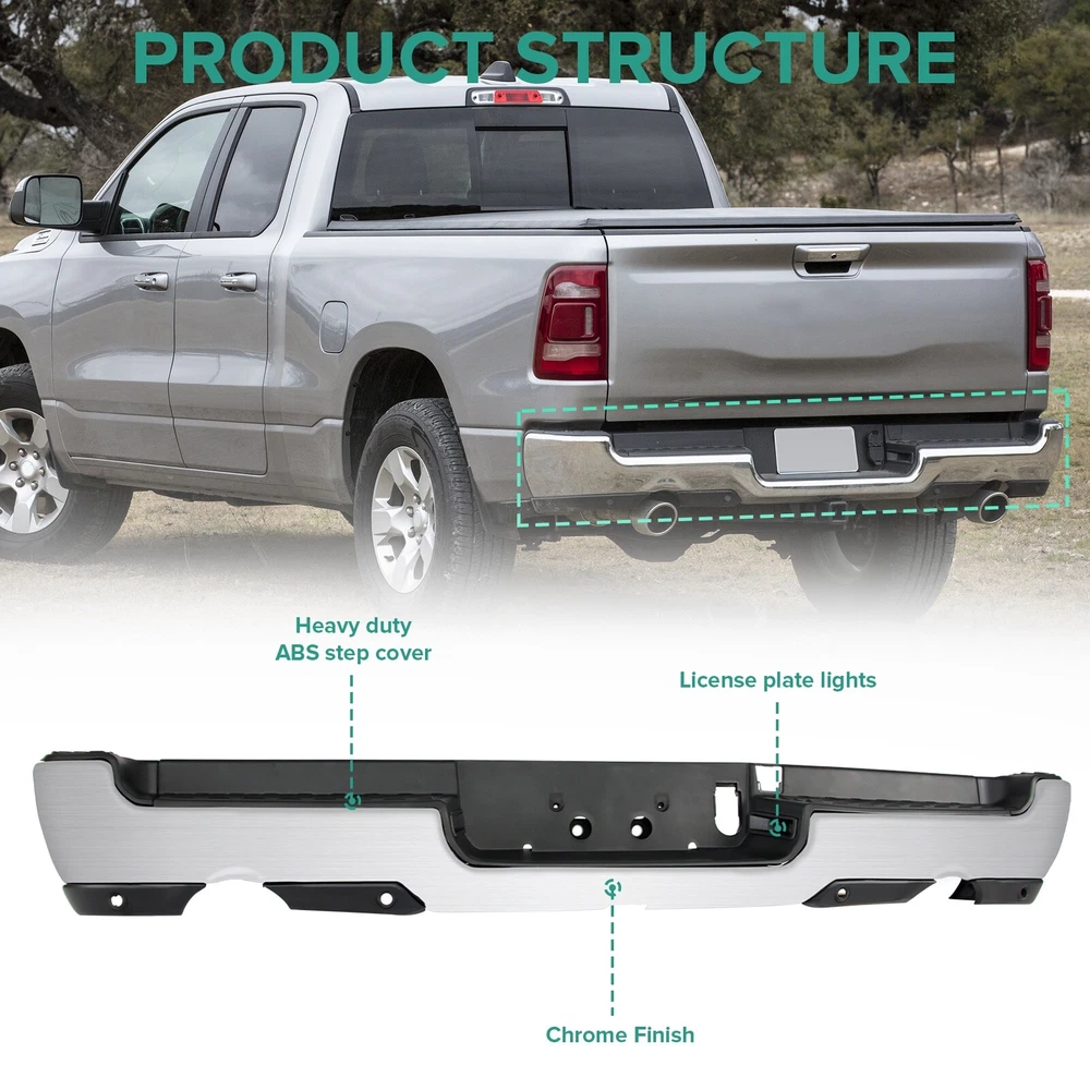Specification Color: Chorme Dual Exhaust: With Dual Exhaust Sensor Holes: With parking aid sensor holes Finish: Chorme Material: Steel Type: Rear Bumper Placement on Vehicle: Rear Fitment Type: Vehicle Specific OE/OEM Part Number: 68404443AA, 68404443AB Partslink Number: CH1103147 Installation Instruction: Not Included Fitment 2019-2023 Ram 1500 Features & Benefits Product Description: 【FITMENT】Our Front Bumper is specifically designed to be compatible with 2019-2023 RAM 1500 models. Please note that it is ONLY compatible with models featuring Dual Exhaust + with Rear Parking Assist Sensor. 【Interchange Part number】This bumper can replace the following part numbers: 68404443AA, 68404443AB, CH1103147. 【Excellent Performance】Featuring non-slip steps, this Dodge Ram rear bumper ensures a safe and convenient entry and exit for your family. More than just a practical addition, it can absorb and slow down external impacts, protecting your vehicle and passengers during collisions and reducing the risk of injury. 【Quality Material】Constructed from high-quality steel and lightweight ABS plastic, this rear bumper offers exceptional durability against wear and rust. No additional drilling or cutting is required, and it also adds a touch of style to improve the overall aesthetics of your car. 【Easy Installation】Our front bumper is easy and quick to install as a direct replacement. The package includes: 1X Rear bumper, along with the necessary mounting brackets and screws. Please note that this product is intended for placement on the rear of your vehicle.