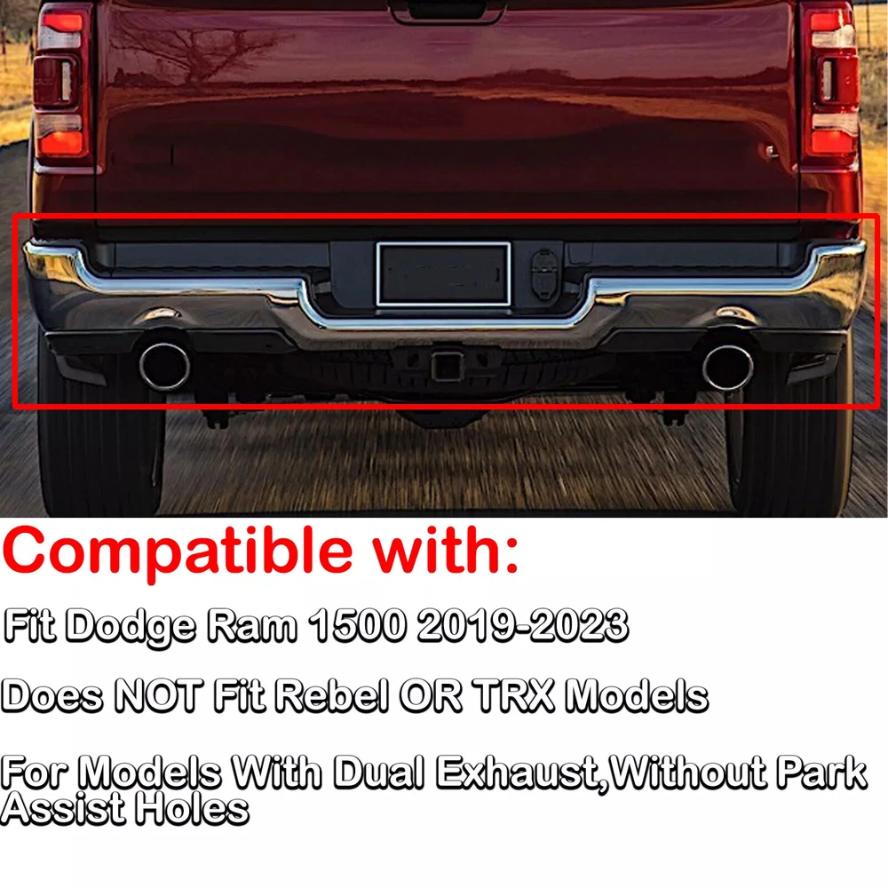 Fitment: Fit Dodge Ram 1500 2019-2023 Does NOT Fit Rebel OR TRX Models Notice: For Models With Dual Exhaust,Without Park Assist Holes. Package Content: 1x Pickup Rear Bumper 1 x Set of License Plate Lamps 1 x Set of Mounting Brackets On Jun 13, 2024 at 22:26:05 PDT, seller added the following information: On Jun 14, 2024 at 19:43:25 PDT, seller added the following information: On Jun 15, 2024 at 07:37:42 PDT, seller added the following information: On Jun 20, 2024 at 10:11:18 PDT, seller added the following information: On Dec 8, 2024 at 05:44:14 PST, seller added the following information: