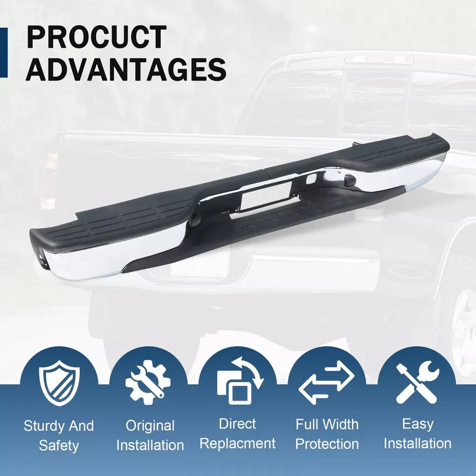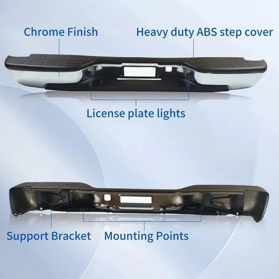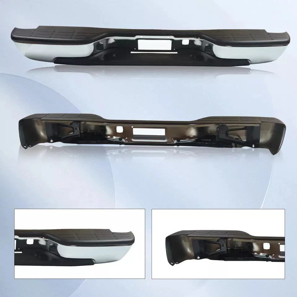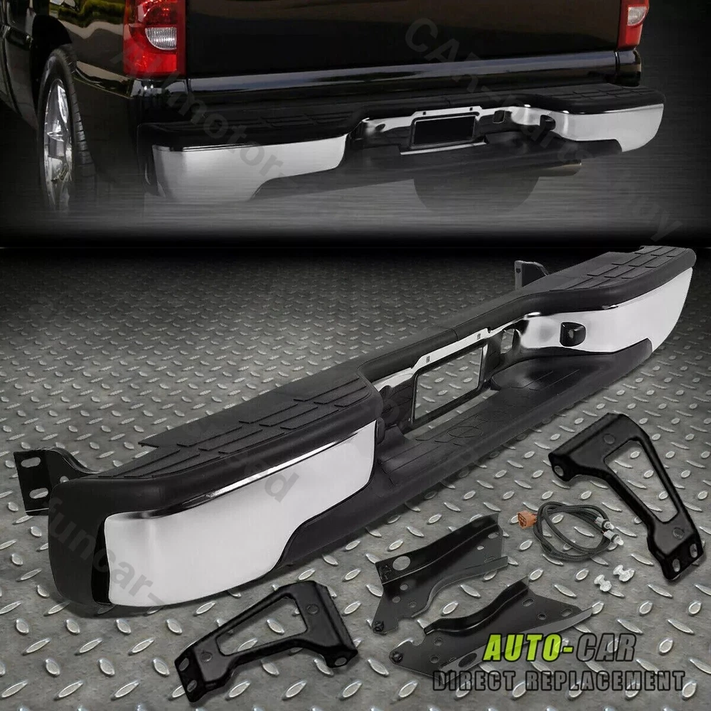Feature Condition: 100% Brand New Color: Chrome Bumper + Black Step Pad Material: Steel + ABS Plastic Placement on Vehicle: Rear Comes with a Complete Set of Step Pads Requires no Modification or Drilling Upgrade and replace your standard or worn rear bumper with a new one. Professional Installation is Highly Recommended Installation Instruction is NOT Included Fits For 1999-2006 Chevrolet Silverado 1500 For 2007 Chevrolet Silverado 1500 Classic For 1999-2004 Chevrolet Silverado 2500 For 1999-2006 GMC Sierra 1500 For 2007 GMC Sierra 1500 Classic For 1999-2004 GMC Sierra 2500 Fits Models without Parking Sensor Holes Package Include 1×Rear Bumper 1 Set of License Plate Lamp Wiring Harness 2×License Plate Lamps Some bolts and screws On Jul 9, 2024 at 09:48:45 PDT, seller added the following information: On Jul 23, 2024 at 18:01:14 PDT, seller added the following information: On Jul 23, 2024 at 20:34:26 PDT, seller added the following information: On Jan 23, 2025 at 22:37:05 PST, seller added the following information: