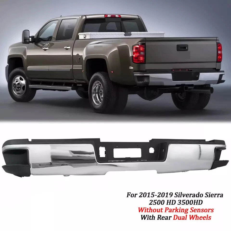 Fitment 2015-2019 Chevrolet Silverado 2500 HD 2015-2019 Chevrolet Silverado 3500 HD 2015-2019 GMC Sierra 2500 HD 2015-2019 GMC Sierra 3500 HD For Dual Rear Wheel (Dually) Models ONLY For Models Without Park Sensors For Use With Factory Tow Hitch (Hitch Plate Not Included) Details Surface Finish:Chrome Material:Steel Includes Reinforcement, Brackets, Hardware, Lamps and Step Pad Direct OE Replacement Package Includes: 1*Rear Bumper Assembly On Dec 12, 2024 at 17:05:25 PST, seller added the following information: On Dec 18, 2024 at 18:21:58 PST, seller added the following information: On Dec 19, 2024 at 09:45:51 PST, seller added the following information: