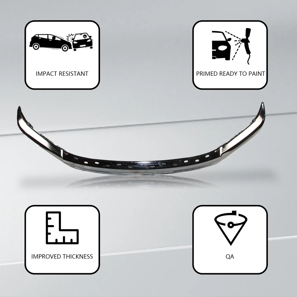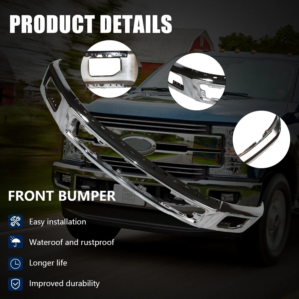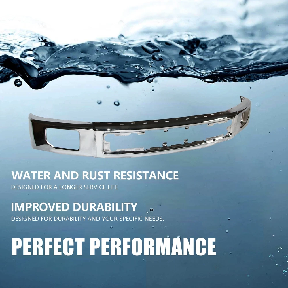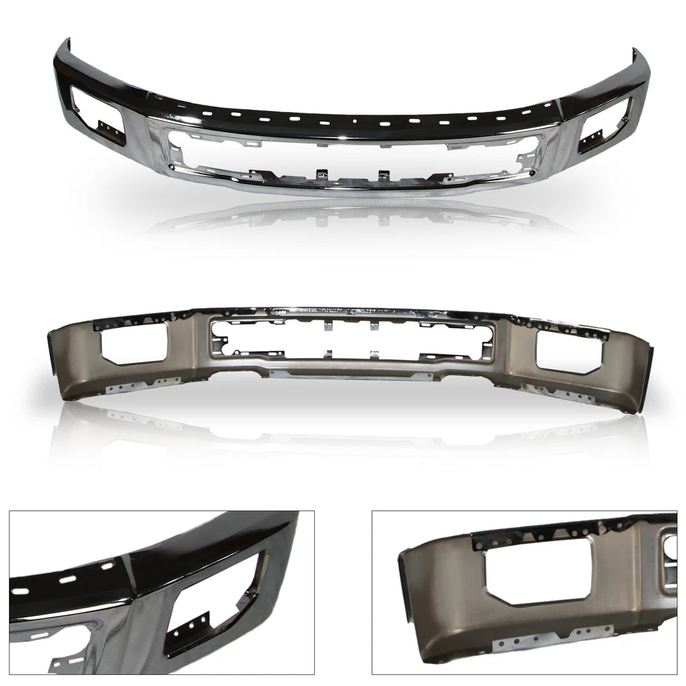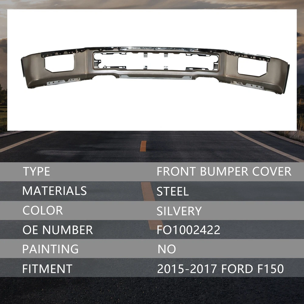 Specification Color: Chrome Fog light holes: With Fog Light Holes Sensor holes: w/o Sensor holes Finish: Chrome Steel Material: Steel Type: Front Bumper Placement on Vehicle: Front Fitment Type: Vehicle Specific OE/OEM Part Number: FO1002422 Universal Fitment: No Country/Region of Manufacture: CN Performance Part: No Condition: New Manufacturer Warranty: 1 Year Installation Instruction: Not Included Items Included: Face Bar Fitment 2015-2017 Ford F-150 Features & Benefits 1. Solid Construction Design - Made of heavy-duty steel and high grade PP to ensure an extremely long-lasting performance in outdoor conditions. 2. OEM Characteristic - Made to exact factory specifications and designed specifically for your vehicle for optimal convenience and functionality. 3. Quick and Easy to install - OE fitment and replacement for factory unit, fast installation without any drilling or modification. Instruction is not included. Professional installation is highly recommended. 4. SUV/Car/Truck front bumpers protect your car from rocks, tree roots and other obstacles. Save your a big fix fee in the body shop.