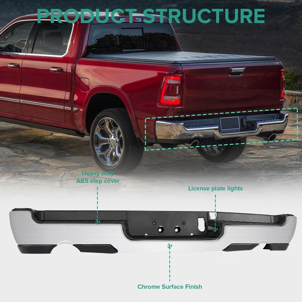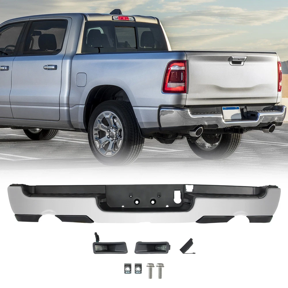 Specification Color: Chorme Dual Exhaust: With Dual Exhaust Sensor Holes: Without parking aid sensor holes Finish: Chorme Material: Steel Type: Rear Bumper Placement on Vehicle: Rear Fitment Type: Vehicle Specific OE/OEM Part Number: 68299101AC, 68299105AC, 68299105AD, 68299112AC, 68404388AB, 68404389AB, 68404443AB, 68404447AB, 68404447AC Partslink Number: CH1103145 Installation Instruction: Not Included Fitment 2019-2024 Ram 1500 Features & Benefits Product Description: 【FITMENT】Our Front Bumper is specifically designed to be compatible with 2019-2024 RAM 1500 models. Please note that it is ONLY compatible with models featuring Dual Exhaust and without Rear Parking Assist Sensor. 【Interchange Part number】This bumper can replace the following part numbers: 68299101AC, 68299105AC, 68299105AD, 68299112AC, 68404388AB, 68404389AB, 68404443AB, 68404447AB, 68404447AC. 【Excellent Performance】Featuring non-slip steps, this Dodge Ram rear bumper ensures a safe and convenient entry and exit for your family. More than just a practical addition, it can absorb and slow down external impacts, protecting your vehicle and passengers during collisions and reducing the risk of injury. 【Quality Material】Constructed from high-quality steel and lightweight ABS plastic, this rear bumper offers exceptional durability against wear and rust. No additional drilling or cutting is required, and it also adds a touch of style to improve the overall aesthetics of your car. 【Easy Installation】Our front bumper is easy and quick to install as a direct replacement. The package includes: 1X Rear bumper, along with the necessary mounting brackets and screws. Please note that this product is intended for placement on the rear of your vehicle.