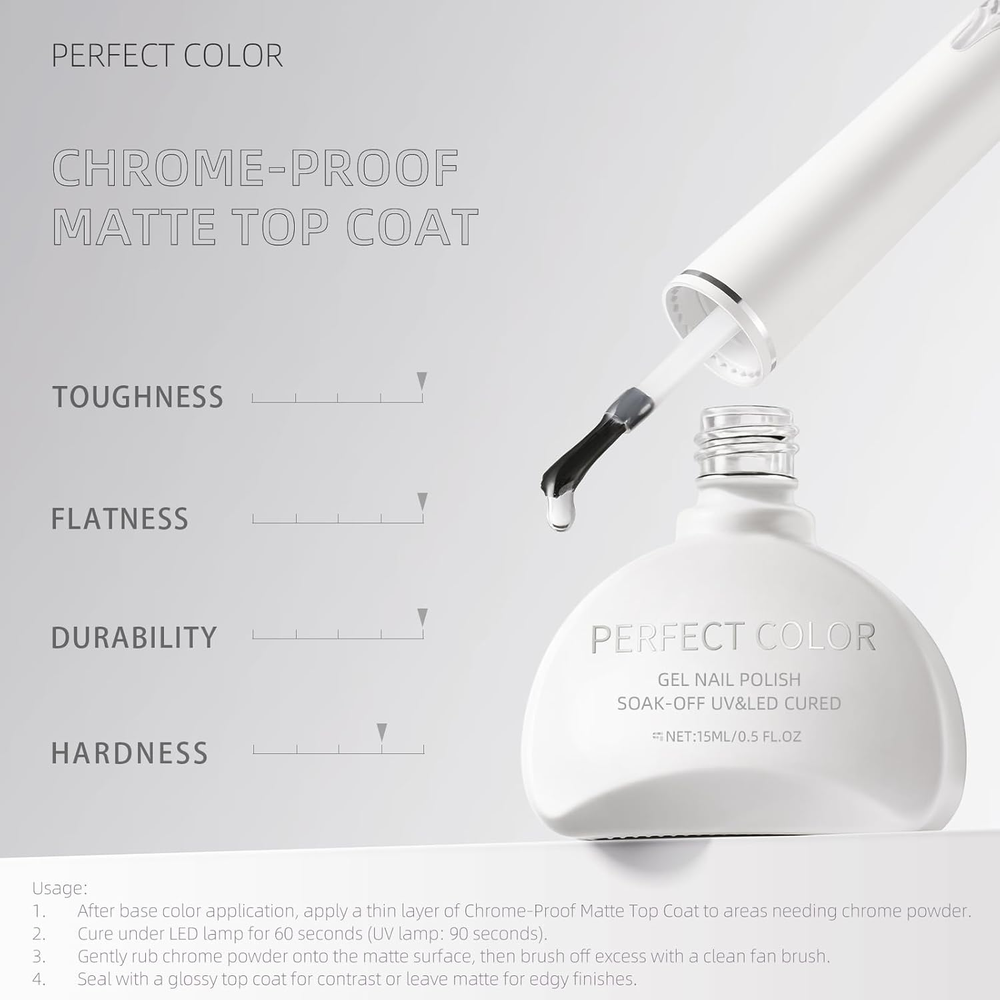 Store New Arrivals Add to Favorite View Feedback Contact Fast deliveries to the customer's home Quality customer service John Make the customers happy! Chrome-Proof Matte Top Coat, UV/LED Cured Gel Nail Polish, Anti-Stick Long-Lasting Formula, 0.5 Fl Oz Description MATTE FINISH: Professional-grade chrome-proof matte top coat delivers a sophisticated non-glossy finish while protecting nail color underneath UV/LED CURED: Quick-curing formula sets in just 60 seconds under LED lamp (90 seconds UV), creating a durable protective layer PRECISION APPLICATION: Features a specialized applicator brush designed for smooth, streak-free coverage and precise chrome powder application VERSATILE USAGE: Can be worn as a matte finish or sealed with glossy top coat for dramatic contrast effects, perfect for chrome powder designs LONG-LASTING FORMULA: Anti-stick technology combined with high toughness rating ensures extended wear and chip resistance, 0.5 Fl Oz bottle size Transform your nail art with this innovative Chrome-Proof Matte Top Coat gel polish. This professional-grade formula delivers exceptional durability with its anti-stick, long-lasting properties. The precision isolating powder application creates stunning metallic designs on the matte surface, perfect for creating sophisticated nail art effects. The 0.5 fl oz bottle includes a precision brush for flawless application. Simply apply a thin layer over your base color, cure under LED lamp for 60 seconds, gently work the chrome powder into the matte surface, and brush away excess for dramatic results. The formula boasts impressive toughness, flatness, and hardness ratings for superior protection. For versatile styling, either seal with a glossy top coat for eye-catching contrast or leave matte for an edgy finish. The self-leveling formula ensures smooth, streak-free application while UV/LED curing technology delivers long-lasting wear. Ideal for both professional nail artists and at-home use, this top coat opens up endless possibilities for creative nail designs. Item model number Functional Gel 08 Item dimensions L x W x H 1.9 x 0.79 x 3.7 inches Liquid Volume 15 Milliliters Special Feature Long Wearing Color Clear Type top_coat Product Dimensions 1.9 x 0.79 x 3.7 inches; 2.4 ounces Model Name M08 Chrome-Proof Matte Top Coat Material Type Free Formaldehyde Resin Free Item Form Gel Finish Type Matte ABOUT US We offer the best prices around on high quality products. Our E-store includes media such as books, movies, music and games while offering electronics, toys, sporting apparel, clothing, tools, general home, garden items and more. SHIPPING We are always working hard to ensure your package arrives as soon as possible. Please understand that some factors like weather, high postal traffic, and the performance of shipping companies are outside of our control. We offer free shipping to the lower 48 states and ship within 2 business days of payment, usually sooner. We do not accept P.O. Boxes. Please provide a physical address. For shipping outside of the continental USA, we only use eBay's Global Shipping Program. The item is shipped to KY and then sent to the rest of the world. International customers are responsible for all duties and taxes. Continue to 'check out' to calculate costs for shipping the item to your country. Messages regarding eBay's Global Shipping Program MUST be directed at eBay EXCLUSIVELY. RETURNS We offer a 30-Day Return Policy on items in which you are not completely satisfied with. You have the option of a full-refund or an exchange of the item. No returns are available on items shipped outside of the USA PAYMENT We accept PayPal. CONTACT US This page content is yet to come Please ad us to your favorite seller and visit again later Thank You CUSTOMER SATISFACTION We try our very best to make sure every customer is completely satisfied. If there's a problem, message us! We're happy to help. WE ACCEPT