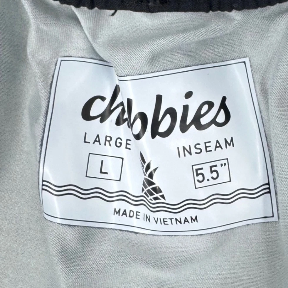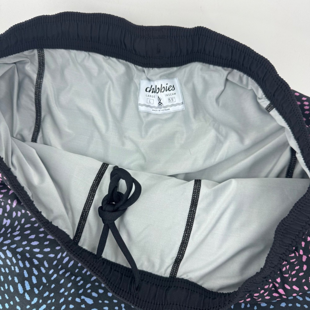 Style: Athletic Handmade: No Country of Origin: Vietnam Pattern: Spotted Personalize: No Vintage: No Features: Drawstring, Pockets, Elastic Waist, Quick Dry Color: Black Department: Men Size: L Closure: Drawstring Size Type: Regular Brand: Chubbies Occasion: Activewear, Casual Theme: Colorful, Tropical Performance/Activity: Beach, Running & Jogging, Water Sports Season: Summer Fit: Athletic Inseam: 5.5 in