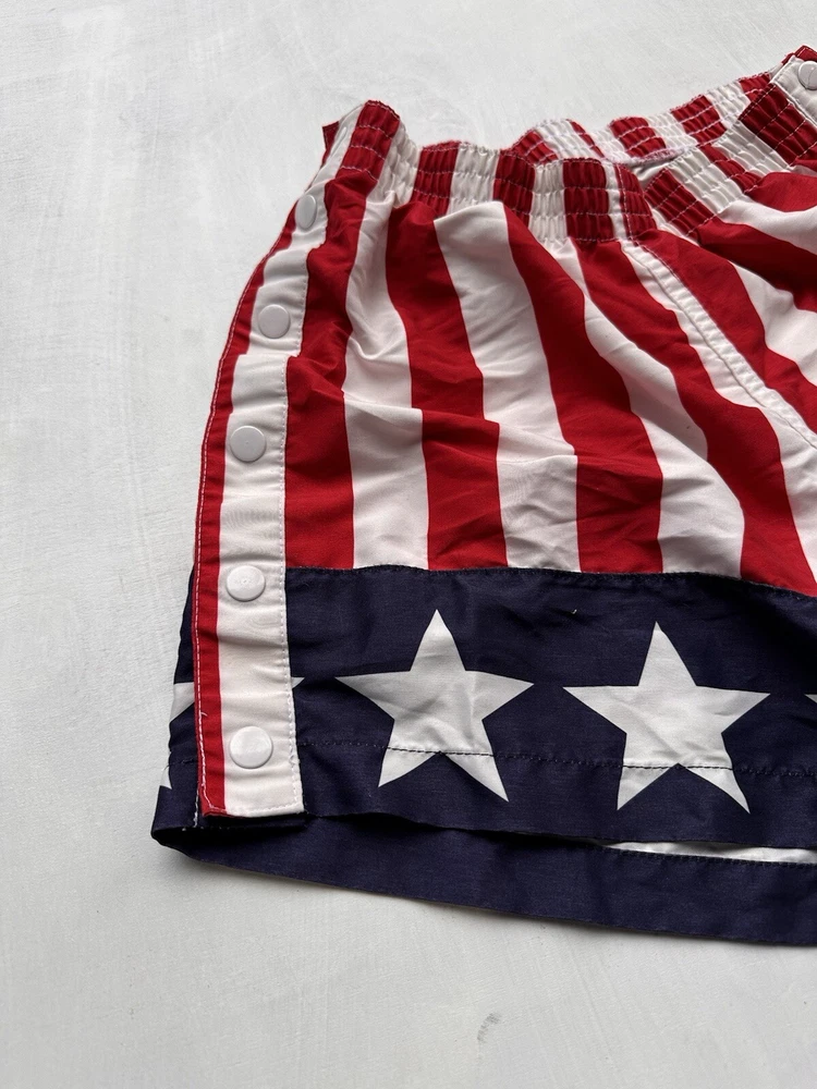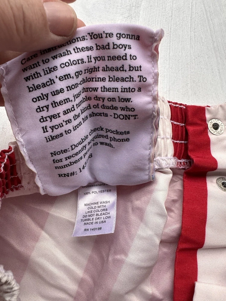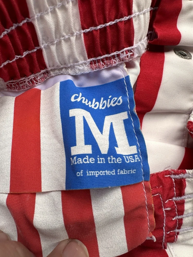 Get ready for the ultimate swimming experience with these Chubbies Men's Rip Away Shorts in the iconic American Flag pattern. These swim shorts feature a slimming design with an elastic waist and drawstring for a comfortable fit. The built-in briefs and pockets provide added convenience, while the UV-protection and water-repellent material keep you safe from the sun and water. Perfect for competition, training, water polo, lifeguard, surfing, or recreational activities, these swim shorts are made with high-quality materials that are chlorine-resistant and quick-drying. With a vintage look and classic theme, these shorts are a must-have for any swimmer's wardrobe.