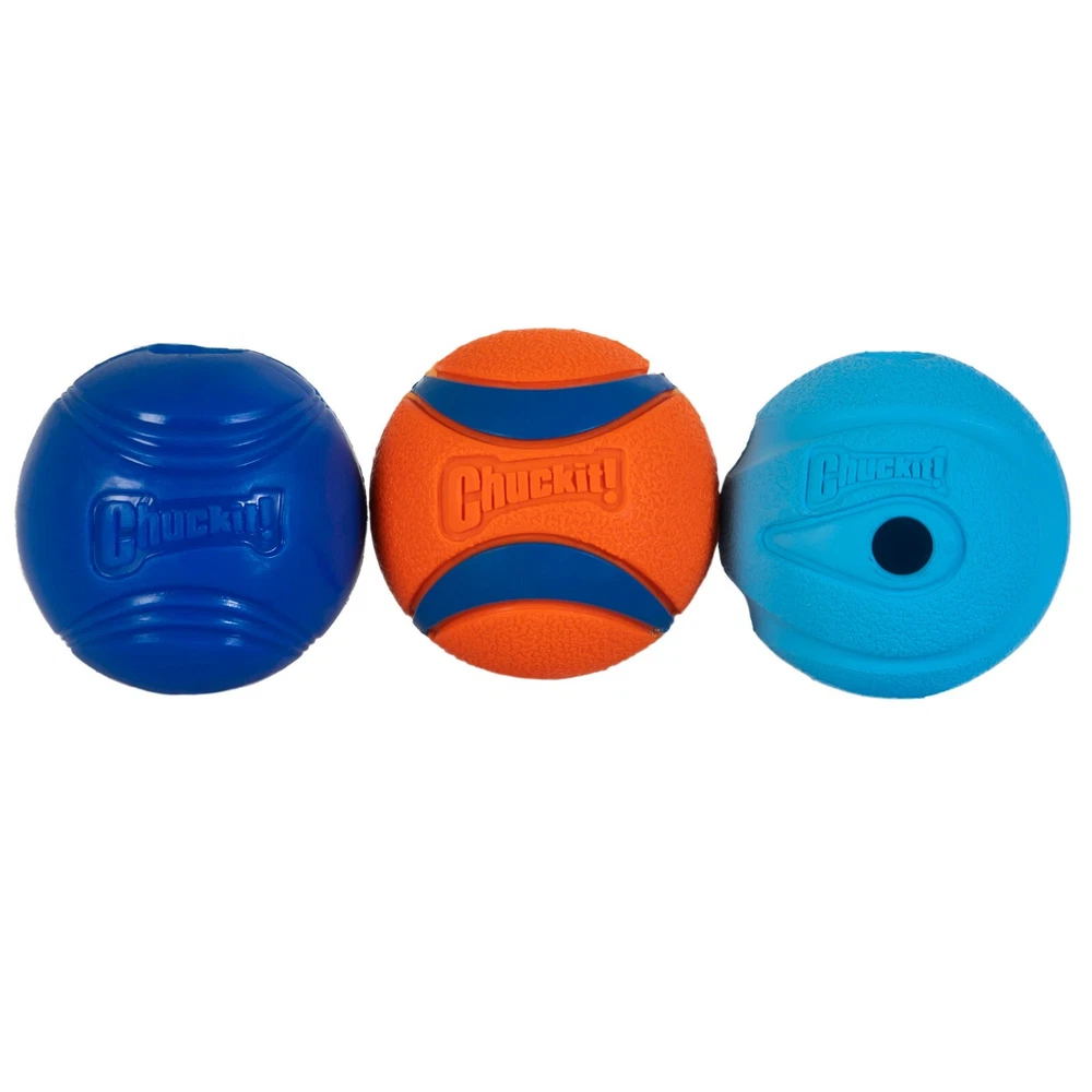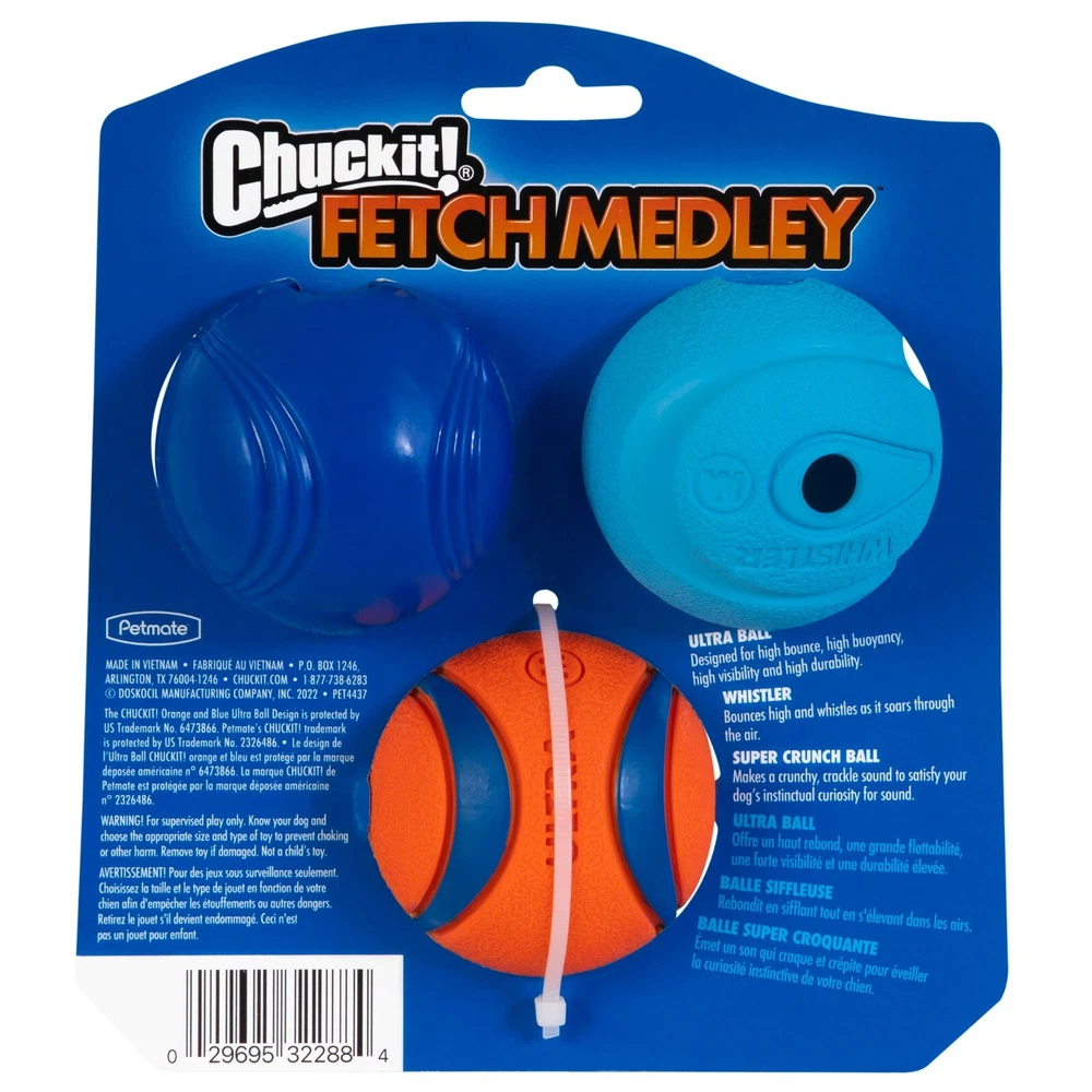 Chuckit! Fetch Medley Triple Pack Balls, Dog Toy, Medium Crunch Ball is durable and makes an engaging crunch sound to satisfy a dog’s curiosity. Ultra Ball is lightweight and bouyant. Whistler Ball is high bouncing and produces a whistle sound as the ball soars through the air. Made of high-quality recycled rubber materials Natural or recycled rubber material that are durable and long lasting. Designed especially for the game of fetch. Easy to clean.