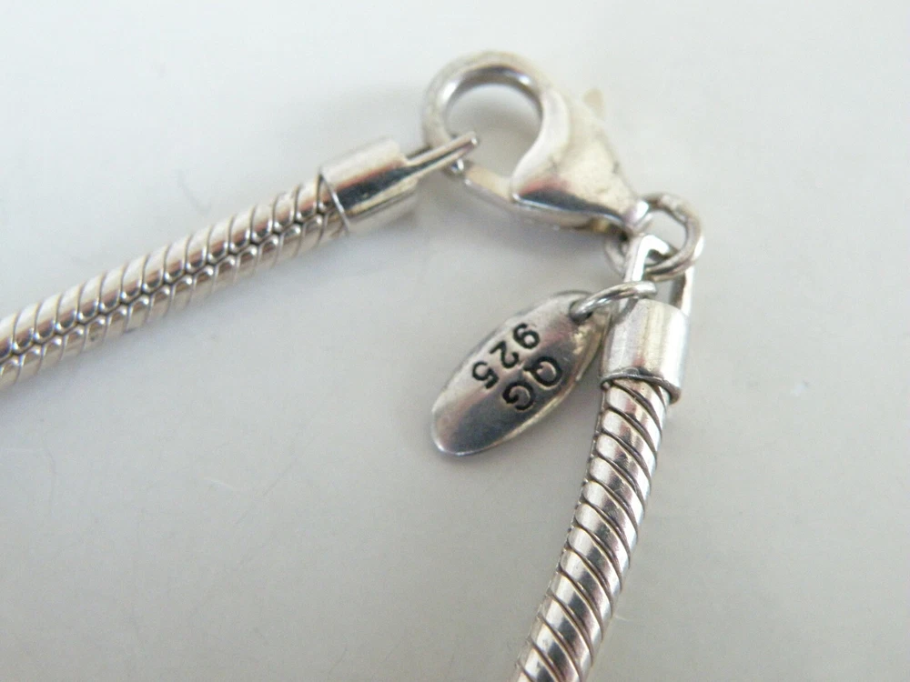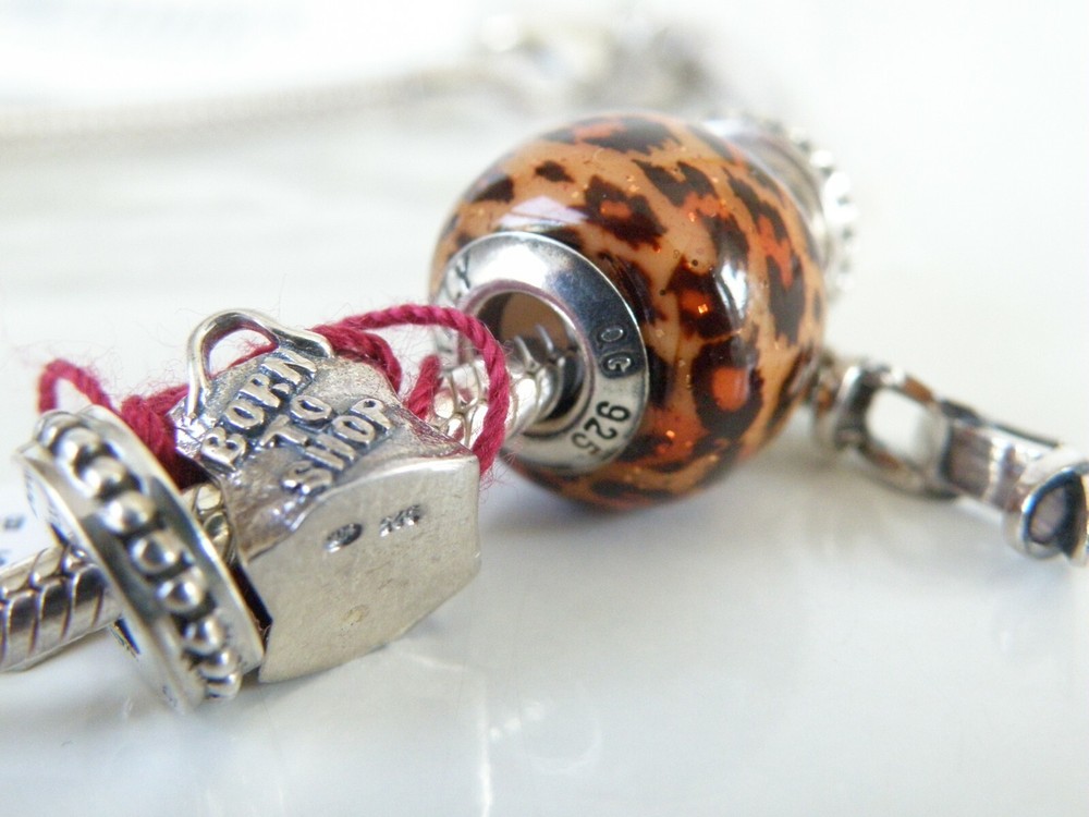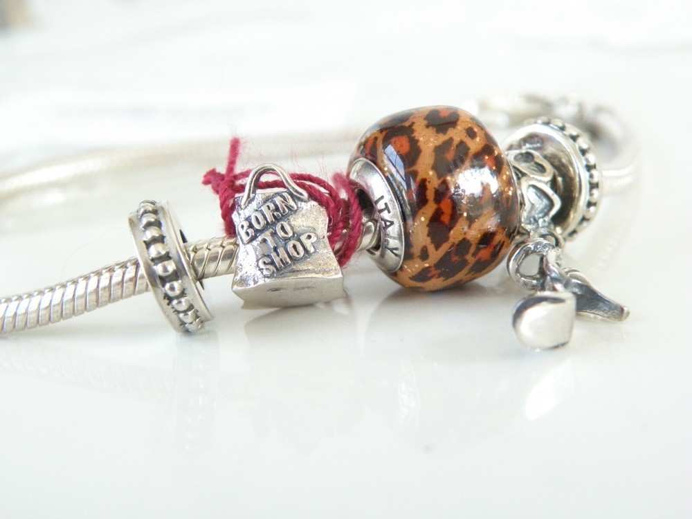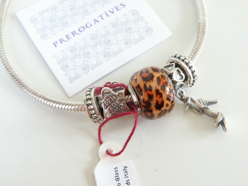 Life is strung together by the moments that define us. Bracelets like these tell your story. This particular bracelet is a shopping theme with the shoe and 'Born to Shop' sterling beads, and leopard print Murano glass bead. Comes with 2 stoppers. WEIGHT: 23.6 grams - chunky MEASURES APPROX: 8.5" long Charms measure approx. 14.3-mm for the largest - the leopard print Murano glass charm All are marked 925 for sterling silver with 'QG' for the maker's mark