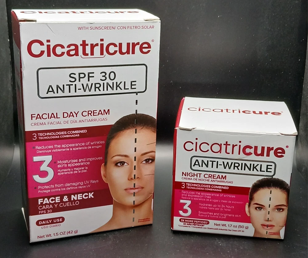Special Bundle Offer. Product One Description:- 🌞 Cicatricure Advanced SPF 30 Sunscreen Anti-Wrinkle Face Therapy Cream – 1.5oz 🌞 Protect & Revitalize Your Skin with Cicatricure Advanced SPF 30 Sunscreen Anti-Wrinkle Face Therapy Cream! Cicatricure Advanced SPF 30 Sunscreen Anti-Wrinkle Face Therapy Cream is a multi-benefit skincare solution that combines sun protection with anti-aging properties. This lightweight, fast-absorbing cream provides broad-spectrum SPF 30 protection, shielding your skin from harmful UV rays while helping to smooth the appearance of fine lines and wrinkles. Infused with nourishing ingredients, it promotes a more youthful, radiant complexion, making it the perfect daily moisturizer. ✨ Why You’ll Love Cicatricure Advanced SPF 30 Sunscreen Anti-Wrinkle Face Therapy Cream: 🌞 Broad-Spectrum SPF 30 Protection Defend your skin from UVA and UVB rays with SPF 30, preventing premature aging and sun damage. πŸ’§ Anti-Wrinkle Formula This advanced formula helps reduce the appearance of fine lines and wrinkles, promoting smoother, younger-looking skin with continued use. 🌱 Nourishing & Hydrating Enriched with nourishing ingredients to keep your skin hydrated, soft, and refreshed throughout the day. 🧴 Non-Greasy & Lightweight The non-greasy, fast-absorbing formula glides smoothly on your skin, making it perfect for daily use under makeup or as a stand-alone moisturizer. πŸ“… Expiration Date: 03/26 Enjoy this 1.5oz jar of sunscreen and anti-wrinkle therapy, lasting until its expiration in March 2026. Fresh, sealed, and ready to use! πŸš€ Why Choose Cicatricure Advanced SPF 30 Sunscreen Anti-Wrinkle Face Therapy Cream? 🌞 SPF 30 Broad-Spectrum Protection – Guards against sun damage and premature aging. πŸ’§ Anti-Wrinkle Formula – Reduces fine lines and wrinkles for a youthful look. 🌱 Nourishing & Hydrating – Keeps skin soft, smooth, and moisturized. 🧴 Non-Greasy & Fast-Absorbing – Perfect for everyday use under makeup. Long Shelf Life – Fresh, sealed product with an expiration date of March 2026. πŸ’₯ Fast Shipping – Order Now Before It’s Gone! Enjoy fast, reliable shipping and start protecting and rejuvenating your skin today! Don’t waitβ€”limited stock available! πŸ”₯ Give Your Skin the Care It Deserves! πŸ”₯ Order Cicatricure Advanced SPF 30 Sunscreen Anti-Wrinkle Face Therapy Cream now and treat your skin to sun protection and anti-aging benefits. Your skin will thank you! Product Two Description:- πŸŒ™ Cicatricure Anti-Wrinkle Night Cream – 3 Technologies Combined – 1.7oz / 50g (NEW) πŸŒ™ Wake Up to Youthful Skin with Cicatricure Anti-Wrinkle Night Cream! Transform your skin overnight with Cicatricure Anti-Wrinkle Night Cream. This innovative formula combines three powerful technologies to target fine lines, wrinkles, and uneven texture. Designed for nighttime use, it works while you sleep to deeply nourish and rejuvenate your skin, leaving you with a smoother, firmer, and more youthful complexion by morning. Wake up to visibly refreshed skin, ready to take on the day. ✨ Why You’ll Love Cicatricure Anti-Wrinkle Night Cream: πŸŒ™ 3 Advanced Technologies Combined Experience the power of three cutting-edge technologies in one cream, working together to smooth, hydrate, and restore your skin’s youthful appearance. πŸ’§ Intense Hydration & Repair This night cream deeply hydrates and restores moisture, helping to repair skin overnight and reduce the appearance of fine lines and wrinkles with continued use. 🌱 Firms & Tightens Skin Formulated with ingredients that promote firmer, more elastic skin, this cream targets sagging and dullness, leaving your face feeling lifted and rejuvenated. 🧴 Non-Greasy & Fast-Absorbing Despite its rich formula, the cream absorbs quickly into the skin without leaving a greasy residue, making it perfect for all skin types. πŸ“… Expiration Date: 03/26 Enjoy this 1.7oz / 50g jar of anti-wrinkle treatment, lasting until its expiration in March 2026. Fresh, sealed, and ready to use! πŸš€ Why Choose Cicatricure Anti-Wrinkle Night Cream? πŸŒ™ 3 Advanced Technologies – Combines multiple anti-aging technologies for maximum results. πŸ’§ Hydrates & Repairs – Deep hydration to help reduce wrinkles overnight. 🌱 Firms & Tightens – Promotes smoother, more youthful skin. 🧴 Non-Greasy & Fast-Absorbing – Ideal for all skin types. Long Shelf Life – Fresh, sealed product with an expiration date of March 2026. πŸ’₯ Fast Shipping – Order Now Before It’s Gone! Get fast, reliable shipping and start rejuvenating your skin tonight! Don’t waitβ€”limited stock available! πŸ”₯ Rejuvenate Your Skin While You Sleep! πŸ”₯ Order Cicatricure Anti-Wrinkle Night Cream now and wake up to smoother, firmer, and more youthful skin. Your skin will thank you! Thanks For Buying.