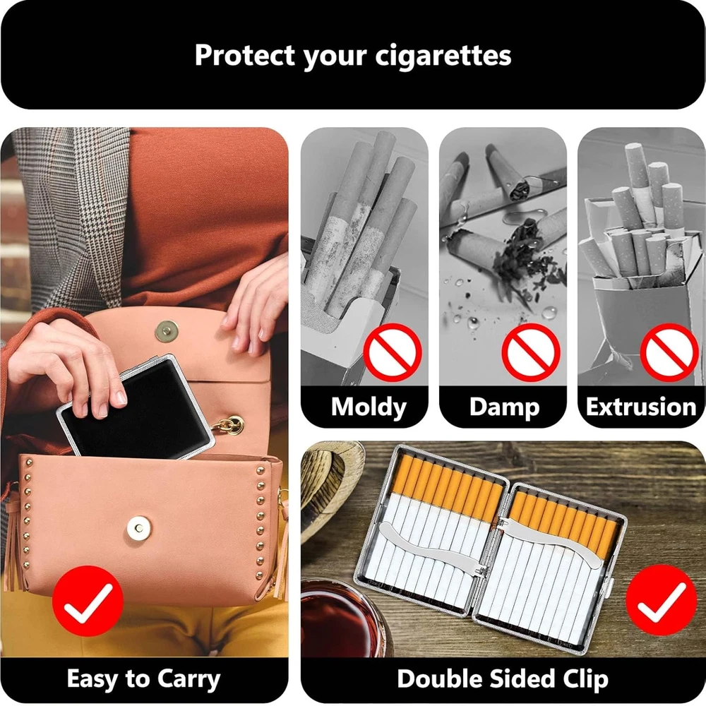 Include Content: Get 3 cigarette case (packaged in exquisite gift box), suitable for personal use and gift giving. Quality Materials: Exterior is made of PU leather and the interior is made of metal, surface is very smooth and the structure conforms to ergonomics. Cigarette Type: Suitable for Regular, King and 100's Size. Can not fit 120mm cigarettes. Design Highlights: Moisture and pressure prevention, can hold 20 cigarettes. Using mechanical switches, double sided spring clip open. Applicable scope: Roygra cigarette case can be used in patio, homes, offices, outdoors, balconies, bars, cafes, hotels, and more. Product Description The video showcases the product in use. The video guides you through product setup. The video compares multiple products. The video shows the product being unpacked.