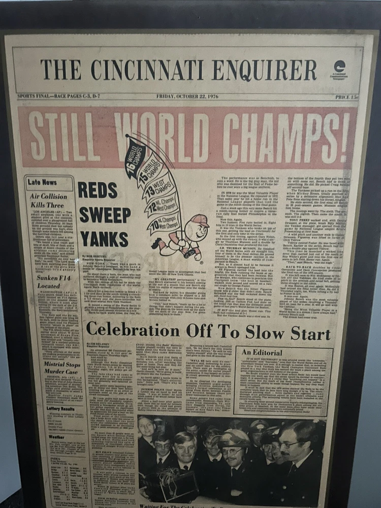 Cincinnati Reds Vintage Sports Memorabilia Laminated And Mounted Enquirer 1976. Professionally laminated and mounted by American Laminating Company Cincinnati is a page from the Sports section of The Cincinnati Enquirer dated Friday, October 22, 1976 Price 15 c titled “Still World Champs!” Reds sweep Yanks. This is in good condition considering age with yellowing and some holes in the paper at the bottom and not on the wording itself from a previous wall hang before mounting. Please see pictures. This would make a great gift for a sports enthusiast, collector, man cave, bar the list goes on and on. Overall measurement 17” x 28”.