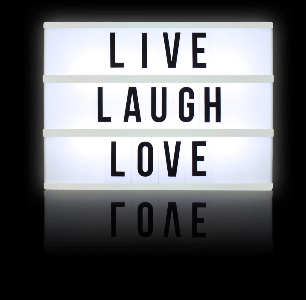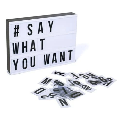 Inspired by old Hollywood vintage cinema, slide interchangeable clear plastic tiles into rails on the front of this sleek light box to create words and phrases. Flip a switch and watch your words light up with life! Great for home décor, wedding décor, birthdays, milestone celebrations, photoshoots, movie nights, and so much more. Set Includes: Led Light Box 109 letters, numbers and symbols. Place it on a tabletop or mount onto a wall and light up your world with fun quotes and phrases. VINTAGE CINEMA STYLE LIGHTBOX: Are you looking for a unique decorative piece with vintage vibes? Then the cinema light box is exactly what you need! The LED light up box is designed to look like those cinema and theater signs that would advertise a movie and share a fun message. You can now write your own fun, inspirational or motivational message on the mini lightbox and create a black-and-white film feel to your space! MORE LETTERS & CHARACTERS: So what message are you planning to write on the cinema lightbox? Thanks to the 109 letters and characters, your options are endless. So be creative and change the message on the light up box as often as you want! The procedure is fast and effortless. DECORATE ANY SPACE YOU WANT: You can decorate any space with the cinema style light up message sign for any occasion. First of all, you can decorate any room of your house and turn on the LED light box once the sun goes down. You can also decorate your office to make it warmer! Finally, you can use the light up box for weddings, Christmas parties and baby milestones. Thanks to the extra long durable USB cable, it won’t be hard to find the perfect spot. USB powered (white USB cable included) or battery operated (6xAA not included)