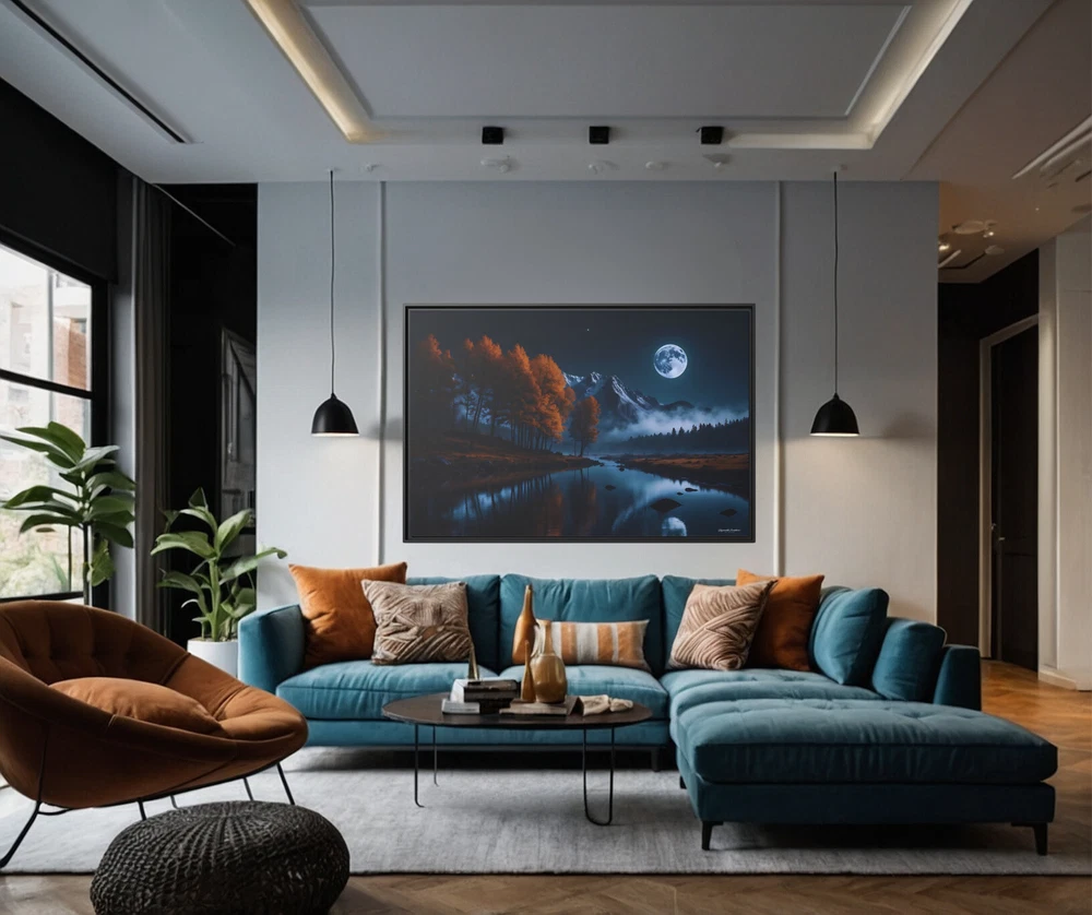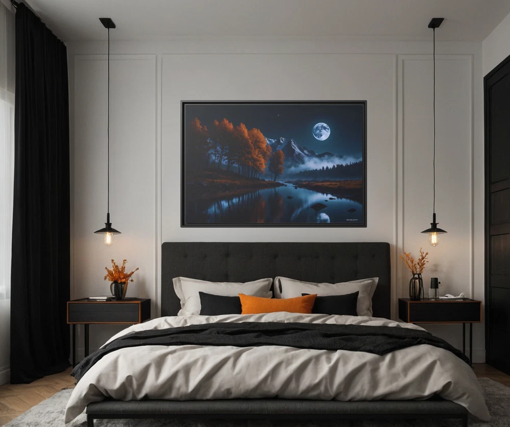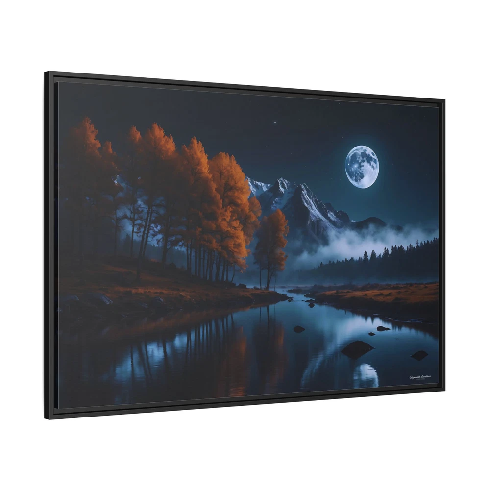 Moody Moonlit Mountain Lake Landscape Illustration Product Description : Immerse yourself in the dramatic beauty of nature with this Moonlit Mountain Lake Landscape Illustration by Hypnotik Creations. This breathtaking piece captures the moody allure of a serene full moon illuminating a tranquil lake with a perfectly still and reflective surface. Framed by rugged rocky mountain peaks in the distance, the landscape transitions into lush pine forests cascading down the slopes on one side and vibrant orange autumn foliage gracing the opposite edge of the lake. With its rich, dark color palette dominated by deep blues and fiery oranges, this photography-inspired illustration brings the raw beauty of the wilderness to life. Expertly printed in HDR on museum-quality cotton-polyester composite gallery-wrapped canvas, this artwork features a proprietary matte finish coating that enhances vibrancy and ensures long-lasting, eye-catching detail. Using UL-certified Greenguard Gold latex inks that are non-hazardous, non-toxic, and non-flammable, the artwork guarantees unmatched quality while being safe for any environment. Encased in a 1.25" solid pine wood frame with a sleek black finish, the canvas creates a stunning floating effect that elevates its aesthetic appeal. Made from sustainably sourced Forest Stewardship Council-certified materials, the frame is an eco-friendly choice that aligns with modern sustainability values. The piece arrives ready to hang, complete with sawtooth hanging hardware pre-attached and rubber dots on the bottom to keep it securely in place. Key Features : Breathtaking Design : Features a tranquil full moonlit lake surrounded by rocky peaks, lush pine forests, and vibrant autumn foliage. Photography-Inspired Art : Dark, rich color palette dominated by deep blues and warm oranges for a striking visual impact. Museum-Quality Canvas : Printed in HDR on a premium cotton-polyester composite gallery-wrapped canvas with a proprietary matte finish coating for long-lasting vibrancy. Eco-Friendly Materials : Crafted with UL-certified Greenguard Gold latex inks and sustainably sourced Forest Stewardship Council-certified pine wood. Elegant Framing : 1.25" solid black pine wood frame provides a modern floating effect to enhance any interior space. Ready to Hang : Comes with pre-attached sawtooth hanging hardware and rubber dots for stability. Durable and Safe : Uses non-hazardous, non-toxic, and non-flammable inks; canvas can be gently wiped with a clean, damp cloth to maintain its beauty. Slight Size Variations : Due to the production process, allow for size deviations within +/- 1/8" (3.2mm). Transform your space with this striking depiction of nature’s untamed beauty. Ideal for nature enthusiasts and art lovers, this captivating piece creates a tranquil yet dramatic focal point in any setting. * Shipping to Alaska, Hawaii, and unincorporated territories of the United States can take additional 7 ? 12 business days, weather permitting.