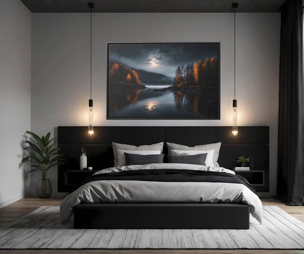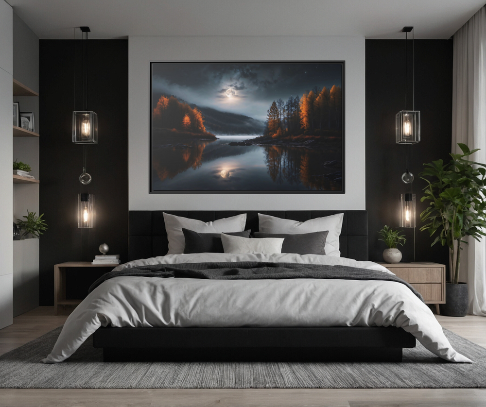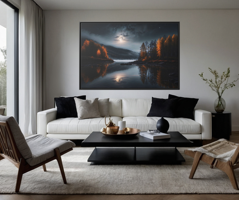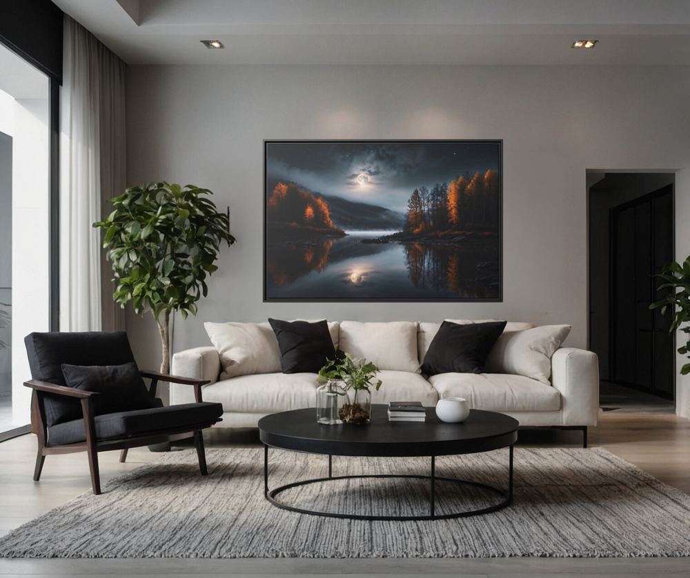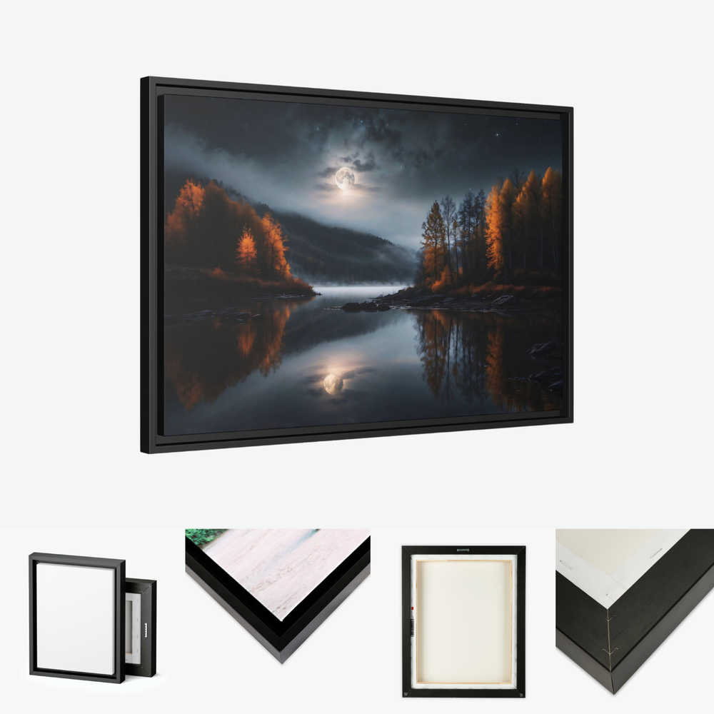 Moonlit Autumn Serenity: Cinematic Landscape Art on Framed Canvas Transform your space with the evocative beauty of Moonlit Autumn Serenity , a cinematic illustrative art piece capturing the tranquil charm of a moonlit mountain lake nestled amidst vibrant autumn foliage and a serene forest. The moody atmosphere and intricate details create an immersive experience, making this artwork a centerpiece that inspires relaxation and connection to nature. Expertly printed on museum-quality, eco-friendly cotton-polyester canvas , this masterpiece showcases crisp colors and a rich depth of detail that enhance its visual impact. The black handcrafted pine wood frame complements the artwork, adding sophistication while ensuring durability. This framed canvas arrives ready to hang , making it an effortless way to bring the serene essence of autumn into your home or office. Key Features: Cinematic Design: Captures a moonlit mountain lake surrounded by autumn foliage and a tranquil forest. Premium Materials: Printed on museum-quality, eco-friendly cotton-polyester canvas for exceptional detail and color vibrancy. Handcrafted Frame: Encased in a black handcrafted pine wood frame, offering a sleek and durable finish. Ready to Hang: Convenient pre-installed hanging hardware for effortless installation. Eco-Friendly: Crafted with sustainable materials, perfect for the environmentally conscious. Size Options: 30x20, 36x24 & 48x32 Experience the serene allure of nature with this Moonlit Autumn Serenity art piece, a perfect blend of elegance and tranquility. * Shipping to Alaska, Hawaii, and unincorporated territories of the United States can take additional 7 ? 12 business days, weather permitting.