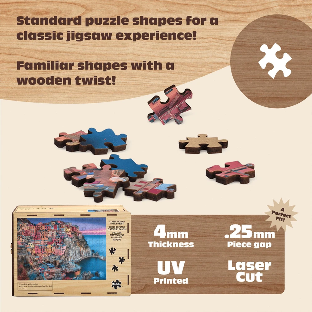 This wood puzzle from puzzle heavy hitter, , is a Standard Pieces cut wood version of our ever popular Cinque Terre Premium Quality Wood Puzzle for Adults HIGHEST QUALITY MATERIALS – Our puzzle pieces are thick and sturdy, our dies cut our puzzles with laser precision. STURDY AND BEAUTIFUL: Durable, classic wooden puzzle pieces cut to a standard jigsaw pattern or whimsy pattern will be the centerpiece of your puzzle collection. PRECISION CUTTING TECHNOLOGY: prides itself onit's technology to cut our puzzles and that extends to our wood collection as well. Precision laser cutting ensures a snug, satisfying fit GIFTABLE PUZZLE: Makes for the perfect gift for any puzzle enthusiast in your life! Your puzzling friends and family will enjoy the feel and look of these wooden jigsaw puzzles. BONUS POSTER: Full color bonus poster included for help in solving the puzzle. The poster also has information about artists, or the image on the puzzle.