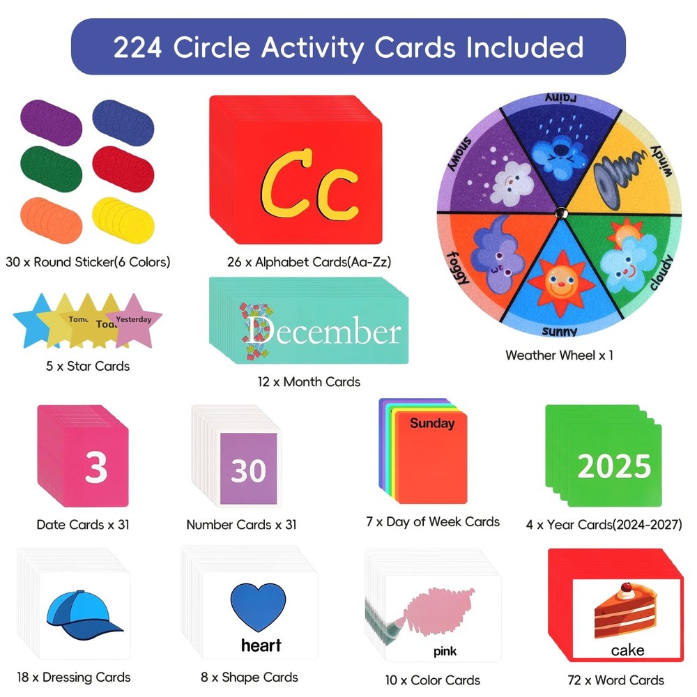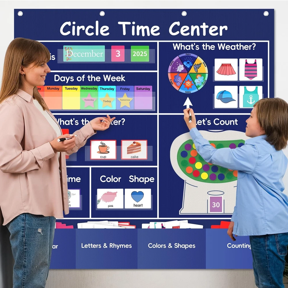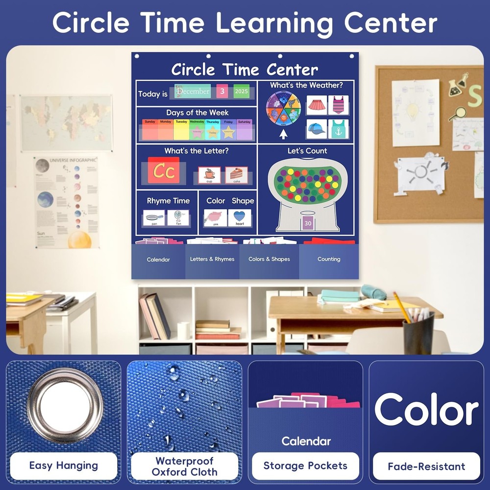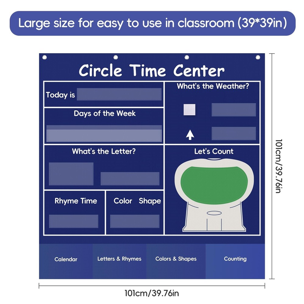 Circle Time Learning Center Classroom Pocket Chart, Circle Time Calendar Preschool Include 224 Cards, Educational Pocket Chart Material, Learning Calendar Weather Letter Counting Color Shape Product Details Color: Blue Brand: Ottkids MPN: Circle Time Center-Blue UPC: Does not apply EAN: Does not apply Product Dimensions: 39.7 x 39.7 x 0.39 inches Item Weight: 2.27 pounds Item model number: Circle Time Center-Blue Manufacturer: Ottkids PVC Imported Circle Time Learning Center Set: The Circle Time Learning Center includes a pocket chart, 224 educational cards, 30 sticky counters, and a round weather wheel. This alphabet learning pocket chart is an important classroom learning resource for teachers to conduct instruction Large Size:Calendar pocket chart measures 39.76"(L) 39.76"(W). This circle time pocket chart features smooth and sturdy metal holes above for easy hanging anywhere, and there are 4 storage pockets at the bottom to store extra cards(not including hooks) Essential Tools for Learning:Our circle time chart provides practice in calendar concepts,talphabet recognition, rhyming words, counting, weather patterns, shapes, colors identification. It covers a variety of topics and makes education fun, greatly enhance children's emotional expression, foundational knowledge and hands-on skills in their daily learning High Quality Material: Ottkids Circle Time Center Chart is crafted from durable 420D polyester, sturdy and tear-resistant.Its transparent PVC pockets are eco-friendly and easy to wipe, leave no residue,giving you peace of mind during use. When you're not using it, this learning pocket chart can be folded and stored without taking up too much space Versatile Application: Circle Time Center Pocket Chart perfect for classroom instruction, family education, student exchange,group discussions, student demonstration and more(Tip: Please allow time to cut the cards before using the centers pocket chart)