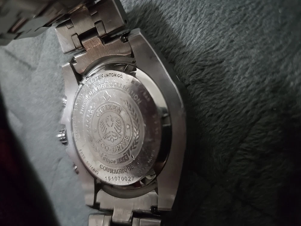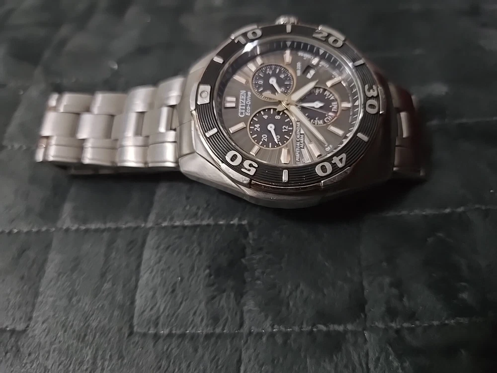 Very Rare Citizen Perpetual Calendar Eco-Drive Signature Collection Courageous Model BL5446-51H Watch Features: - Model: Signature Collection Courageous Model - Power: Solar quartz powered by an accurate Eco-Drive E820 movement. No battery required. - Perpetual Calendar Chronograph: 1/20-second chrono measures up to 60 minutes This watch is used. Has new battery. It does work. It does have scratches. All sales are final. No returns No refunds
