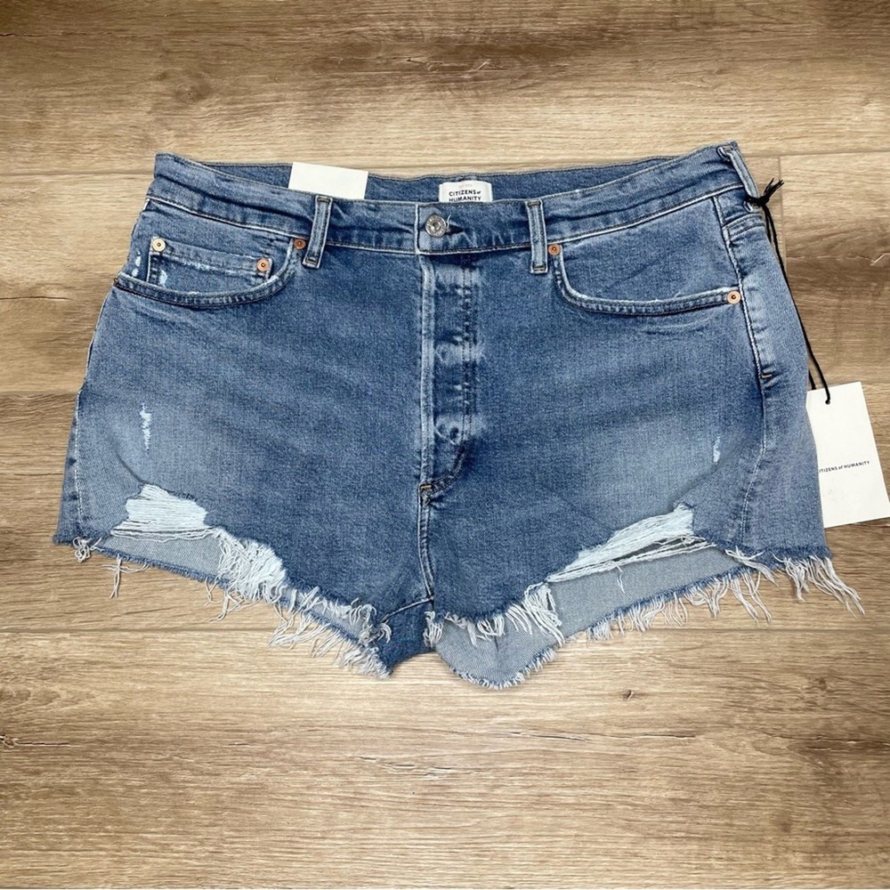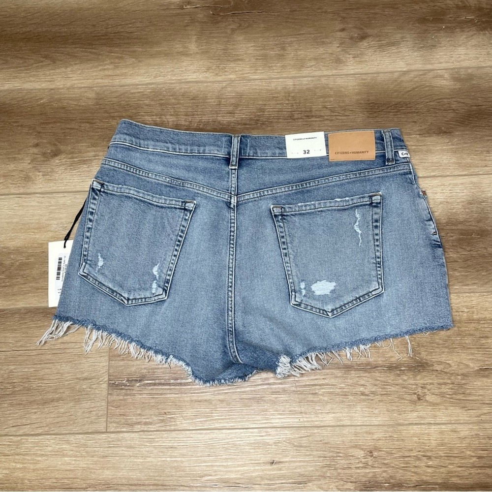 New with tags Citizens of Humanity Annabelle Vintage Relaxed Short Color: Sybil Fabric: Mid-weight, low--stretch denim Fading and whiskering Distressed holes and frayed cuffs Button fly 5-pocket styling Shell: 59% cotton/40% viscose/1% elastane Women’s Size 32 Waist: 17.5” across (flat lay) Rise: 11.5” Inseam: 2.5”