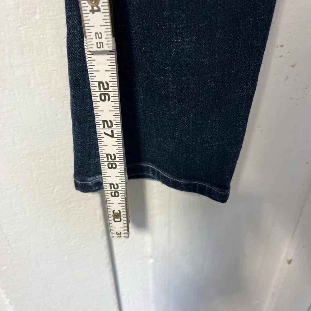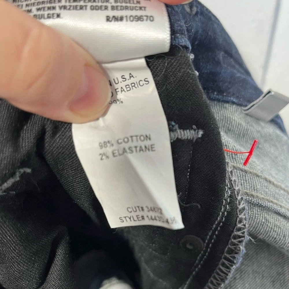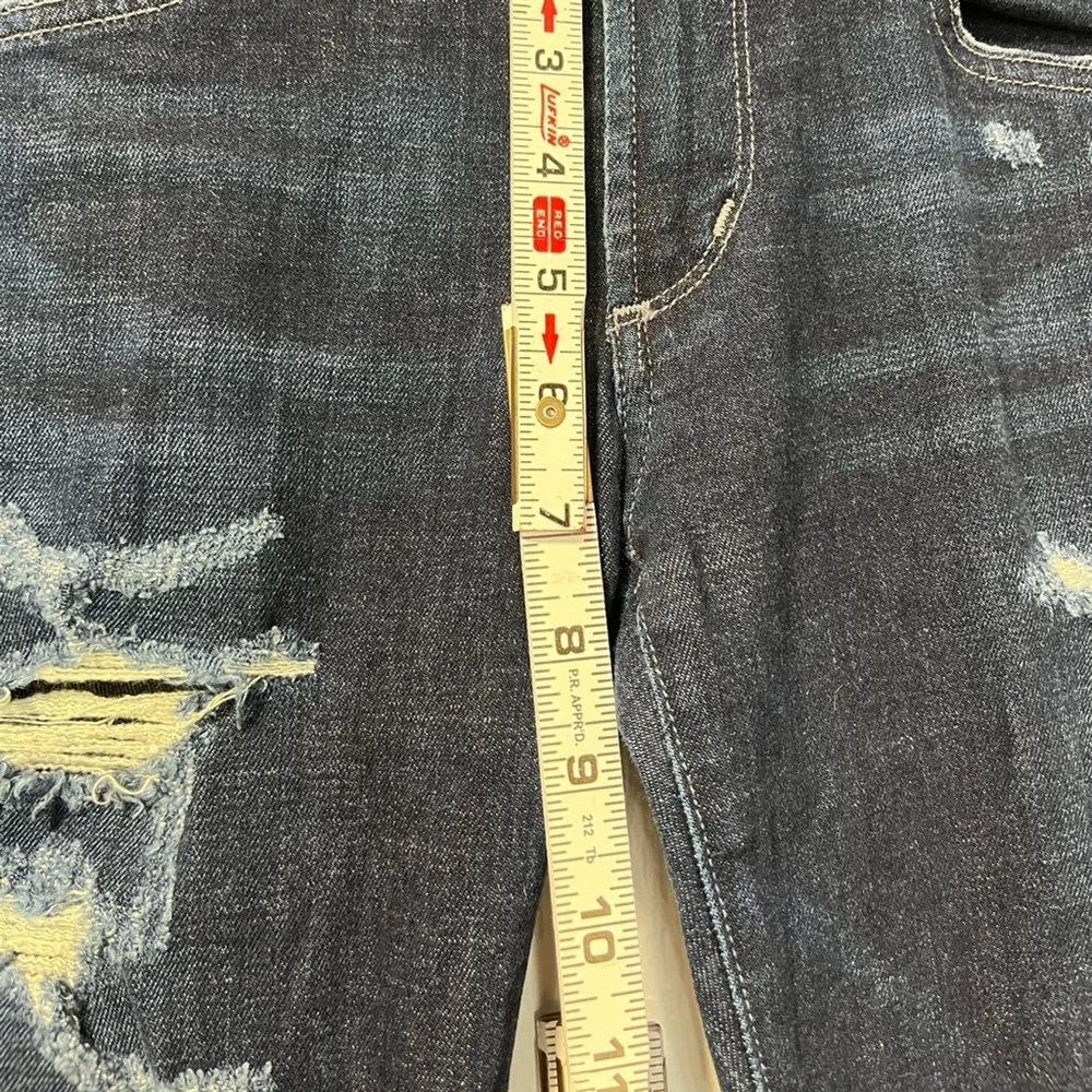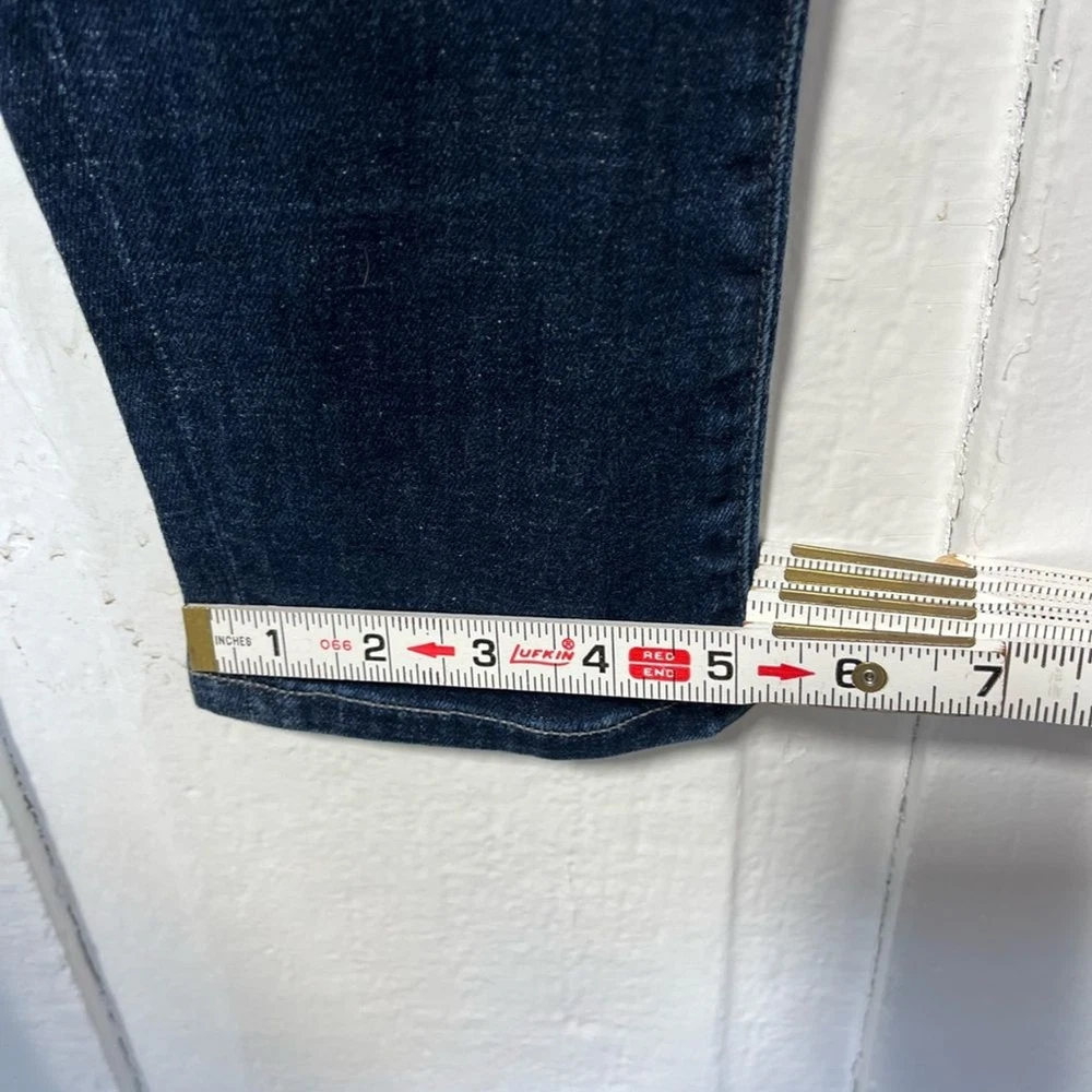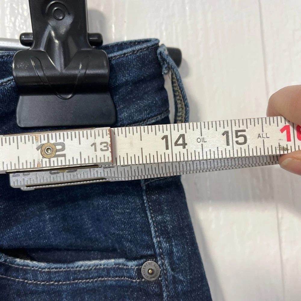 Manufacturing distressing Zipper fly with button closure Dark wash with whiskering Slim fit Good preloved condition no staining Smoke Free Dog Friendly Home Please be aware to expect a slight variation in color due to lighting and your device screen settings .