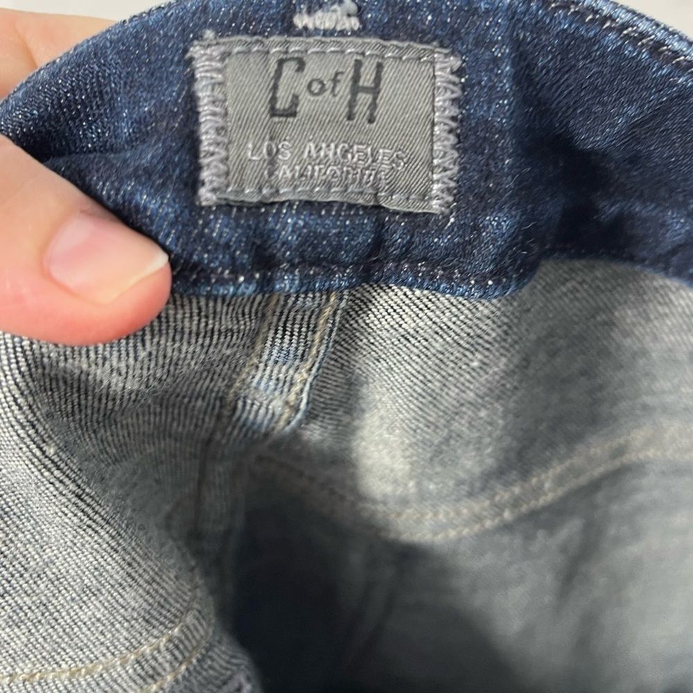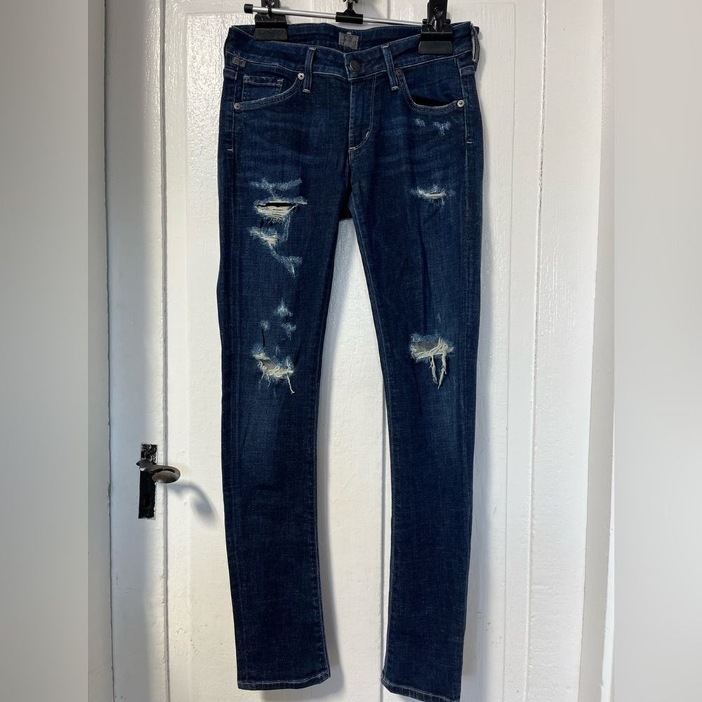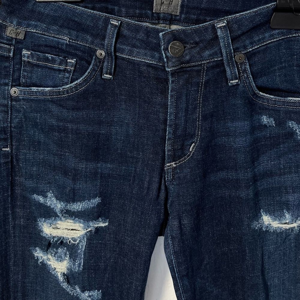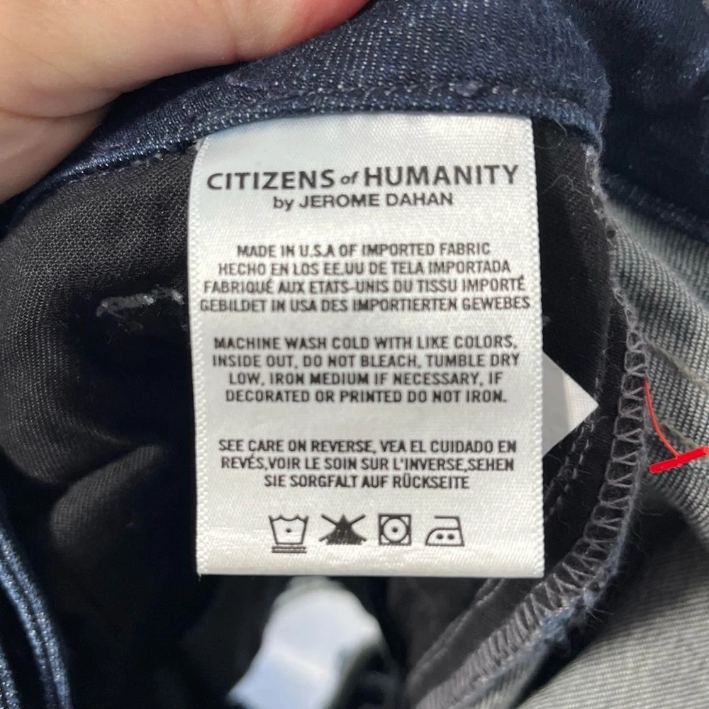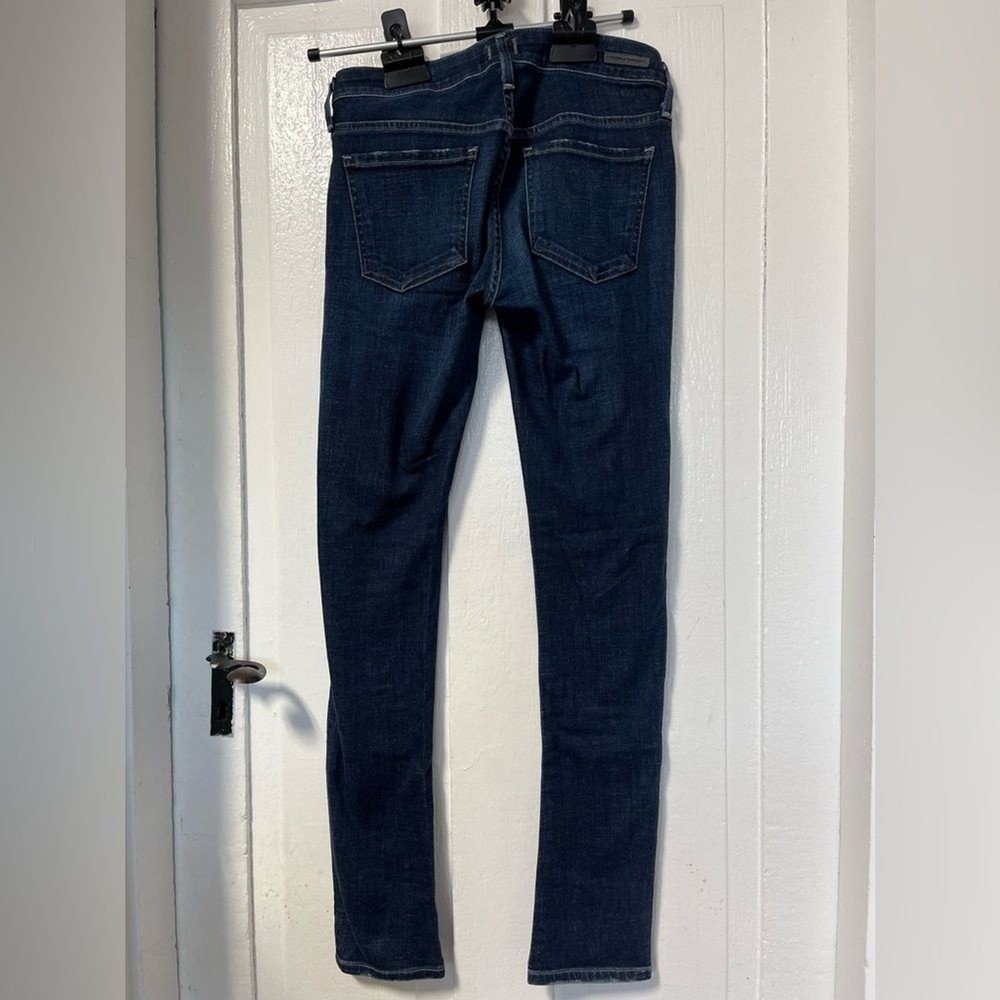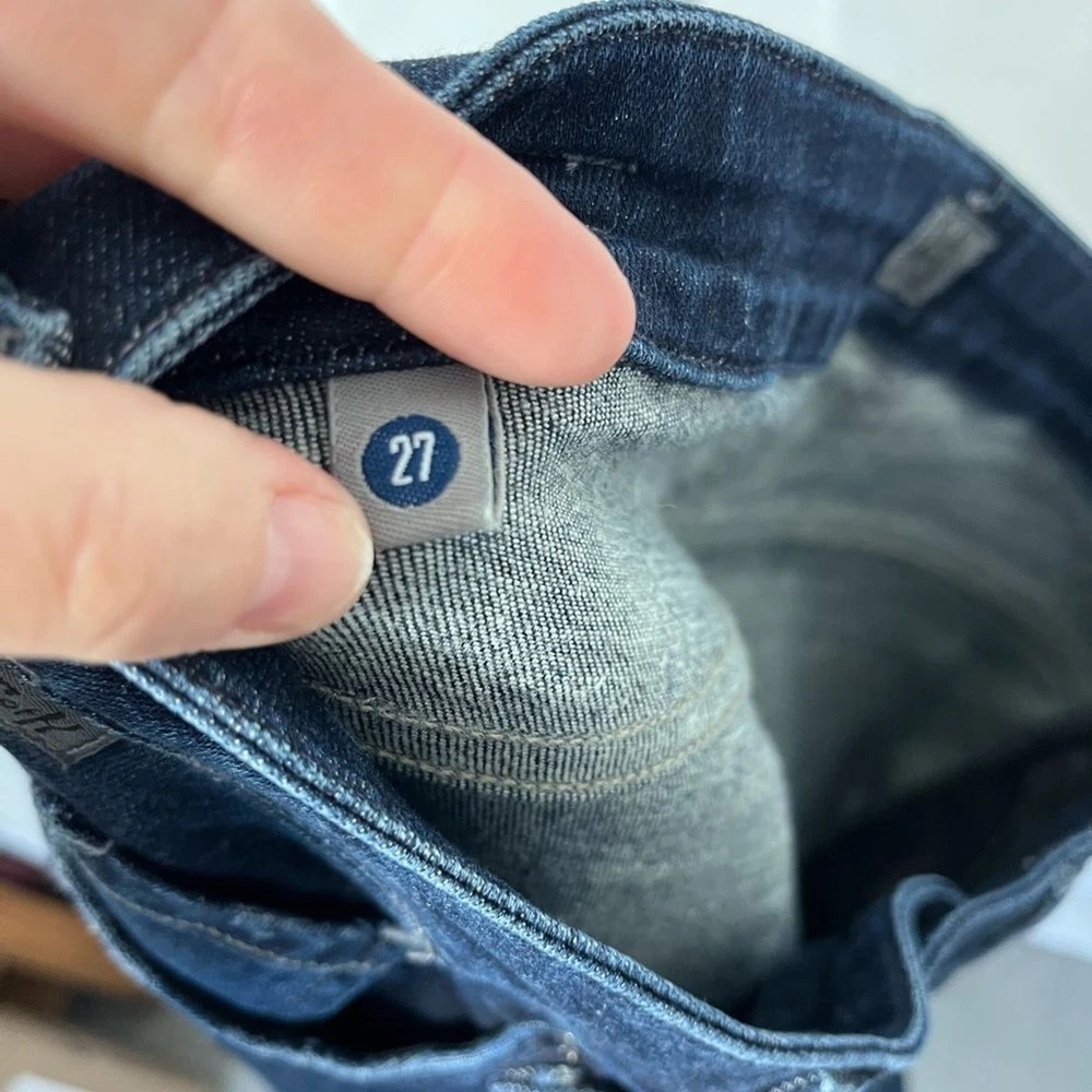 Manufacturing distressing Zipper fly with button closure Dark wash with whiskering Slim fit Good preloved condition no staining Smoke Free Dog Friendly Home Please be aware to expect a slight variation in color due to lighting and your device screen settings .