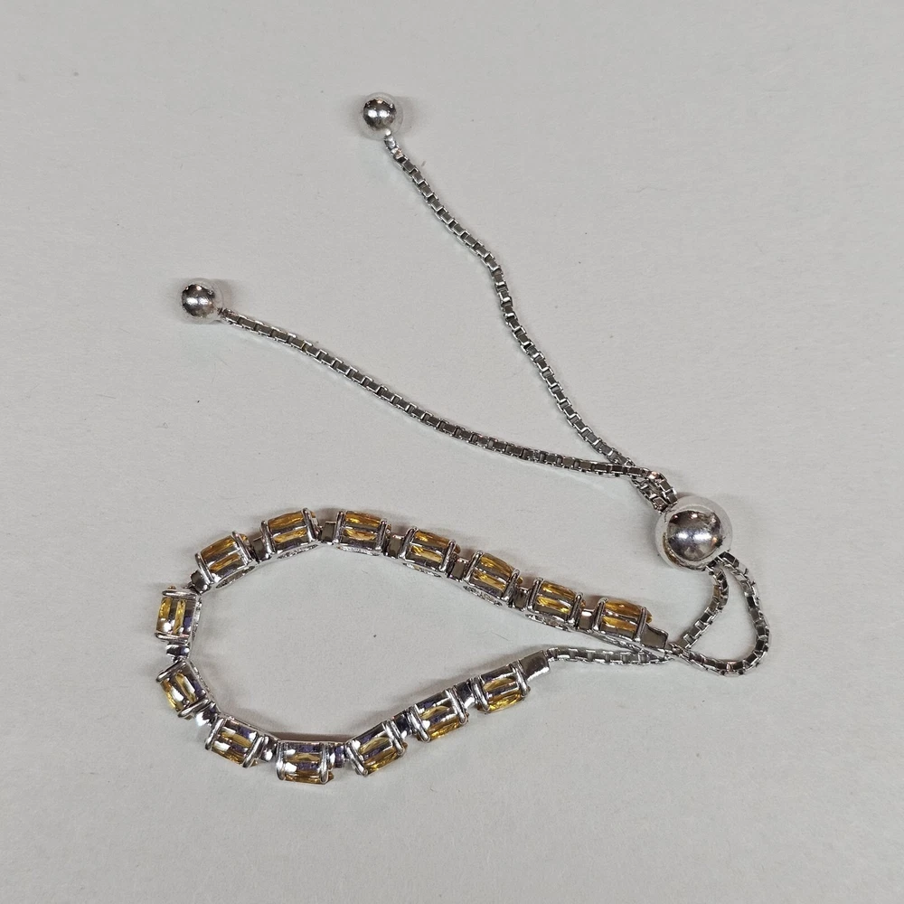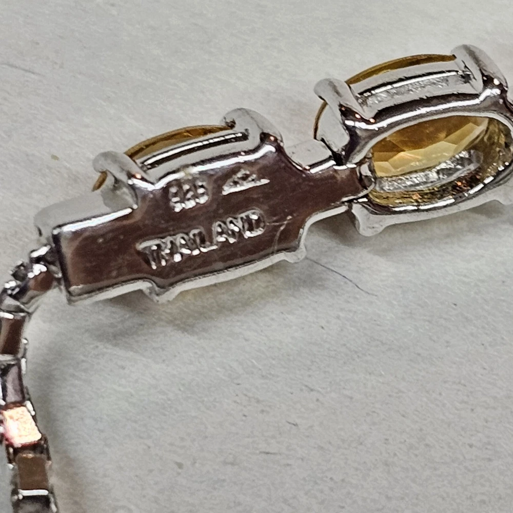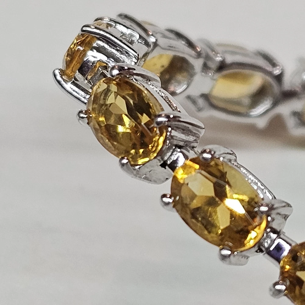 Please see all of the photos as these serve as part of the description. This beautiful bracelet features a series of oval citrine gemstones set in 925 sterling silver. The gemstones are a lovely shade of yellow and the bracelet has an adjustable chain style. The bracelet is made in Thailand. The bracelet is perfect for those who love fine jewelry and want to add a touch of elegance to their outfit. The citrine gemstones are the main attraction and are complemented by the shine of the sterling silver. This bracelet is a great addition to any jewelry collection and can be worn on any occasion.