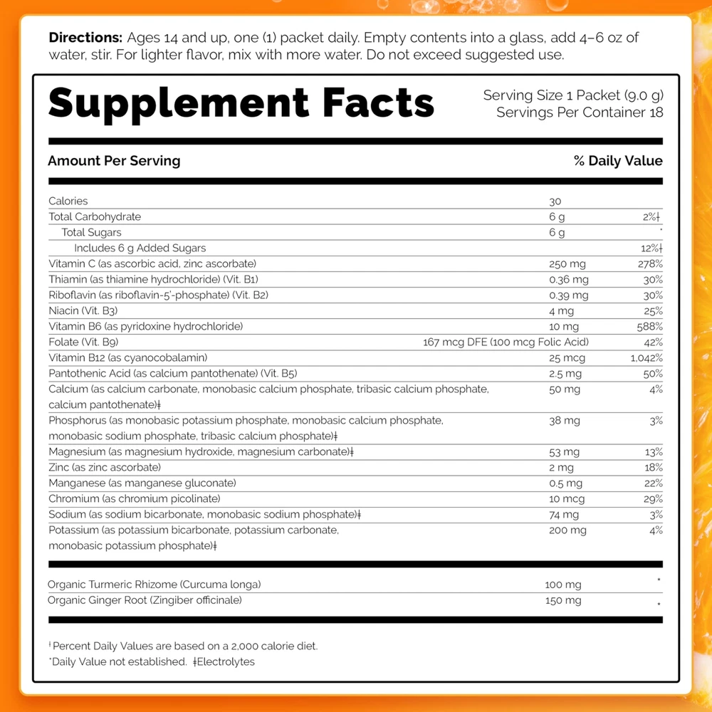 Turmeric & Ginger Immune Support Citrus-Ginger fizzy drink mix provides daily immune support infused with the natural goodness of . This great tasting Immune Support drink mix is packed with organic turmeric and ginger, natural citrus juice and fruit flavors, C, and B vitamins. These drink packets are also vegetarian, gluten-free, and caffeine-free making them the perfect addition to your holistic wellness routine and help support your immune system every day. Immune Support citrus-ginger drink mix packets are made with 100 mg of turmeric, 150 mg of real ginger, and are infused with high potency C to support your immune system. These naturally sweetened drink powders are deliciously nutritional and make the perfect fit to your holistic approach to life. They are made from real fruits and sunshine. Filled with the natural goodness of organic , these C drink powders provide the perfect start to maintaining your , supporting your immune system, and strengthening your body. Experience the power of Turmeric & Ginger Immune Support Citrus-Ginger fizzy drink mix, in a convenient pack of 18 sachets, perfect to take on the go! Turmeric & Ginger fizzy drink mix provides immune system support with the natural goodness of Crafted with organic turmeric and ginger, natural fruit flavors, this vegetarian, gluten-free and caffeine-free citrus-ginger drink is the perfect fit for holistic wellness Everyday immune support with high potency C This citrus-ginger drink mix supports your immunity with high potency C, antioxidants and Manganese, and B vitamins to naturally enhance your energy Experience the power of and the goodness of with the great tasting Citrus-Ginger fizzy drink mix, which makes immune support simple, even on the go