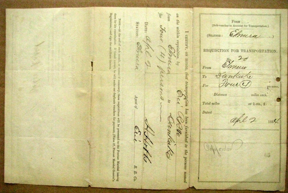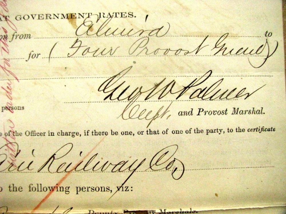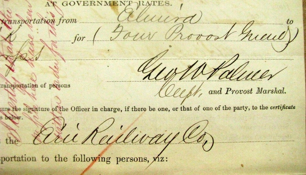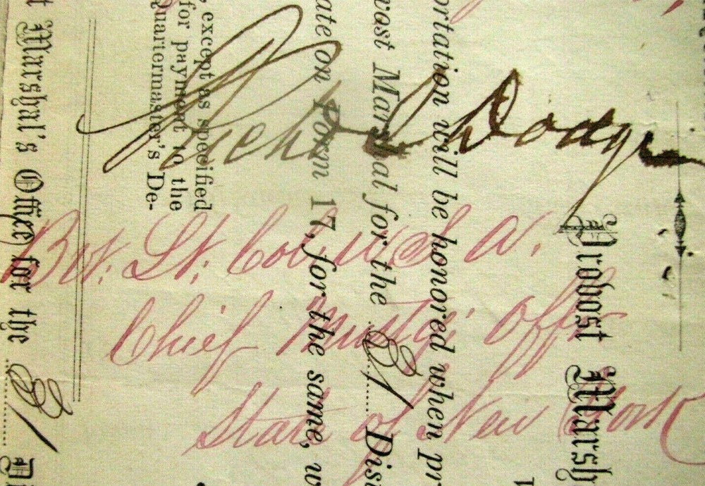 Colonel Richard Irving Dodge, of an eminent family including General Richard Dodge & Washington Irving, served 44 years in the Army. During the Civil War he commanded the 12th US Infantry, postwar he commanded Fort Dodge, Kansas, scene of his famous standoff with a Fort Dodge city Vigilante Committee described in the book "Dodge City". He was notably sympathetic to the plight of the Indians, his journals included the first published descriptions of Devils Tower and the Black Hills and The Powder River Expedition. Colonel Dodge also was author of many accounts of his life on the Frontier and among the Indians. An original Civil War Union Army Transportation Certificate for 4 Provost Guards to travel from Elmira to Dunkirk, New York on the Erie Railroad, issued March 31, 1864, signed by various officers and by Erie RR Agents at Dunkirk and Elmira, and also approved on front by Colonel Dodge, having served as Chief Mustering Officer for the State of New York,Sept 27, 1866. The 1p 8 x 14" ptd/ink Certificate is the only one I have ever encountered. The document bears a strong signature by Colonel Dodge. The item has age stain, edge wear, and reverse with archival repairs, Overall VG. Comes w service and Biographical info for Colonel Dodge. Welcome to my Ebay Auctions and Ebay Store. I am a specialist in early American Military & Historical items, especially American Civil War ephemera- letters, military & historic documents including broadsides, commissions, General Orders and other imprints. I have been collecting and selling original American Civil War & US Military memorabilia for 35 years My customers have included some of the leading names in collecting and selling American History items, as well was as a wide range of novice & advanced collectors in addition to some 30 US federal, state, public and private university & municipal museums and libraries. All items are unconditionally guaranteed to be authentic and in the condition as described. I am a longtime member of the Company of Military Historians, the New England Antique Arms Association, the Ephemera Society of America & the Civil War Veterans Historical Assn. NOTE: Any repair to a paper item is listed. I use only museum curator approved archival repair tape. I SELL ONLY ORIGINAL ITEMS, AND HAVE BEEN A PROFESSIONAL FULL TIME SELLER OF ANTIQUE HISTORICAL ITEMS SINCE 1980. PLEASE SEE MY EBAY STORE FOR OTHER LISTINGS. PLEASE READ DETAILS OF THE ITEM DESCRIPTION. I TRY TO DESCRIBE ALL ITEMS ACCURATELY U.S. SHIPPING ONLY I ship only USPS priority mail with insurance If you would like to Add Me as a Seller You Follow, Go to the Seller Information Bar on the Middle Right Side of the Page and click ‘Follow This Seller”