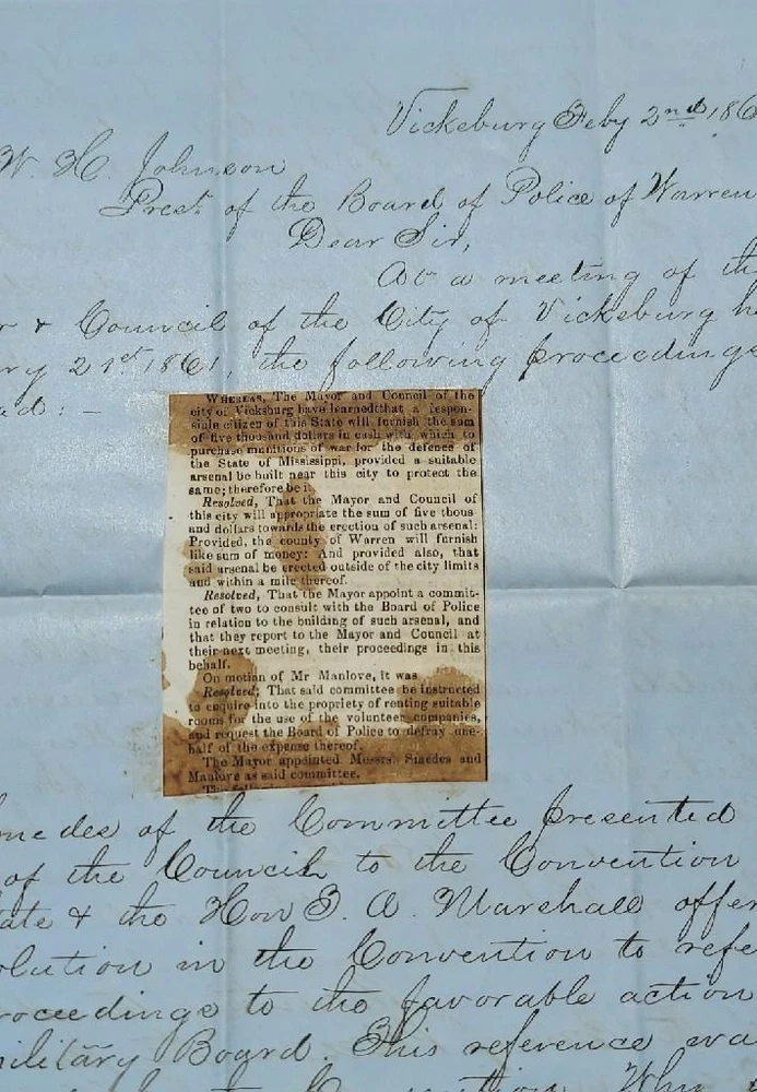 Civil War Confederate 1861 Document Vote to Create Arsenal in Vicksburg, MS