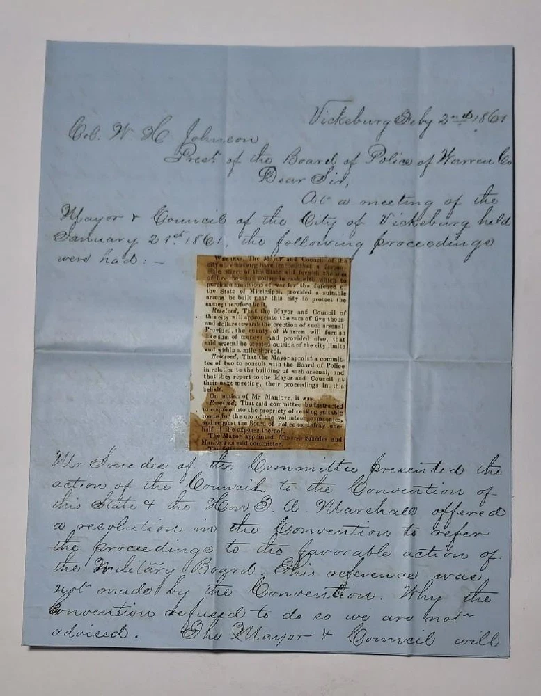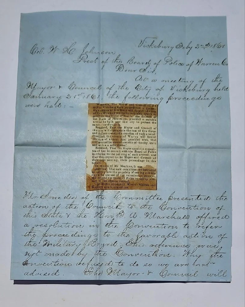 Vicksburg,Mississippi Feburary 2nd 1861 Exceedingly rare document for the city of Vicksburg,Mississippi to create an arsenal.The mayor and counsil will appropriate five thousand dollars towards an erection of such arsenal. The document is addressed to Colonel W.H.Johnson; President of the board of Police. Thomas Bolling Manlove files a motion to have rooms avilable for Volunteers. ( Thomas Bolling Manlove) Before Sharpsburg: Confederate (CSV) Captain Thomas Bolling Manlove (1842 - 1880) Home State: Mississippi Education: Western Military Institute Branch of Service: Infantry Unit: 2nd Mississippi Infantry Battalion In 1860 he lived in Vicksburg, MS, the 17 year old son of corn merchant and City Councilman Christopher Alexander Manlove (1813-1878). In April 1861 he enrolled in the "Jeff Davis Guards" in Vicksburg, and was elected First Lieutenant as they became Company G, 2nd Mississippi Battalion. He was promoted to Captain on 3 June 1861. On the Campaign He was wounded in action at Sharpsburg on 17 September 1862. The rest of the War On 3 November 1862 he was appointed Lieutenant Colonel of the 46th which quickly became the 48th Mississippi Infantry - a regiment formed by adding Companies to the 2nd Battalion. The officers and most of the men of the regiment petitioned President Davis for his promotion to the Colonelcy in January 1863, but it did not happen. He was slightly wounded at Chancellorsville, VA in May 1863 and again, by a gunshot in May 1864, and, for the fourth time, by a gunshot to his left side, and captured, at Hatcher's Run, VA on 6 or 7 February 1865. He was paroled but captured again while in a hospital in Richmond, VA, and paroled for good on 21 April 1865. After the War He was owner of the Vicksburg Times 1866-67, then, briefly, the new Evening Telegraph. He afterward practiced law in Vicksburg, was briefly an editor in Waco, Texas about 1870, and was editor of two newspapers in Jackson, MS. Document size: 7' 1/2 x 8 1/2 inches Civil War Confederate 1861 Document Vote to Create Arsenal in Vicksburg, MS Civil War Confederate 1861 Document Vote to Create Arsenal in Vicksburg, MS Click images to enlarge Description Vicksburg,Mississippi Feburary 2nd 1861 Exceedingly rare document for the city of Vicksburg,Mississippi to create an arsenal.The mayor and counsil will appropriate five thousand dollars towards an erection of such arsenal. The document is addressed to Colonel W.H.Johnson; President of the board of Police. Thomas Bolling Manlove files a motion to have rooms avilable for Volunteers. ( Thomas Bolling Manlove) Before Sharpsburg: Confederate (CSV) Captain Thomas Bolling Manlove (1842 - 1880) Home State: Mississippi Education: Western Military Institute Branch of Service: Infantry Unit: 2nd Mississippi Infantry Battalion In 1860 he lived in Vicksburg, MS, the 17 year old son of corn merchant and City Councilman Christopher Alexander Manlove (1813-1878). In April 1861 he enrolled in the "Jeff Davis Guards" in Vicksburg, and was elected First Lieutenant as they became Company G, 2nd Mississippi Battalion. He was promoted to Captain on 3 June 1861. On the Campaign He was wounded in action at Sharpsburg on 17 September 1862. The rest of the War On 3 November 1862 he was appointed Lieutenant Colonel of the 46th which quickly became the 48th Mississippi Infantry - a regiment formed by adding Companies to the 2nd Battalion. The officers and most of the men of the regiment petitioned President Davis for his promotion to the Colonelcy in January 1863, but it did not happen. He was slightly wounded at Chancellorsville, VA in May 1863 and again, by a gunshot in May 1864, and, for the fourth time, by a gunshot to his left side, and captured, at Hatcher's Run, VA on 6 or 7 February 1865. He was paroled but captured again while in a hospital in Richmond, VA, and paroled for good on 21 April 1865. After the War He was owner of the Vicksburg Times 1866-67, then, briefly, the new Evening Telegraph . He afterward practiced law in Vicksburg, was briefly an editor in Waco, Texas about 1870, and was editor of two newspapers in Jackson, MS. Document size: 7' 1/2 x 8 1/2 inches Images sell! Get Supersized Images & Free Image Hosting Create your brand with Auctiva's Customizable Templates. Attention Sellers - Get Templates Image Hosting, Scheduling at Auctiva.com. Track Page Views With Auctiva's Counter