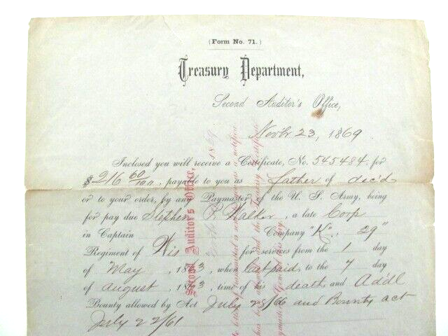 S HIPPING ONLY TO CONFIRMED ADDRESSES IN THE LOWER 48 US STATES EXCLUDING ALASKA & HAWAII *** PLEASE READ WHOLE AD BEFORE PURCHASING*** PLEASE PAY UPON COMMITMENT TO PURCHASE UP FOR YOUR PURCHASE IS A US CIVIL WAR ERA SOLDIER'S PAY VOUCHER. THE VOUCHER IS TO THE FATHER (EZRA WALKER) OF A DECEASED CORPORAL STEPHEN P WALKER OF COMPANY K, 29th REGIMENT OF WISCONSIN TROOPS. THIS ITEM WAS ACQUIRED AT A HIGH END ESTATE SALE CONTAINING AN EXTENSIVE QUALITY MILITARY COLLECTION OF ITEMS FROM THE CIVIL WAR THROUGH THE VIET NAM WAR. VIEW THE PHOTOS, FEEL FREE TO ASK ANY QUESTIONS, AND BUY WITH CONFIDENCE. SHIPPING TO THE 48 CONTINENTAL US STATES VIEW THE PHOTOS, ASK ANY QUESTIONS, AND BUY WITH CONFIDENCE. FROM A SMOKE FREE-PET FREE HOME Selling and shipping only to the 48 LOWER U. S. STATES, excluding Alaska and Hawaii AND APO/FPO/DPO Thank you for viewing