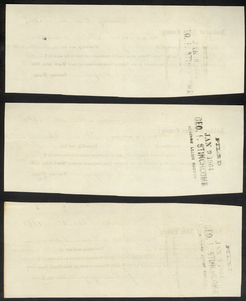 Civil War Widow’s 6 Piece Document Group - Perry, Allen County, Indiana Offered for your consideration is a small group of documents relating to county payments for a woman whose husband died in the service. Five of these documents are partly-printed, while one is fully manuscript. The earliest dated pieces are three small receipts, each issued by “ Perry Township ” on the 10 th day of “ Oct. ”, “ Nov. ”, “ Dec. ”, in “ 1863 ”. These documents are addressed to the “ Auditor of Allen County ” and states that “ This is to certify that Mira Spencer is a destitute person; - a resident of Perry Township, and has a husband Buried in the United States army, and is therefore entitled to the sum of $ 6.00 per month as temporary relief, as ordered by the County Commissioners at their March term, 1863. ”. These are signed at the conclusion by “ J. Hillegass ” in his capacity as “ Township Trustee. ”. A black stamp, applied to each, indicates that these pieces were “ FILED / JAN 9 1864 / GEO. F. STINCHCOMB / AUDITOR ALLEN COUNTY ”. The other two partly printed forms are generally the same in content, though their printing is slightly different. They are both addressed to the “ STATE OF INDIANA, / ALLEN COUNTY .” and state that “ Personally came before me, GEORGE F. STINCHCOMB, Auditor in and for said County, Mira Spencer , and being by me duly sworn, upon her oath deposes and says she is the Widow of Elijah Spencer who was , a Volunteer in the 88 th Regt. Indiana Volunteers and that she is the person described in the Certificate hereunto attached; and further this Deponent saith not. ”. This is followed by Mrs. Spencer’s signature, presented as “ her X mark ”, as well as the statement that the document was “ Subscribed and sworn to before me this 8 th day of January 186 4 ” (the other document is dated “ 7 day of Sept 1864 ”), with the signature of “ Geo. F. Stinchcomb ” as “ Auditor Allen County ” at the conclusion (the signatures on the documents are quite different, however). Each of the documents bears Spencer’s name on the back, as well as a filing stamp similar to those on the earlier documents (though with different dates). The final document is a manuscript note addressed “ To the Auditor of Allen County Ind ” which states that “ This is to certify that Mira Spencer is a destitude person a resident of Perry Township and has a husband Buried in the United States Army and is therefor entitled to sum of Six dollars per month as temporary relief as ordered by the Commissioners of Allen Co. Ind. ”. It is dated “ Sep the 1 st 1864 ” and is signed by “ J. Hillegass ” in his capacity as “ trustee / Perry Township ” (it appears that the document was actually penned by Hillegass). This piece also bears a black filing stamp on the back. This grouping illustrates one of the more poignant aspects of the war – the women who were left behind to fend for themselves and their families, while their husbands were away at the front. Sadly, many of these men never returned, forcing their families to depend on the generosity of others, including local government agencies. Sometimes that was enough, most of the time it was not. An interesting group of documents. Worthy of further research. Each of the presently offered documents exhibits signs of expected period use, followed by years of less than ideal storage. Toning is noted on all of the pieces, generally darker at the edges and along the storage folds. The smaller pieces display folds at the corners, while the larger items have two storage folds near the center. Some of these folds have affected the integrity of the paper, with minor separations noted at the edges (these could be strengthened with archival tape if desired). The edges on the smaller items are irregular, especially the manuscript piece (the top and bottom are ragged, with small pieces being missing, as well), while those of the bigger pieces appear straight as made. The contrast is average for the period, though some of the printed material is light and difficult to read. The smaller items measure approximately 3 x 7⅝ inches, the manuscript piece measures approximately 4¾ x 7 inches, while the largest pieces are approximately 8 x 9⅞ inches. An interesting group to display with related home-front material, or as a research project for the local historian. A $5.95 charge will be added to the winning bid for postage and insurance. A $5.00 charge will be added to any item picked up in person at our physical location. If you have any questions regarding this item, please ask before bidding. Buy or Bid with Confidence – American Coins & Collectibles President Richie Self has worked 6 years as a paper money grader/authenticator. He has contributed to numerous reference books within the industry, as well as being a co-author of “The Comprehensive Catalog and History of Confederate Bonds, 2 nd Edition” with Douglas B. Ball, Ph.D., Henry F. Simmons, M.D., Ph.D. and James R. Desabaye. Mr. Self is a life member of the American Numismatic Association, the Society of Paper Money Collectors, as well as numerous regional numismatic associations. He is an authorized submitter to NGC, PCGS, and PMG, a diamond founding member of Coin Dealers Helping Coin Dealers and a supporter of the Industry Council for Tangible Assets. American Coins and Collectibles can be found at many of the state and local coin shows. American Coins and Collectibles Shreveport, LA