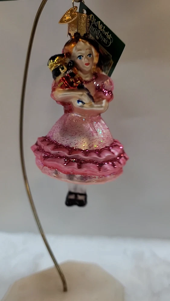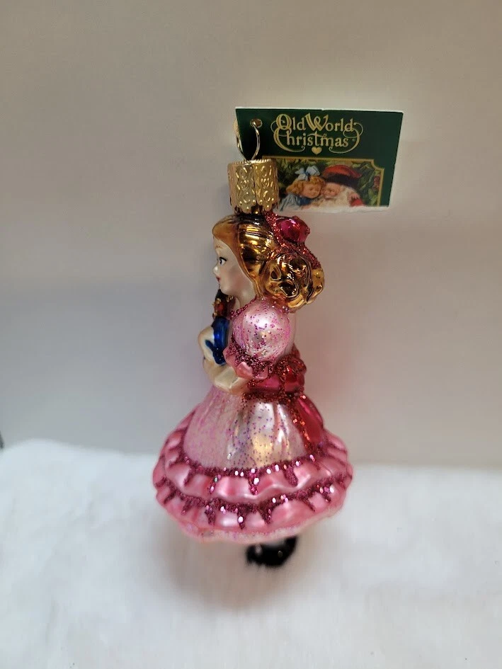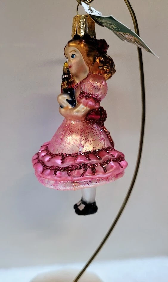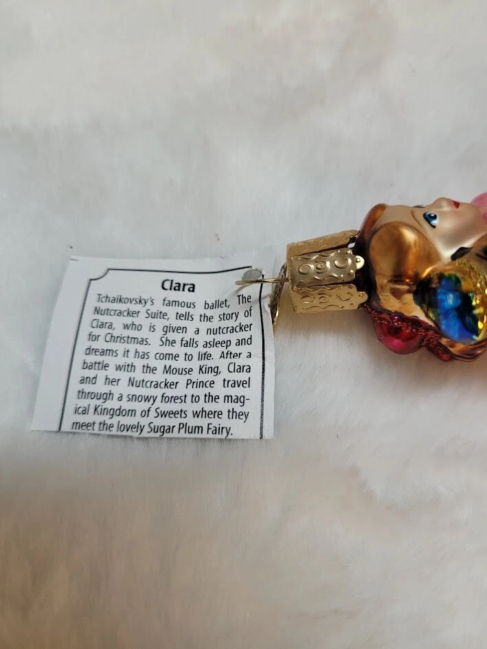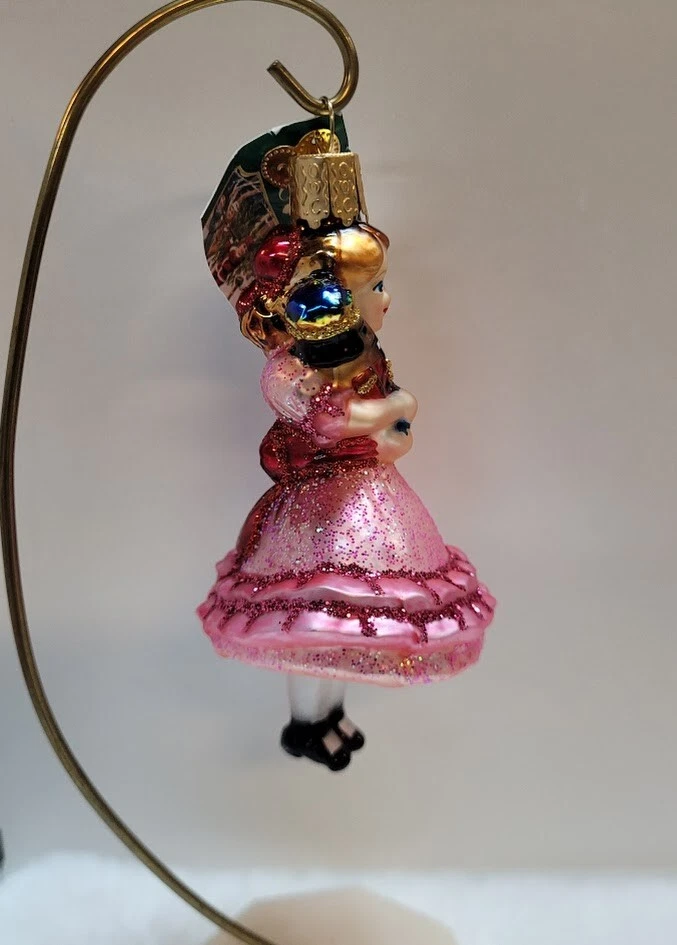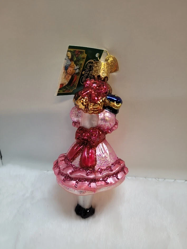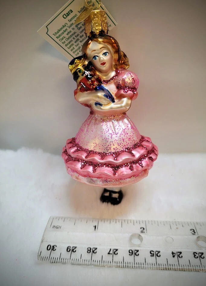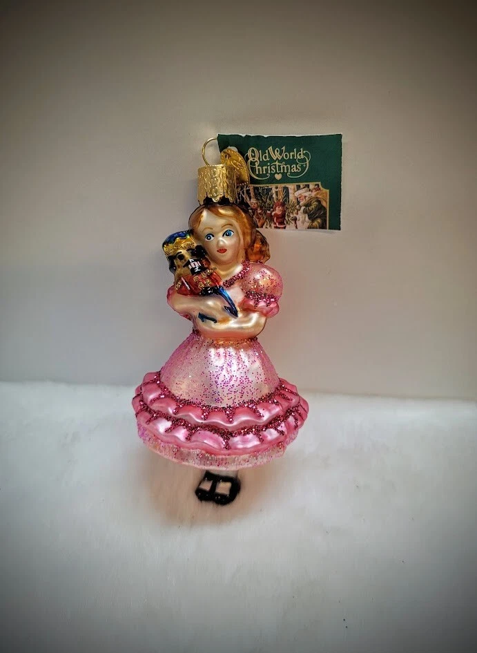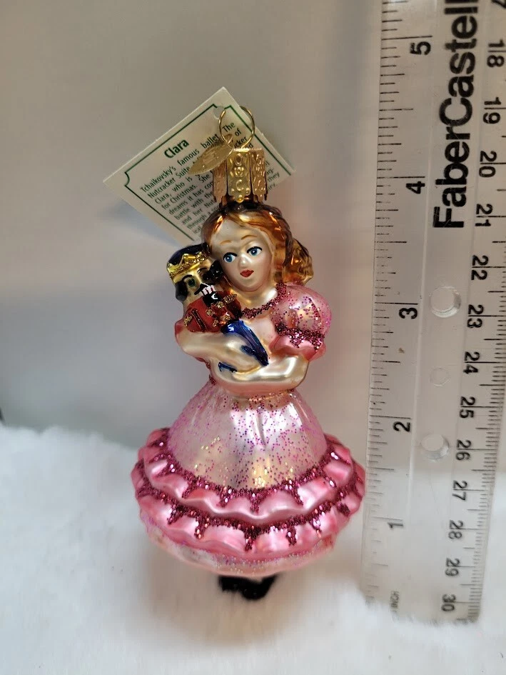 Crafted with meticulous attention to detail, Clara from the Old World Christmas Nutcracker Suite Ornament collection captures the charm and essence of the holiday season. This hand-blown glass piece, adorned with delicate glitter accents, captures the essence of the classic Nutcracker Ballet in a beautiful pink hue. Measuring 4.5 inches in height and 2.25 inches wide, it's the perfect size to complement your festive decor. Part of the esteemed Old World Christmas collection, Clara is holding her beloved Nutcracker and embodies the spirit of Christmas. Each ornament from the Old World Christmas collection is a testament to craftsmanship, with every ornament handcrafted to ensure it is unique. Whether it's a gorgeous gift for a special ballerina or as an extra special touch to your own Christmas tree, this ornament is a treasure that reflects the warmth of the holiday spirit. Approximate size: 4.5" tall x 2.25" wide x 2" deep Because each item is individually handmade and due to variances in camera and computer monitor settings, appearance may vary slightly from photograph. Due to fragile nature of this glass ornament, it is recommended for age 14 years and older. Please note that only one (1) ornament is included in sale price; any other items shown such as an ornament hanger are intended for display purposes only and are not included with purchase. From a non-smoking and pet free location. Thanks for shopping with us! We appreciate your support of our small business.