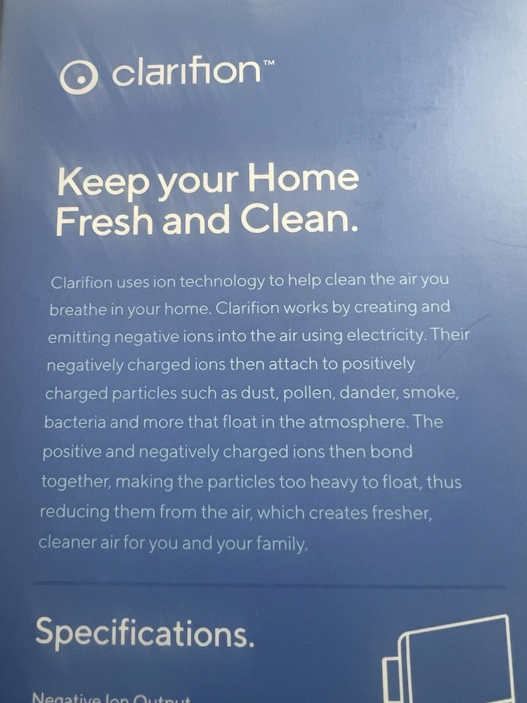 Model: ion clarifion GL-139 Country/Region of Manufacture: China Features: Abrasion Resistant, Portable, Quiet Operation Color: White Voltage: 120 V Brand: clarifion Application: Whole House, Whole Room Mounting: Wall Number of Cleaning Stages: 3 Filtration Technology: Electrostatic, Ionizer Year Manufactured: 2000 Control Style: Analog/Mechanical Timer Control: Timerless Material: Plastic Type: Plug-In Power Source: Electrical Smart Home Compatibility: ADT Pulse