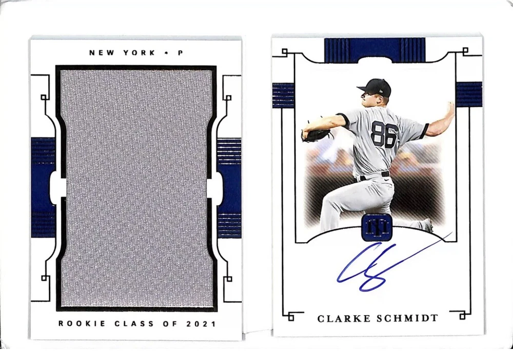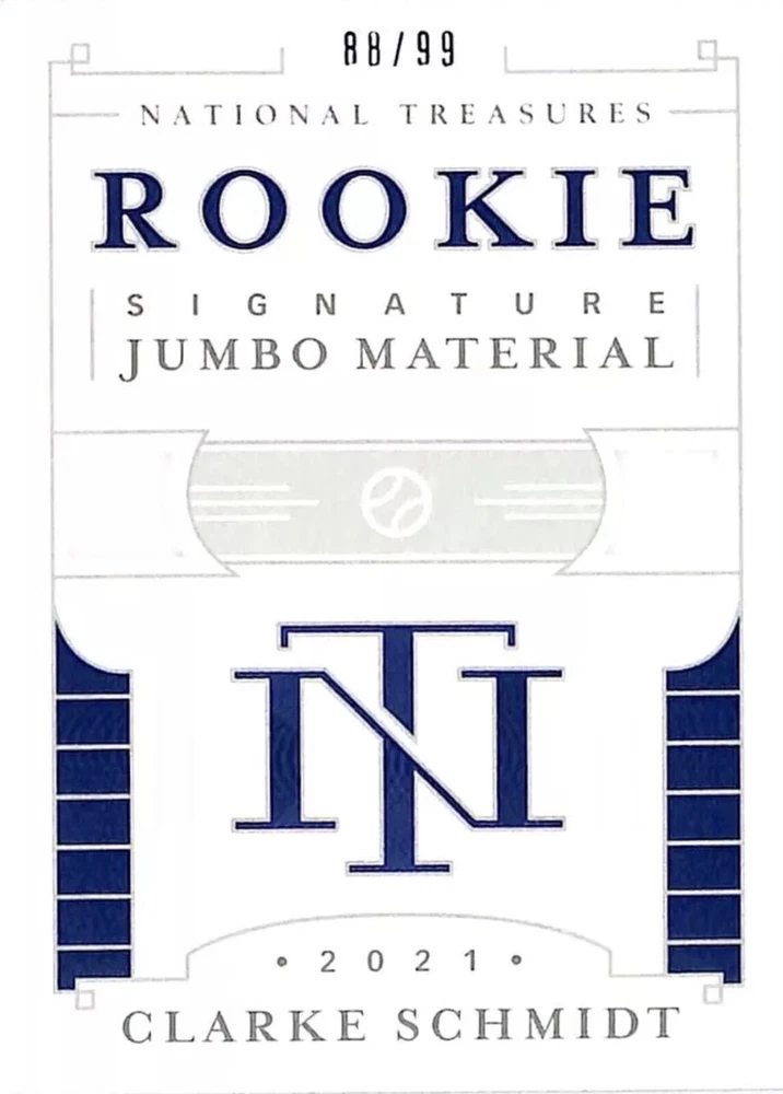 A Clarke Schmidt rookie sports trading card featuring an autograph and jumbo patch from the New York Yankees. This limited edition card is numbered #88 out of 99 and includes memorabilia. It is a valuable collectible for fans of baseball and the New York Yankees.