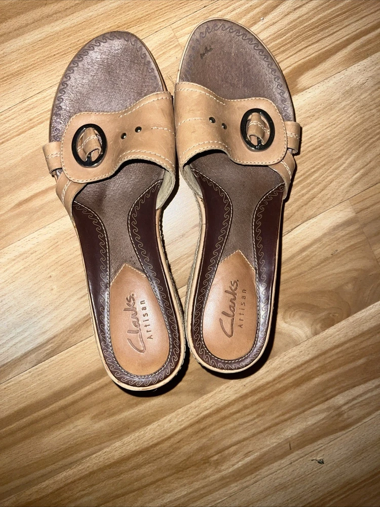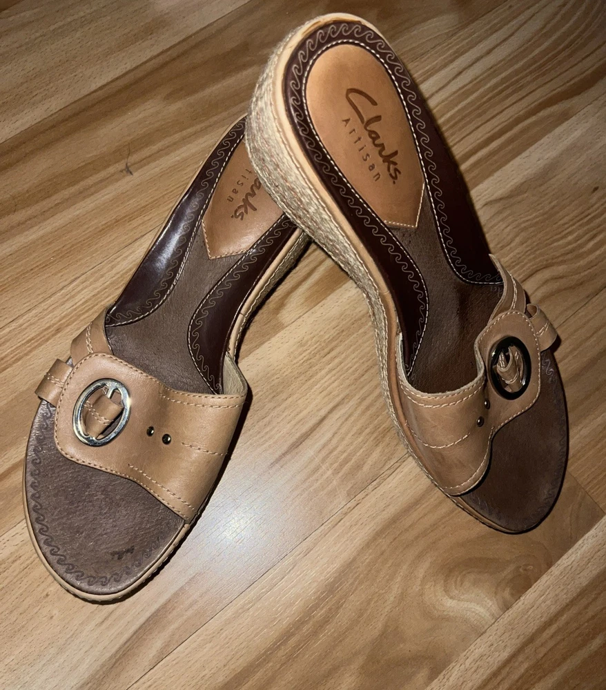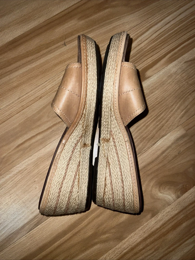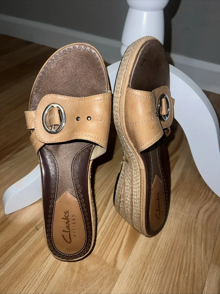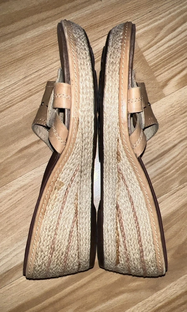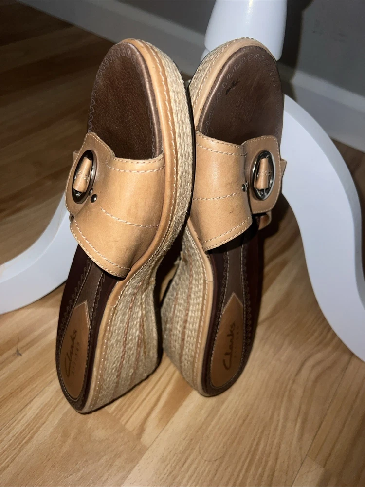 These Clarks Artisan Slip On Leather Wrap Around Rope Wedge Sandals in Women's Size 8 are perfect for casual occasions during the summer and spring seasons. With a solid beige color, leather lining and upper material, these sandals feature a mid-height wedge heel and a slip-on style for ease and comfort. The leather wrap around rope detail adds a unique and stylish touch to the design, making them a versatile and fashionable choice for any woman's wardrobe. Preowned. In very good used condition. Please see pictures thoroughly and up close. Thank you for looking!