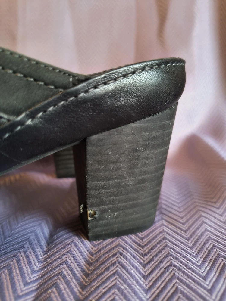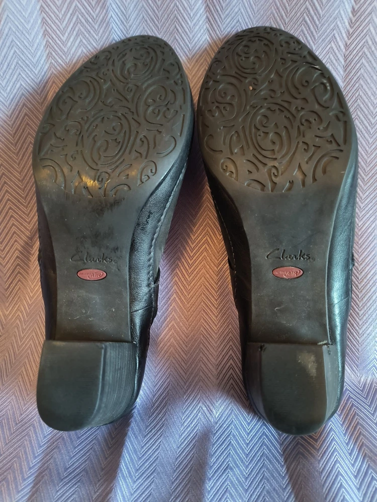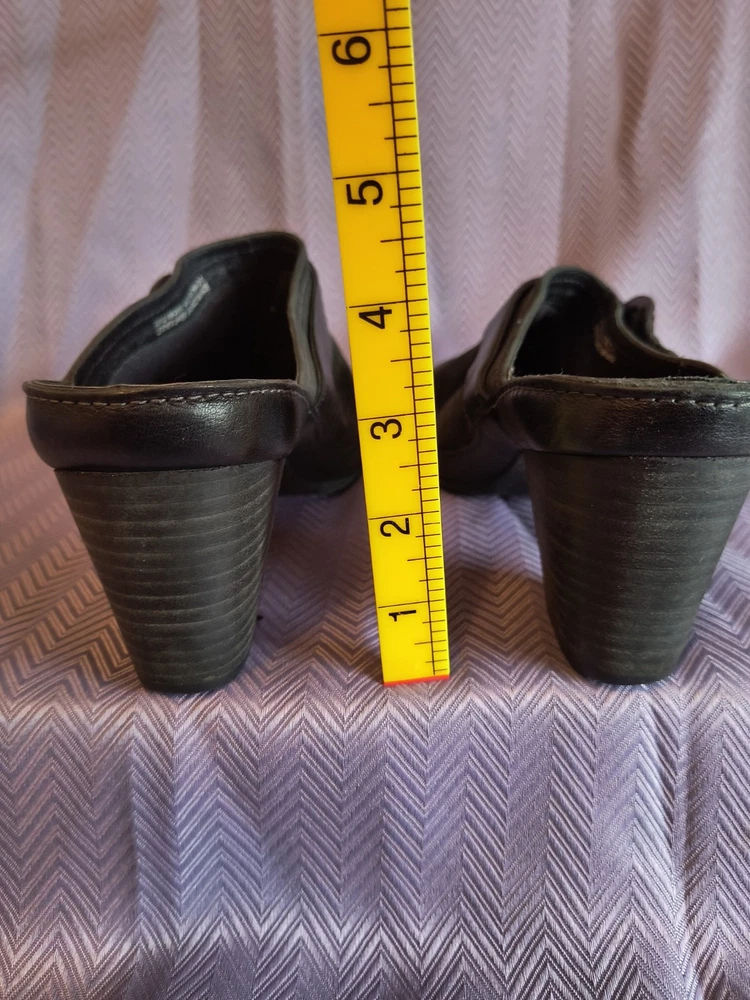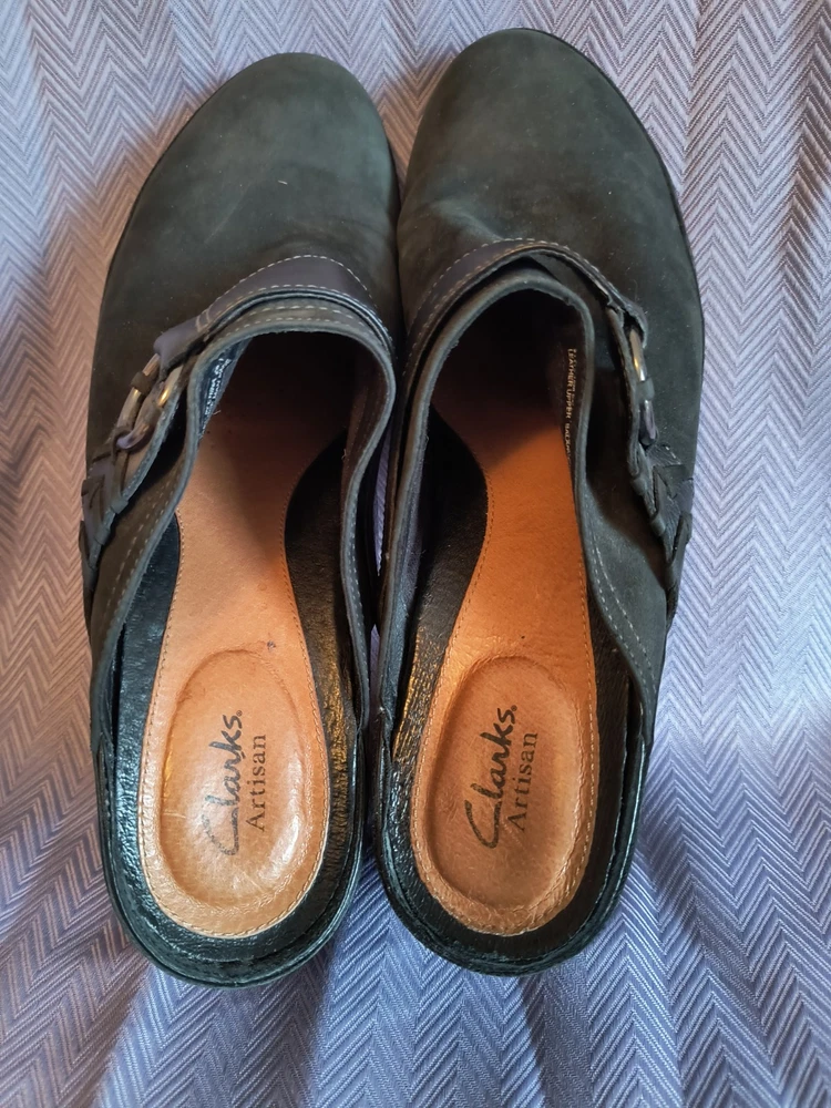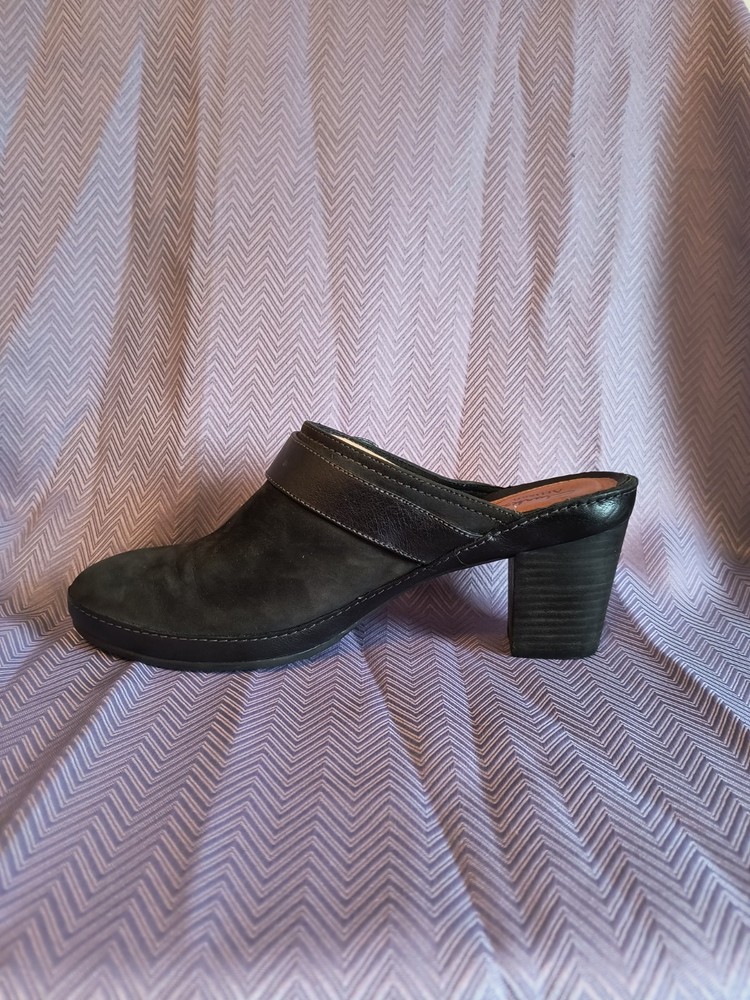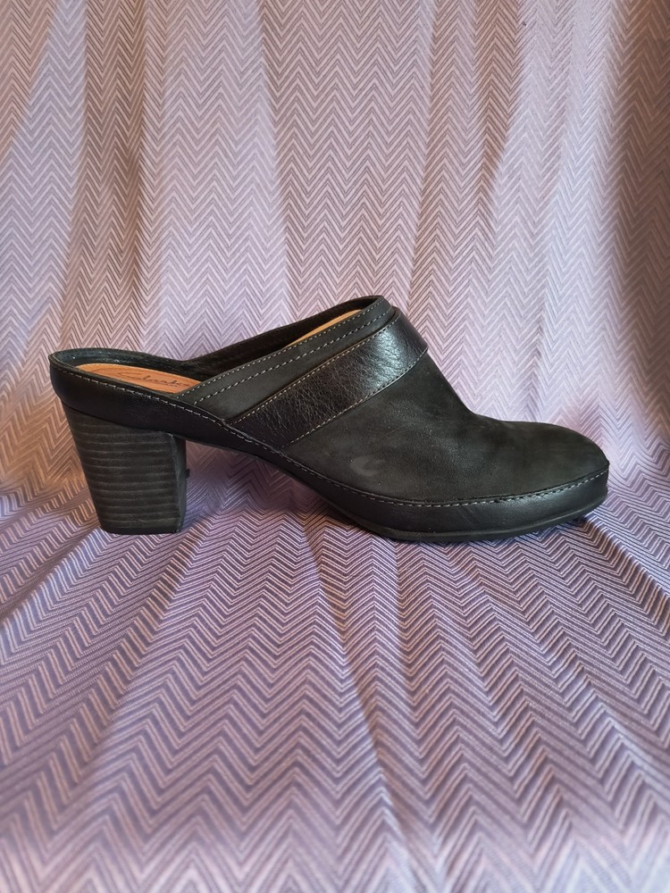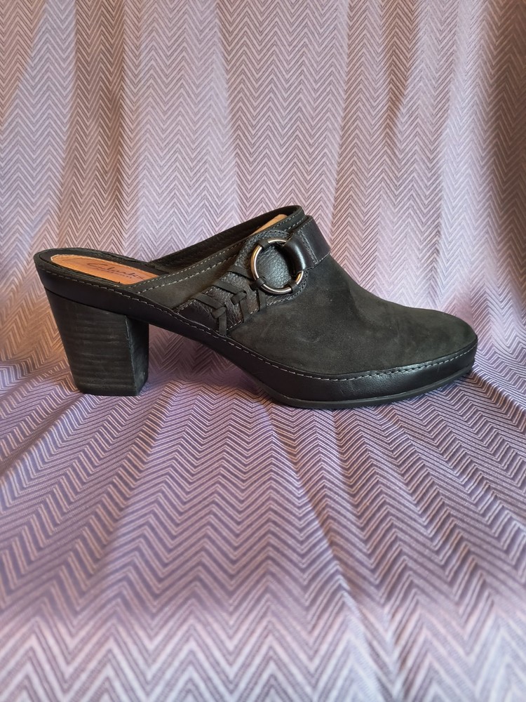 Lining Material: Leather Product Line: Clarks Artisan Customized: No Style: Mule Theme: Preppy, Classic Features: Breathable, Comfort, peeling on heel Insole Material: Leather Pattern: Solid Accents: Buckle, Strap Department: Women US Shoe Size: 10 Upper Material: Leather Heel Height: High (3-3.9 in) Heel Style: Block Outsole Material: Leather Brand: Clarks Toe Shape: Round Toe Color: Black Closure: Slip On Vintage: No Type: Heel