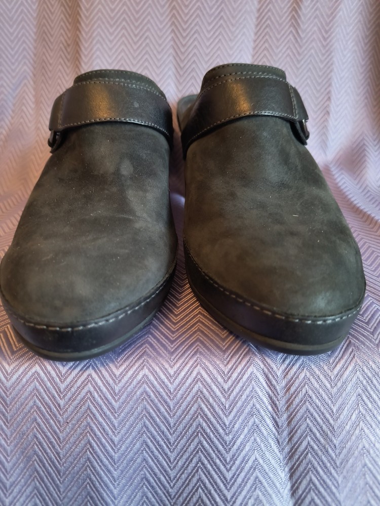 These Clarks Artisan women's clogs feature a round toe, slip-on closure, black leather upper with strap and buckle accents, and a block heel. The heels have a high heel height and a solid pattern. They are stylish mules with a classic and preppy theme, providing comfort and breathability. The outsole and insole are made of leather, offering a quality finish to these size 10 heels. There is peeling on the heel see photo. Item is used and therefore shows signs of wear. See photos for any details, measurements and condition or flaws. Highly suggest that you clean the item before the first use to cleanse any spots or stains.