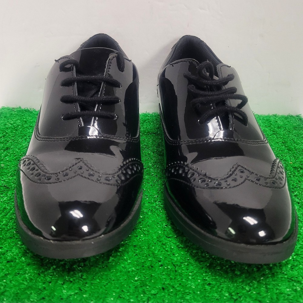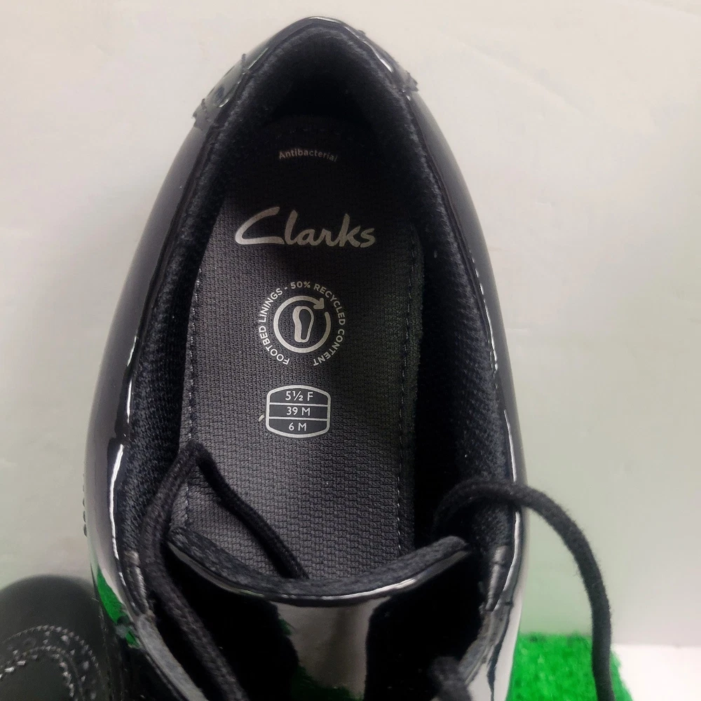 The Clarks Aubrie Tap Y Black Patent Leather School Shoe in size 6M is a stylish and versatile Oxford dress shoe for kids. With an almond toe shape and lace-up closure, it is perfect for various occasions such as travel, activewear, parties, weddings, casual outings, formal events, workwear, and business meetings. Made of cushioned and comfortable leather with a rubber outsole, this shoe is suitable for all seasons and features a block heel style. The black color and classic Oxford style make it a timeless choice for any young wearer looking for both style and performance in their footwear.