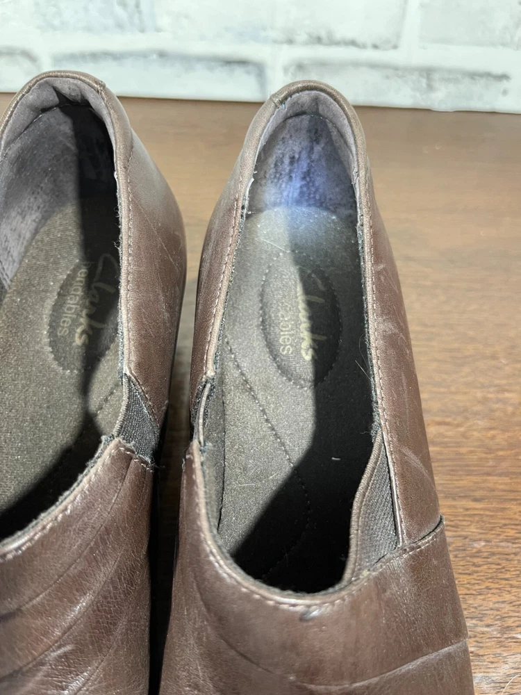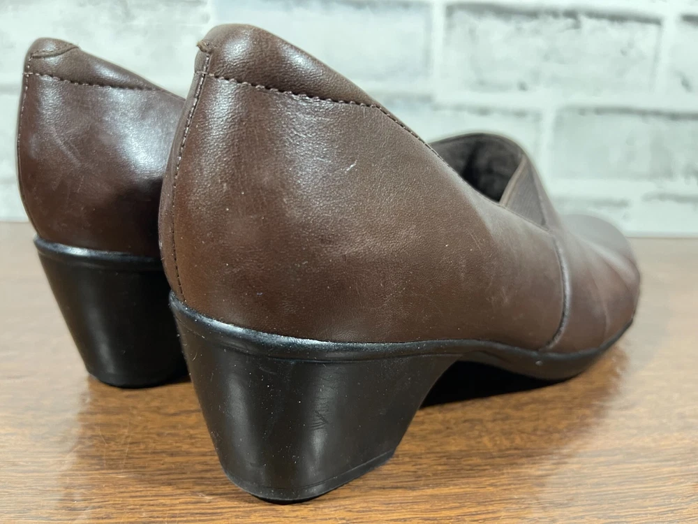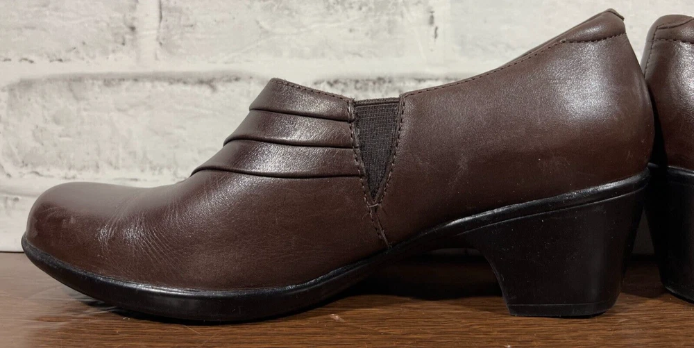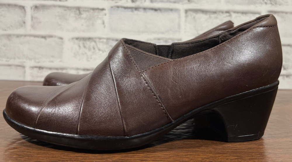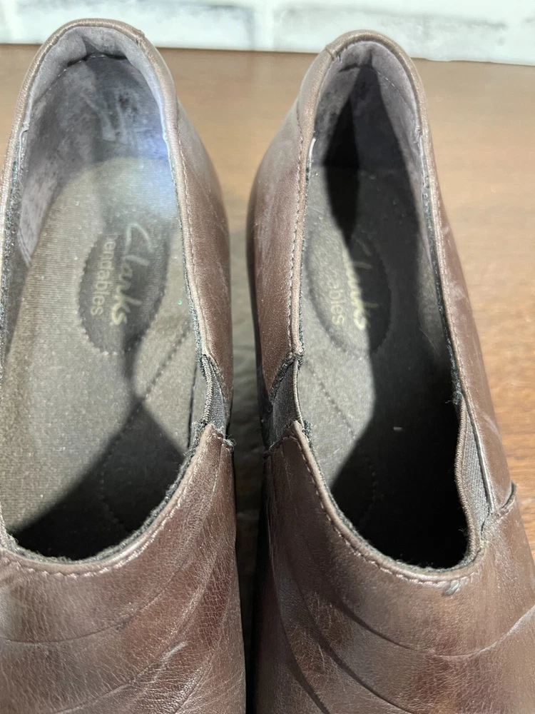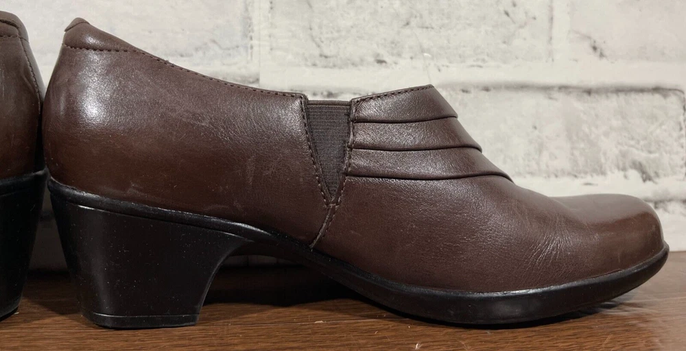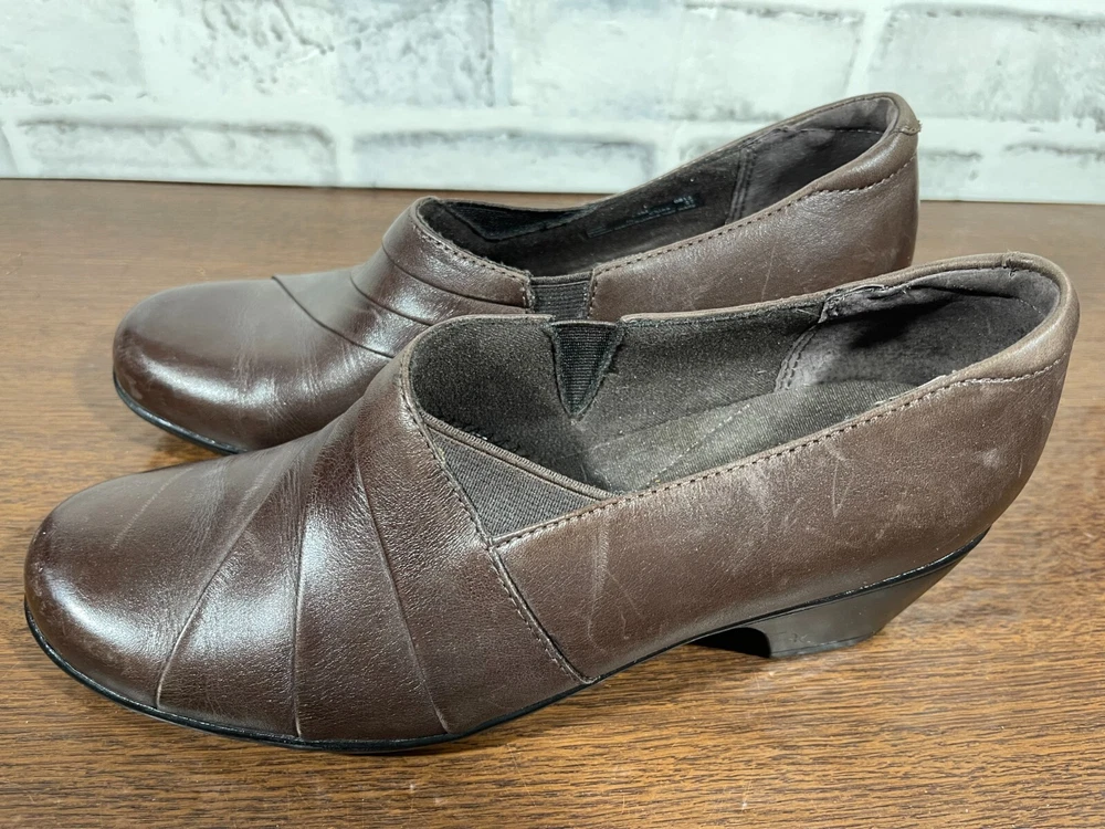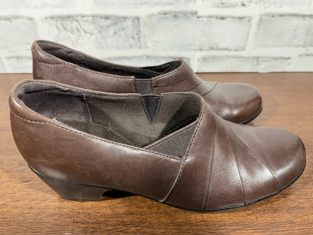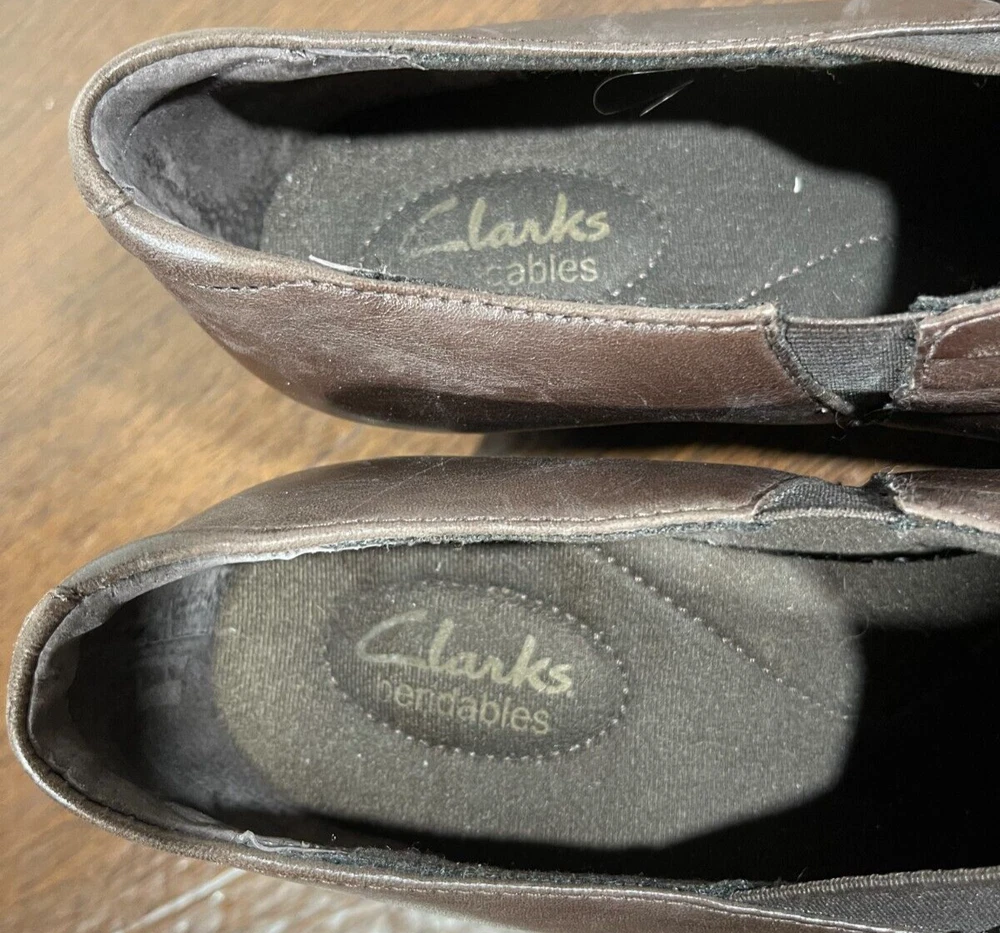These are Clarks Bendables 63007 slip-on shoes in brown leather, designed for women in US size 7.5 with a round toe shape and mid heel height. They are suitable for travel, casual wear, and work settings. The shoes feature a comfortable foam insole, breathable microfiber fabric lining, and a durable rubber outsole. The style is a classic yet modern slip-on with a block heel, making them versatile for all seasons. Very good preowned condition with normal preowned wear. Please see all photos. For clothing specifically, see photos for all measurements and/or any issues if applicable. Pay close attention to the measurements as the size of the garment may quite possibly be different than the actual measurement(s) due to washing, shrinkage, or stretching as these are used clothes. The size in the title is the size on the tag of the garment. See photos for measurements of actual measurements as they may differ. ALWAYS CHECK THE MEASUREMENTS IN THE PHOTOS. This will remove any questions on measurements as well as always cover the possibility of human error in the listing(s) in the case of a typo or oversight. All clothing and shoes have been washed/cleaned, and comes from a smoke free environment. If shoe trees appear in the photos, they are for photography purposes only to illustrate how the shoes look filled out, and are not included. I am available for questions. I accept or negotiate reasonable offers. Have an amazing day. Thank you.