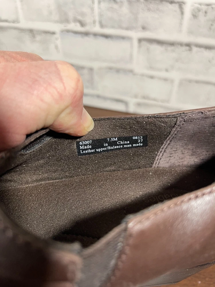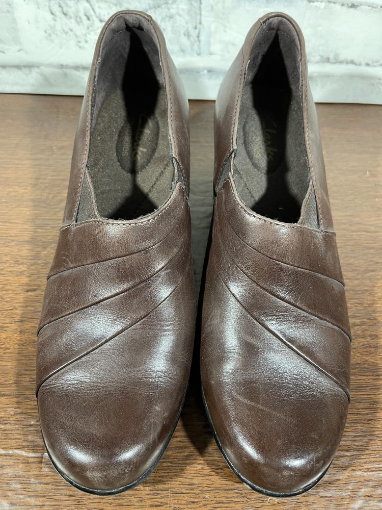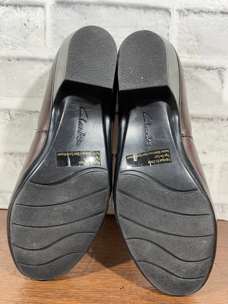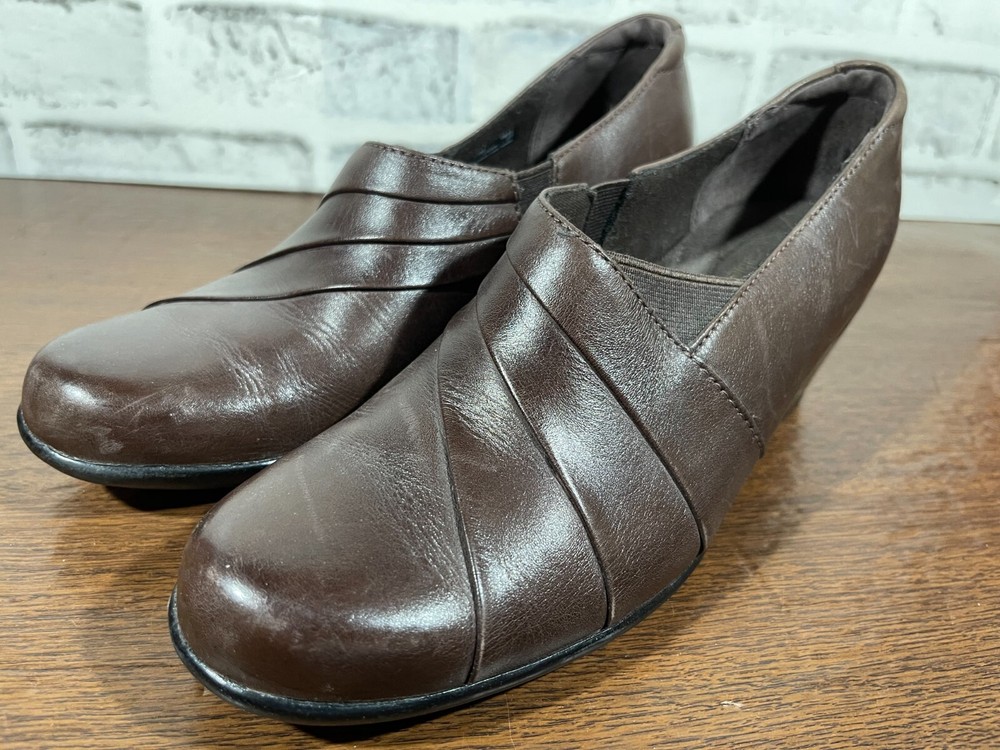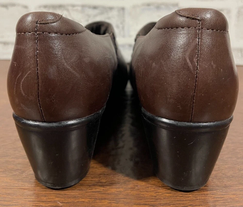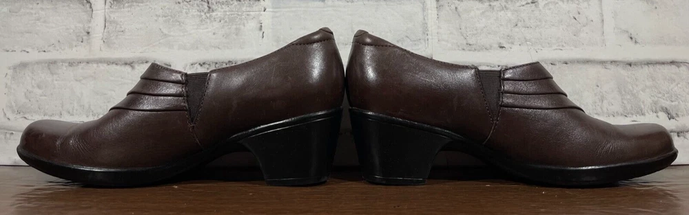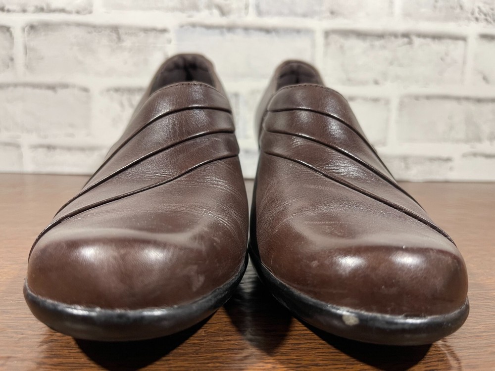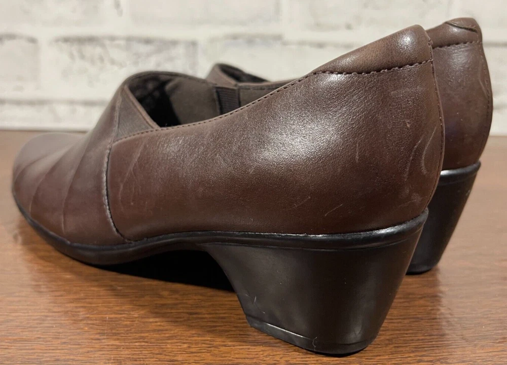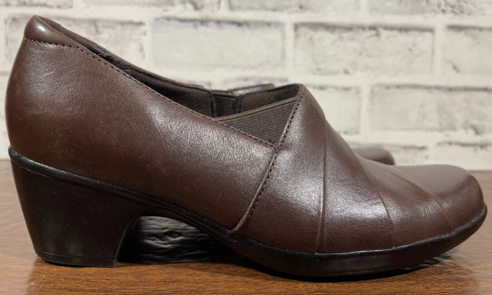These are Clarks Bendables 63007 slip-on shoes in brown leather, designed for women in US size 7.5 with a round toe shape and mid heel height. They are suitable for travel, casual wear, and work settings. The shoes feature a comfortable foam insole, breathable microfiber fabric lining, and a durable rubber outsole. The style is a classic yet modern slip-on with a block heel, making them versatile for all seasons. Very good preowned condition with normal preowned wear. Please see all photos. For clothing specifically, see photos for all measurements and/or any issues if applicable. Pay close attention to the measurements as the size of the garment may quite possibly be different than the actual measurement(s) due to washing, shrinkage, or stretching as these are used clothes. The size in the title is the size on the tag of the garment. See photos for measurements of actual measurements as they may differ. ALWAYS CHECK THE MEASUREMENTS IN THE PHOTOS. This will remove any questions on measurements as well as always cover the possibility of human error in the listing(s) in the case of a typo or oversight. All clothing and shoes have been washed/cleaned, and comes from a smoke free environment. If shoe trees appear in the photos, they are for photography purposes only to illustrate how the shoes look filled out, and are not included. I am available for questions. I accept or negotiate reasonable offers. Have an amazing day. Thank you.