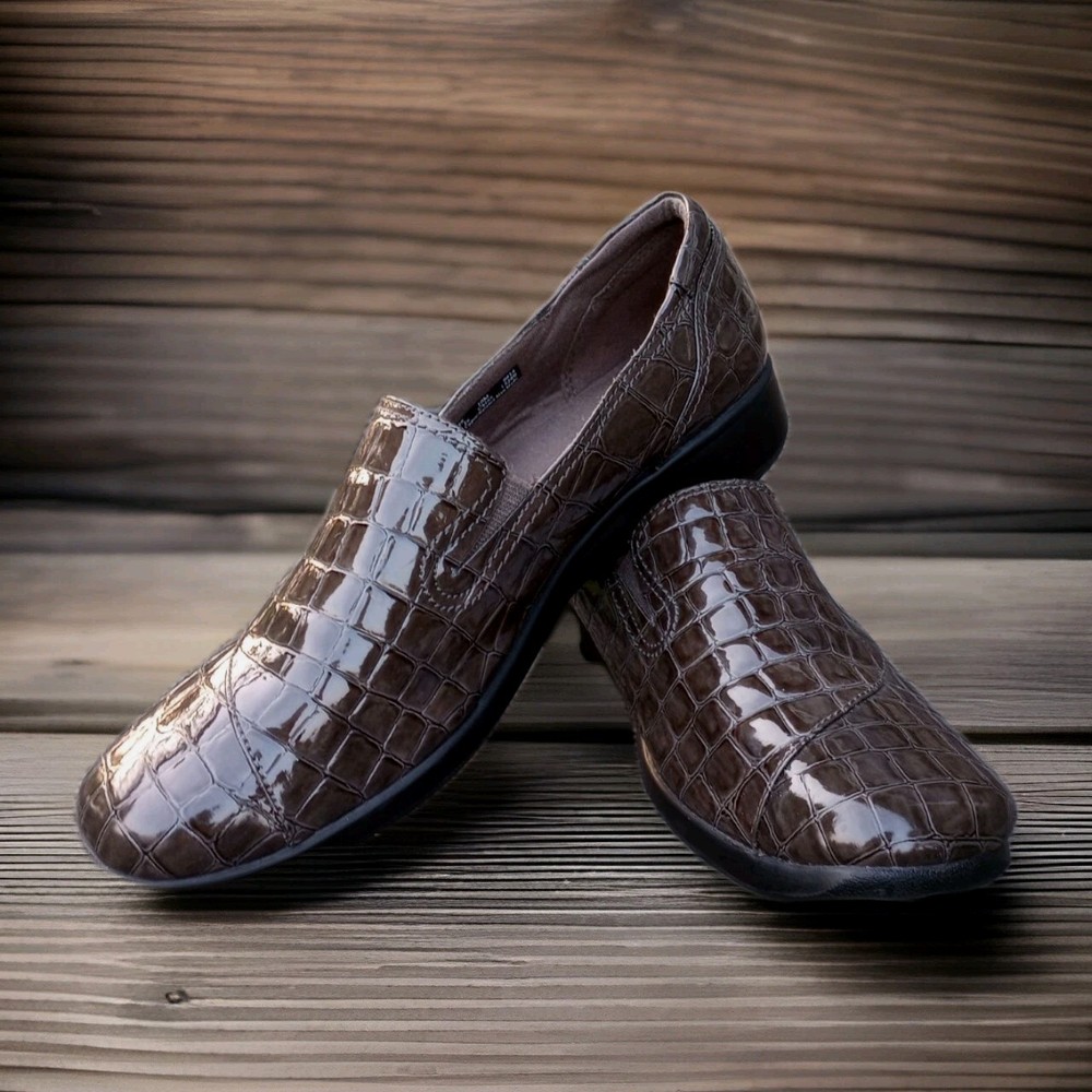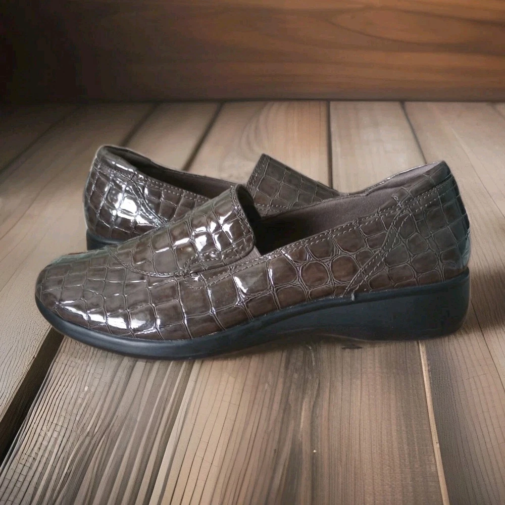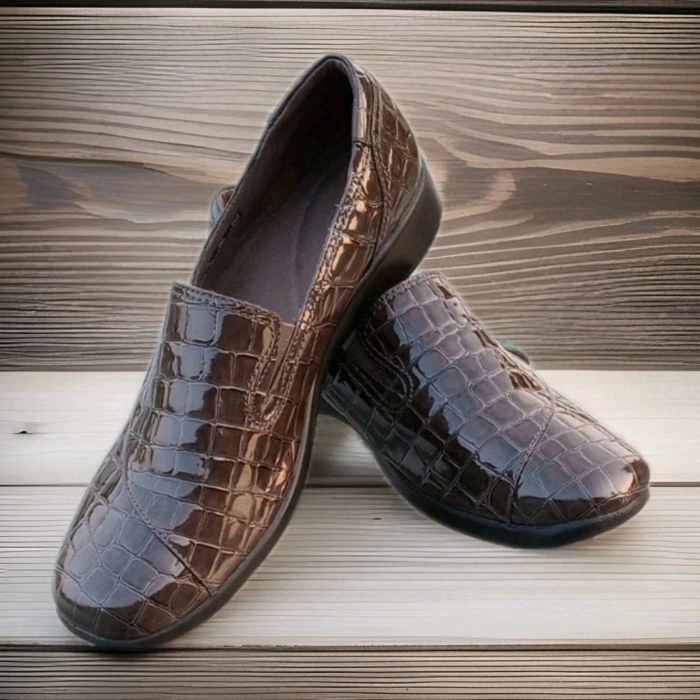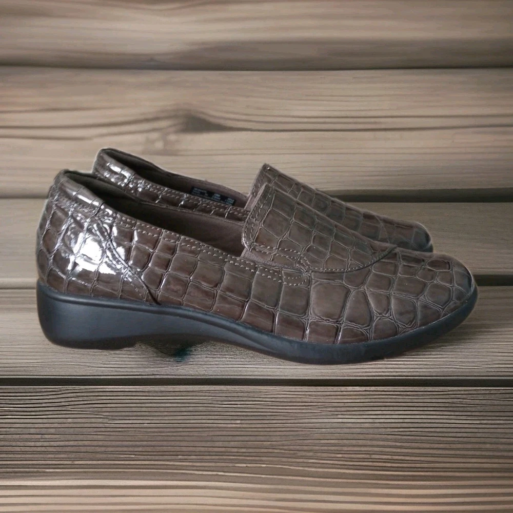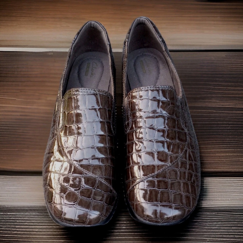 The Clarks Bendables May Poppy Loafer in women's size 10M is a slip-on shoe featuring a round toe and a low 1.6" wedge heel for added comfort and style. Made with faux leather and a synthetic lining, these brown croc print loafers are perfect for travel, casual outings, or business meetings. The cushioned insole and rubber outsole provide all-day comfort, making them a versatile option for any season. Perfect for the fashion-conscious woman looking for a practical yet stylish shoe that can be easily dressed up or down. Excellent condition, please refer to pictures for condition details.