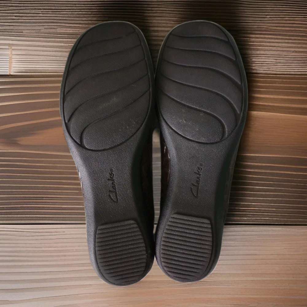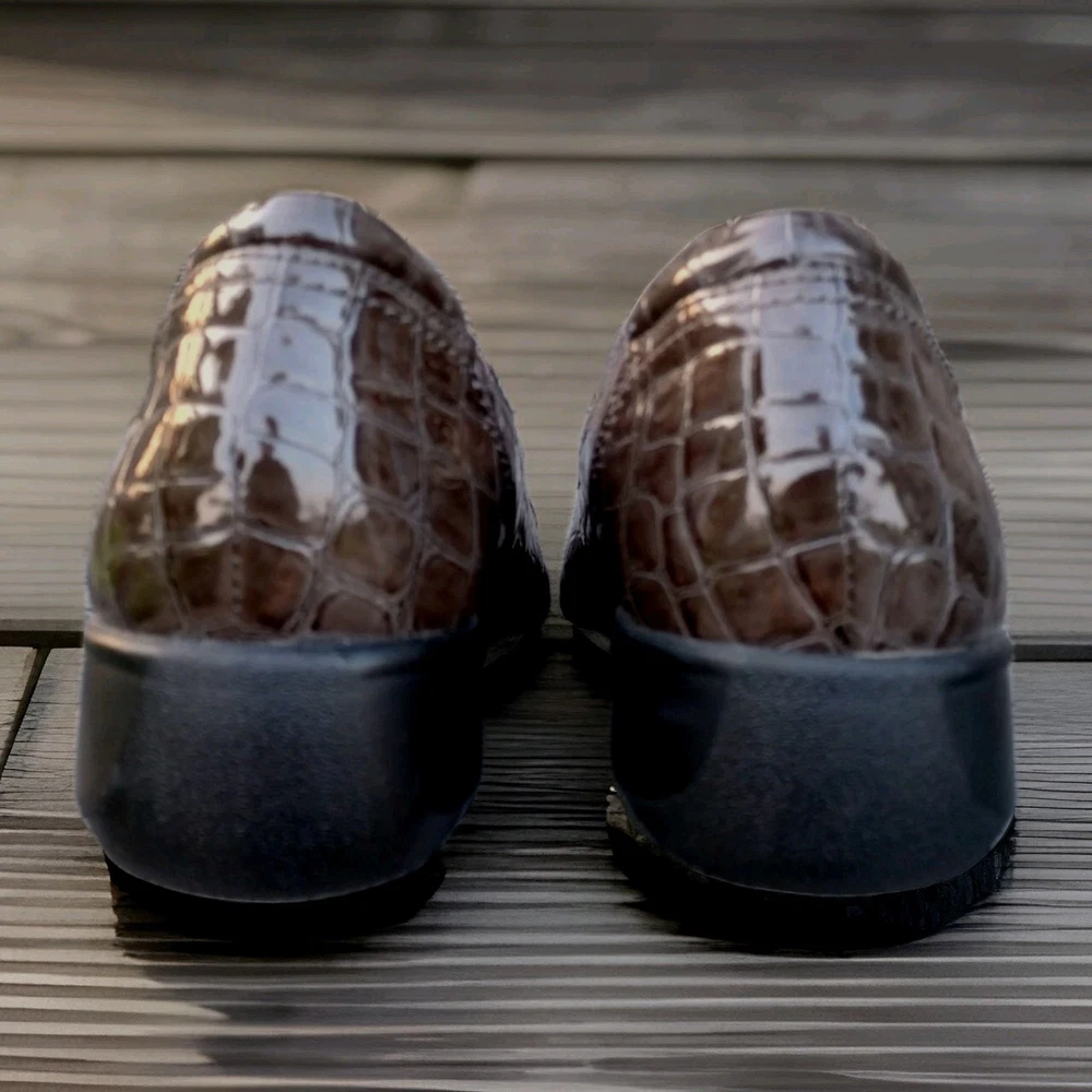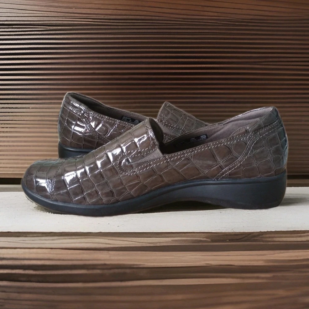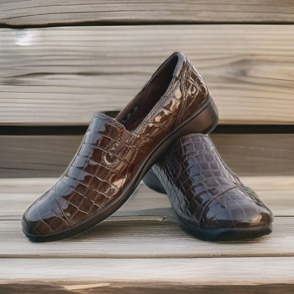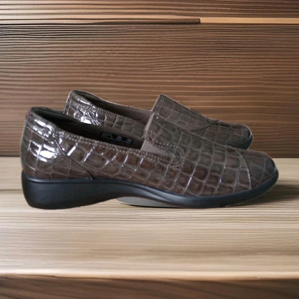 The Clarks Bendables May Poppy Loafer in women's size 10M is a slip-on shoe featuring a round toe and a low 1.6" wedge heel for added comfort and style. Made with faux leather and a synthetic lining, these brown croc print loafers are perfect for travel, casual outings, or business meetings. The cushioned insole and rubber outsole provide all-day comfort, making them a versatile option for any season. Perfect for the fashion-conscious woman looking for a practical yet stylish shoe that can be easily dressed up or down. Excellent condition, please refer to pictures for condition details.