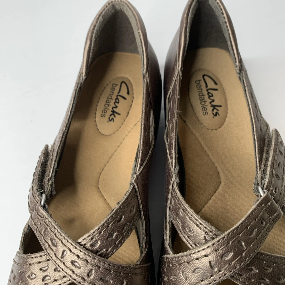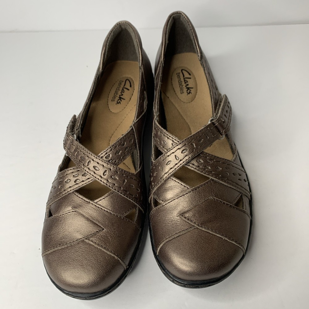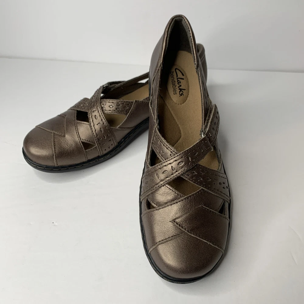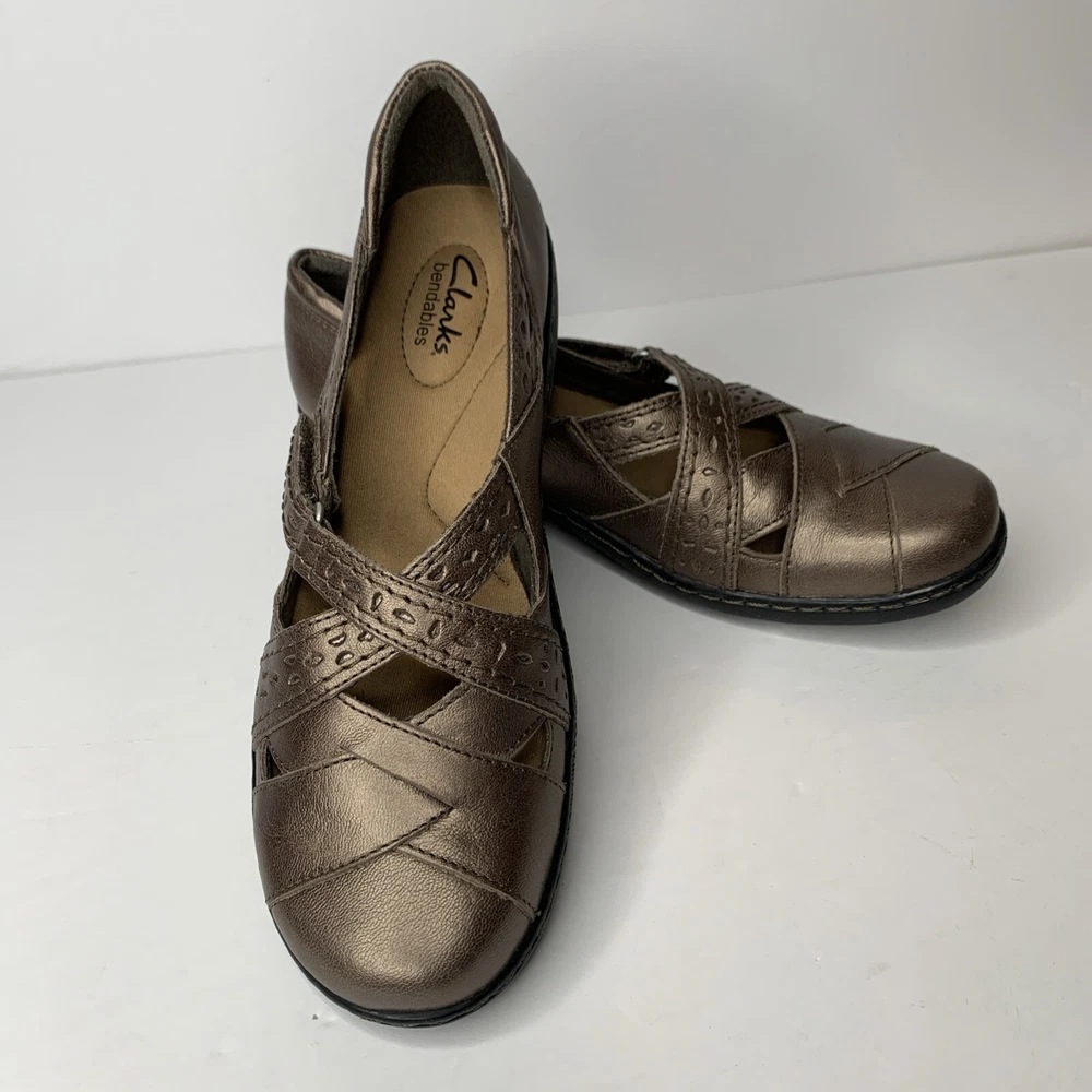 Clarks Bendables Women's Ashland Spin Q Pewter Slip On Loafer in size 9N features a round toe, hook & loop closure, cushioned insole, breathable fabric lining, and adjustable cross cross upper accents. These comfortable and stylish flat shoes are made of leather with a rubber outsole, perfect for casual wear in winter, summer, fall, and spring. Ideal for workwear, this Clarks model is both practical and fashionable.