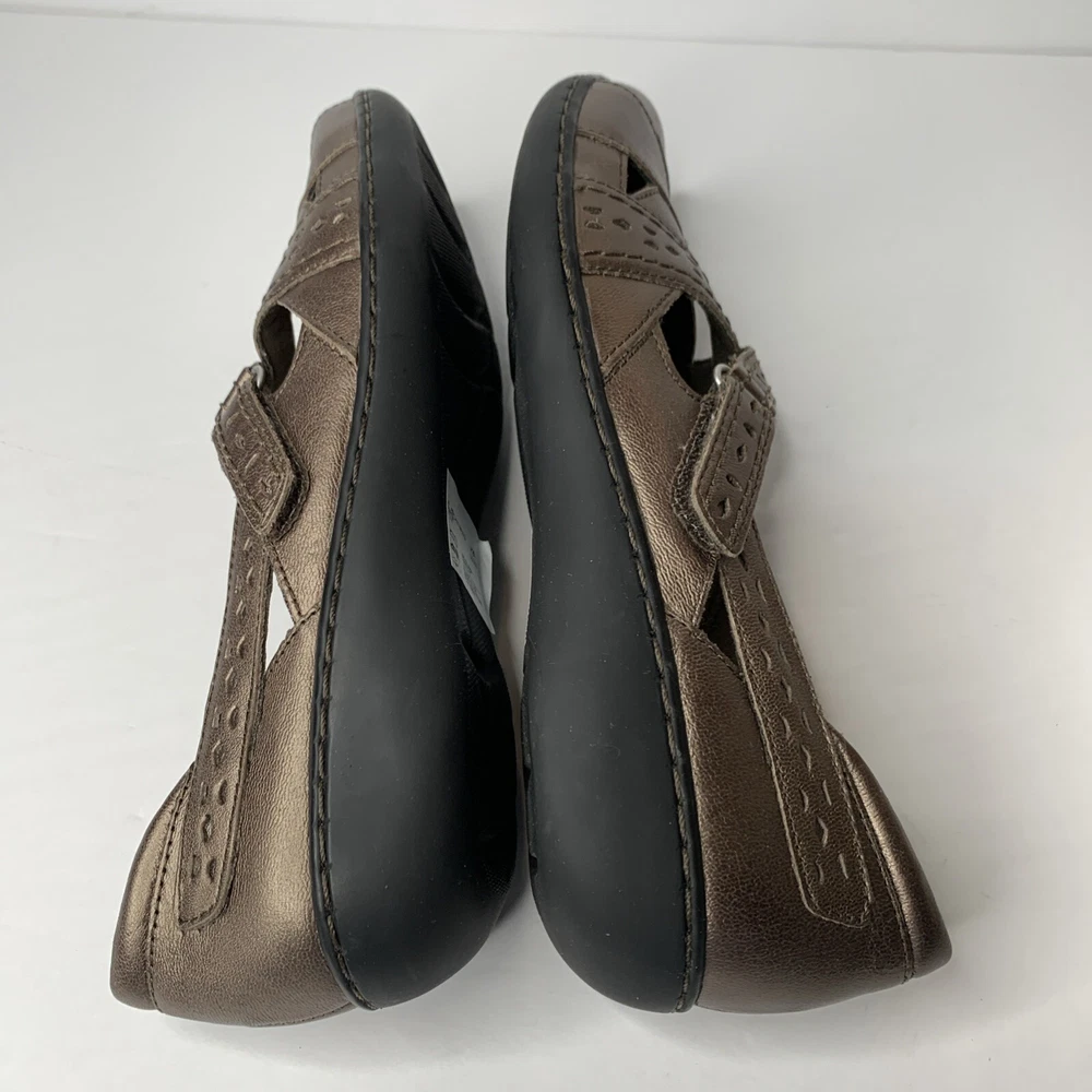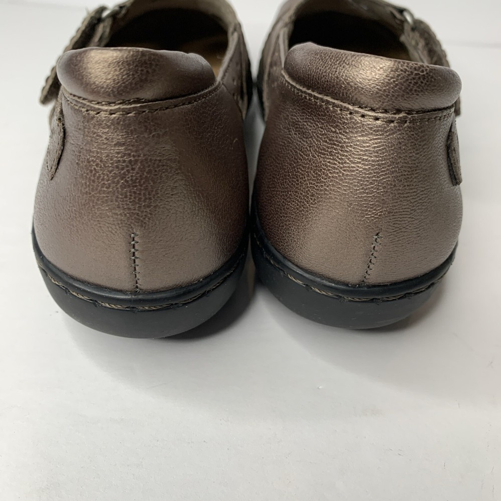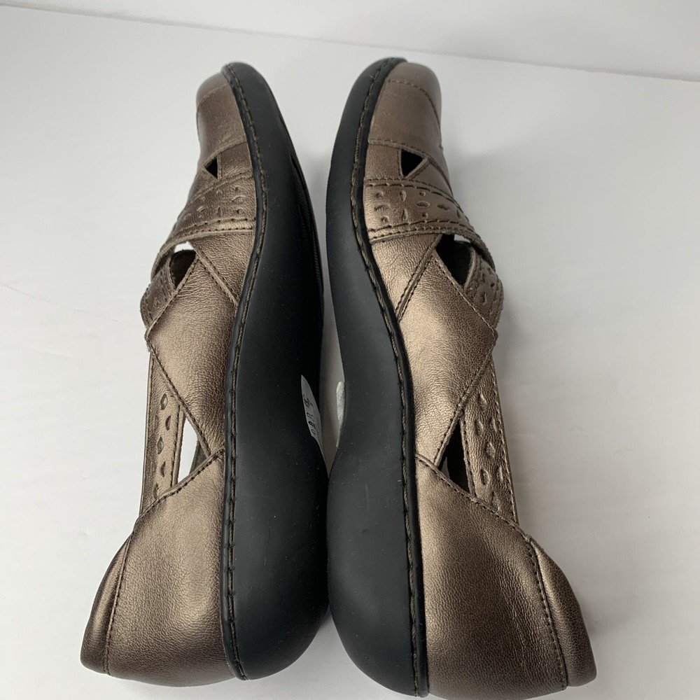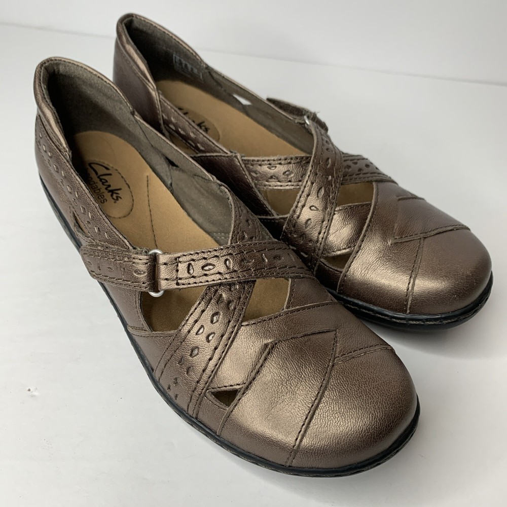Clarks Bendables Women's Ashland Spin Q Pewter Slip On Loafer in size 9N features a round toe, hook & loop closure, cushioned insole, breathable fabric lining, and adjustable cross cross upper accents. These comfortable and stylish flat shoes are made of leather with a rubber outsole, perfect for casual wear in winter, summer, fall, and spring. Ideal for workwear, this Clarks model is both practical and fashionable.