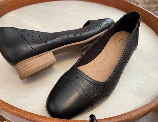 Clarks Black Perforated Leather Pumps Juliet Cedar New Loafer Ballet Description CLARKS Need a little work-look balance? Pumps with some airy perforation and a low walkable heel make the best officemates. From Clarks Footwear. The features are: Brand new in a plain new shoe box Style: Juliet Cedar Leather upper, punched detailing OrthoLite footbed, textured outsole Bottom: Juliet Approximately 1"H stacked heel Leather upper; man-made balance Information provided by Clarks. Be sure to check out my EBAY STORE. Enjoy! Payment, Shipping & Return Information U.S. Buyers to pay shipping and handling of 6.95 for 1st item. For each additional item add 6.95 . For shipping discount to apply, all items need to paid in one combined payment. Missouri Residents to pay Sales Tax Items may returned in original condition for a refund of the purchase price. Shipping costs will not be refunded, unless an error was made by us. International Shipping rates: Canada via 1st class international: 16.95 Worldwide via 1st class international: 21.95 For Multiple item shipping discounts, Priority Mail or Express Mail International please contact me for a shipping Quote International Buyers - Please note: Import duties, taxes and charges are not included in the item price or shipping charges. These charges are the buyer's responsibility. Please check with your country's customs office to determine what these additional costs will be prior to bidding/buying. Due to the USPS raising international shipping costs, I may have to package without the shoeboxes for some International Shipments. We accept Paypal. Thanks for Looking.