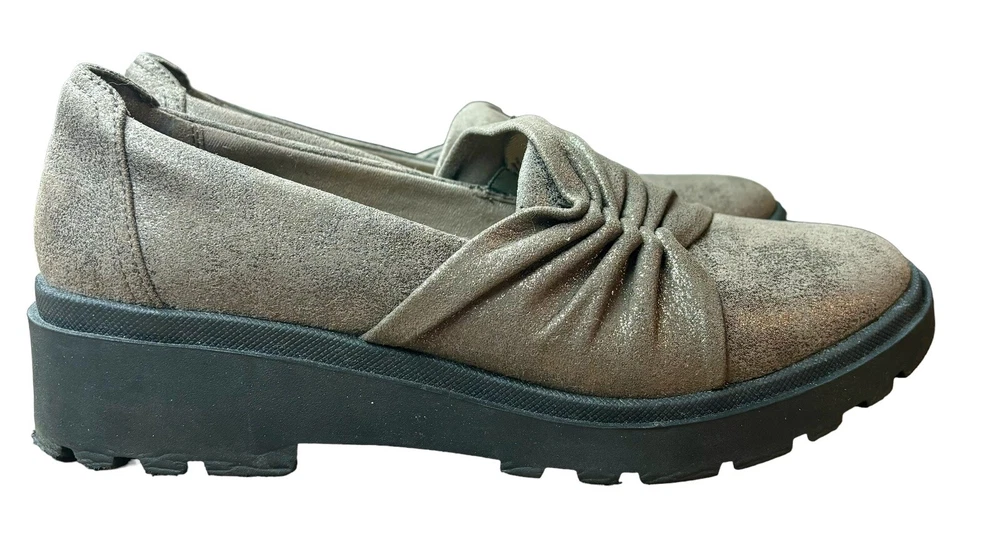 Elevate your shoe collection with these stylish Clarks Calla loafers in bronze brown. The slip-on design makes them perfect for casual occasions, while the lug-sole outsole provides comfort and durability. The fabric and suede upper material is accented with a metal theme, and the shoes are available in UK size 6, US size 8.5, and EU size 39.5. These flats are suitable for all seasons, whether it's winter, summer, fall, or spring. The insole material is also made of fabric for added comfort. These Clarks Calla loafers are a must-have for any fashion-forward woman looking for a comfortable and stylish shoe.