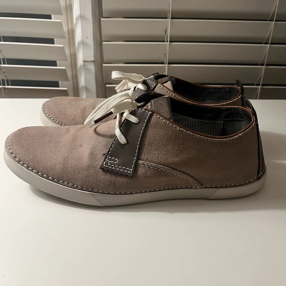 Upper Material: Cotton Character: Urban Explorer, Weekend Warrior, Comfort King, Campus Cruiser, City Walker Style: Sneaker US Shoe Size: 7.5 Department: Men Vintage: No Insole Material: Synthetic Outsole Material: Rubber Model: Clarks Collection Canvas Comfort Type: Casual Features: Cushioned Insole, Contrast Stitching, Lace-Up Closure, Rubber Outsole, Canvas Construction Brand: Clarks Pattern: Solid Customized: No Lining Material: Fabric Color: Brown