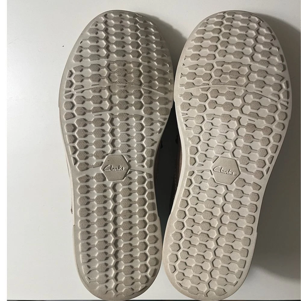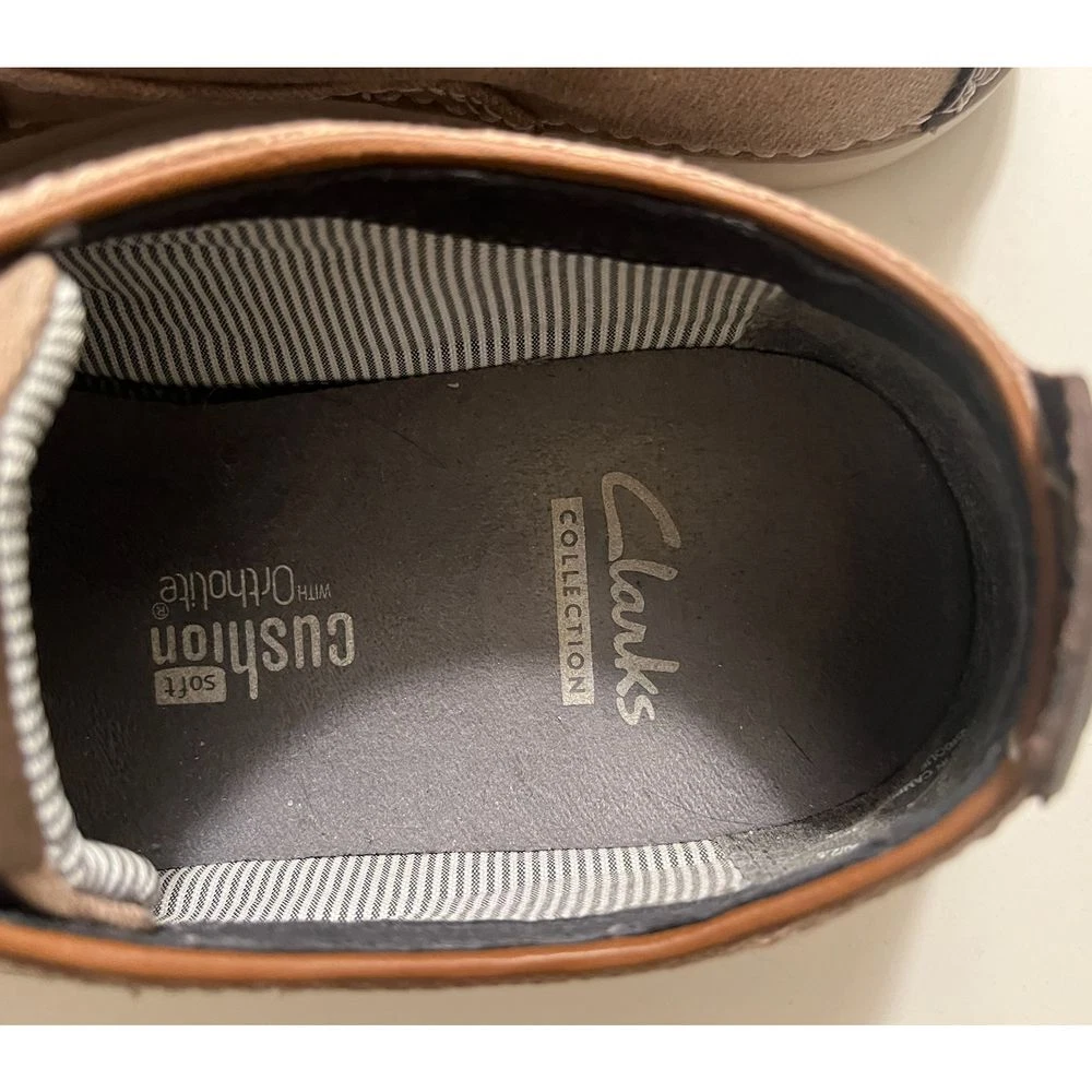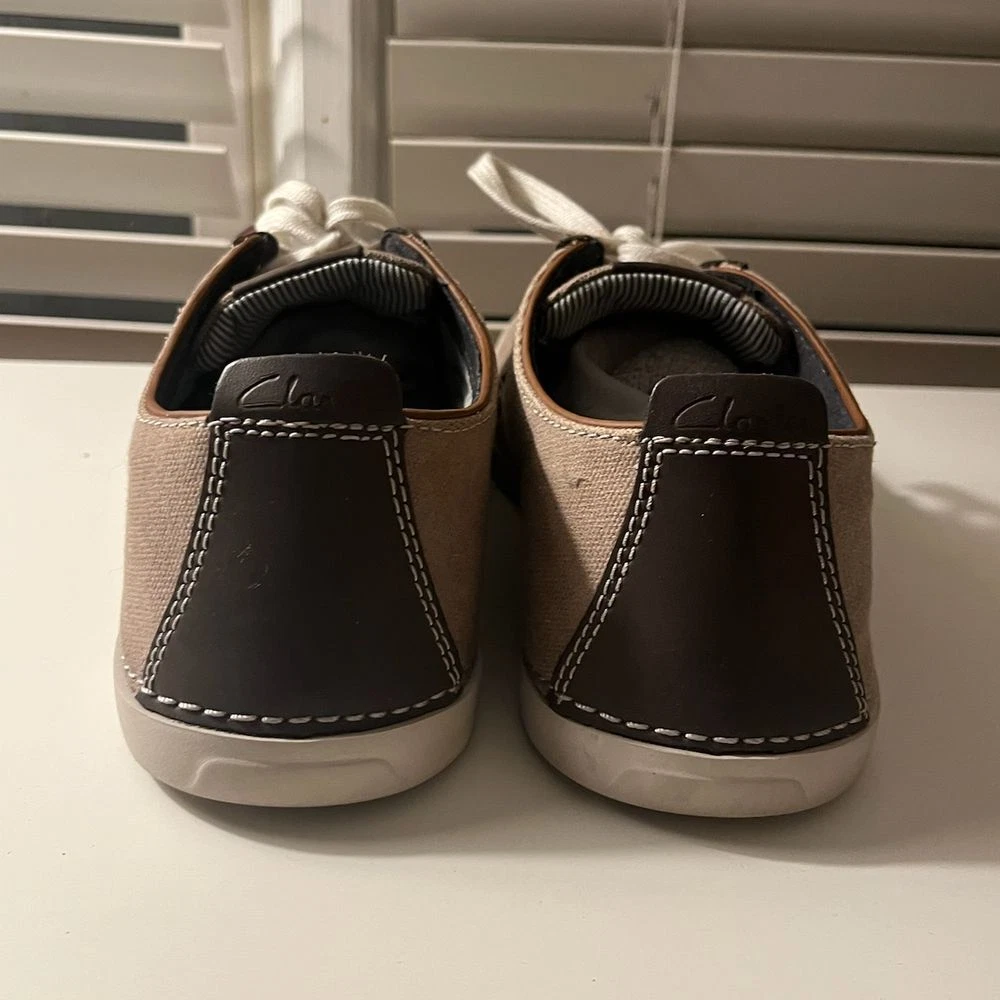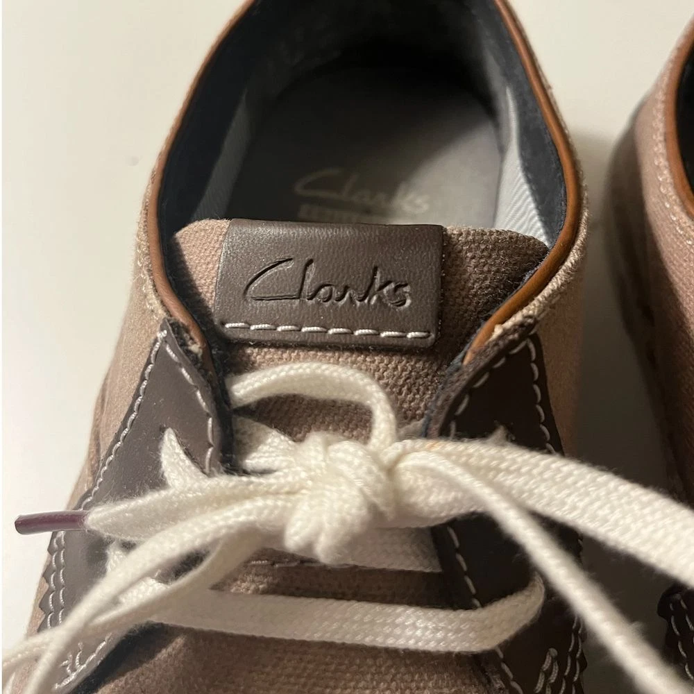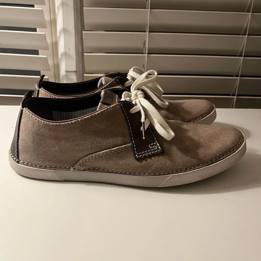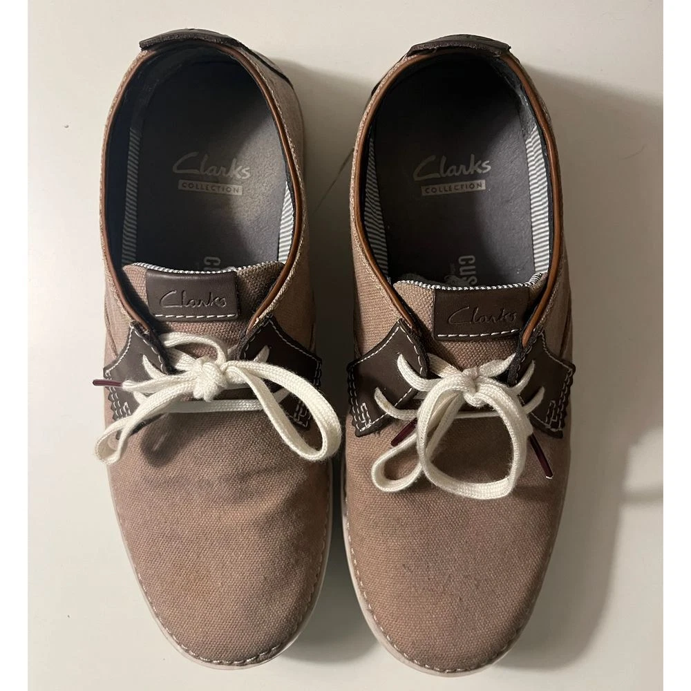 These Clarks Collection casual sneakers blend comfort and style perfectly. Featuring a taupe canvas upper with leather accents and contrast white stitching, these versatile shoes offer both sophistication and comfort. The cushioned insole and durable rubber outsole make them perfect for everyday wear, from casual office days to weekend outings. The classic lace-up design with white laces adds a timeless touch. Department: Men Size: 7.5 Style: Sneaker Color: Brown Upper Material: Cotton Pattern: Solid Features: Cushioned Insole, Contrast Stitching, Lace-Up Closure, Rubber Outsole, Canvas Construction Lining Material: Fabric Character: Weekend Warrior, Comfort King, Campus Cruiser, City Walker Insole Material: Synthetic Keywords: clarks collection, mens sneakers, canvas shoes, casual shoes, lace up shoes, comfort shoes, brown sneakers, everyday shoes, fashion sneakers, lifestyle shoes