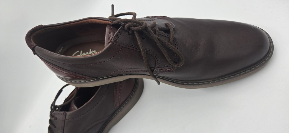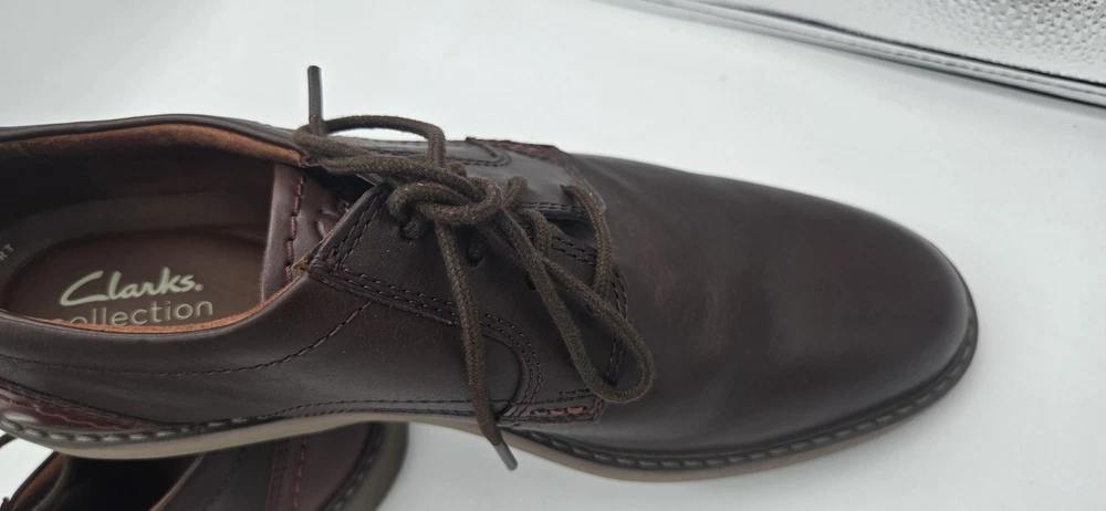 Brand: Clarks Collection Style: Mens leather lace-up oxford casual comfort shoes. Color: Brown with darker brown and maroon heel and stitching accents. Size on tag: US 10 M, UK 9 G, EU 43, CN 270. Materials (per labels): Leather upper; balance man-made materials with synthetic outsole. Made in India. Features: Round toe, lace-up closure, cushioned comfort insole, low-profile midsole, textured rubber outsole for traction, contrast stitching and padded collar. EAN: 5063790773945