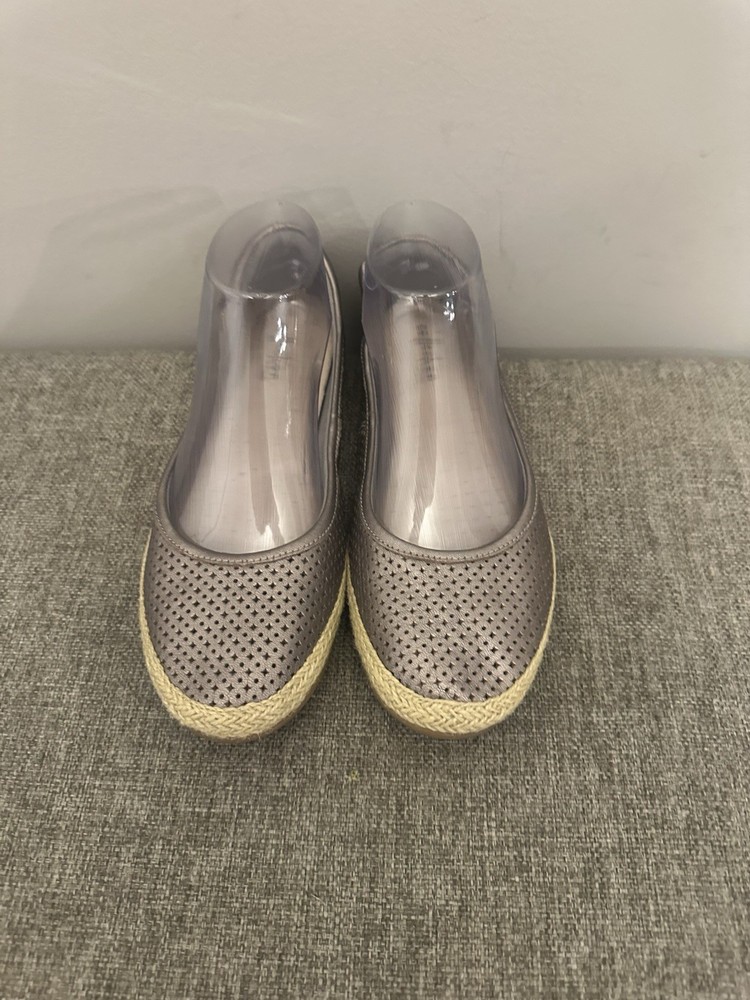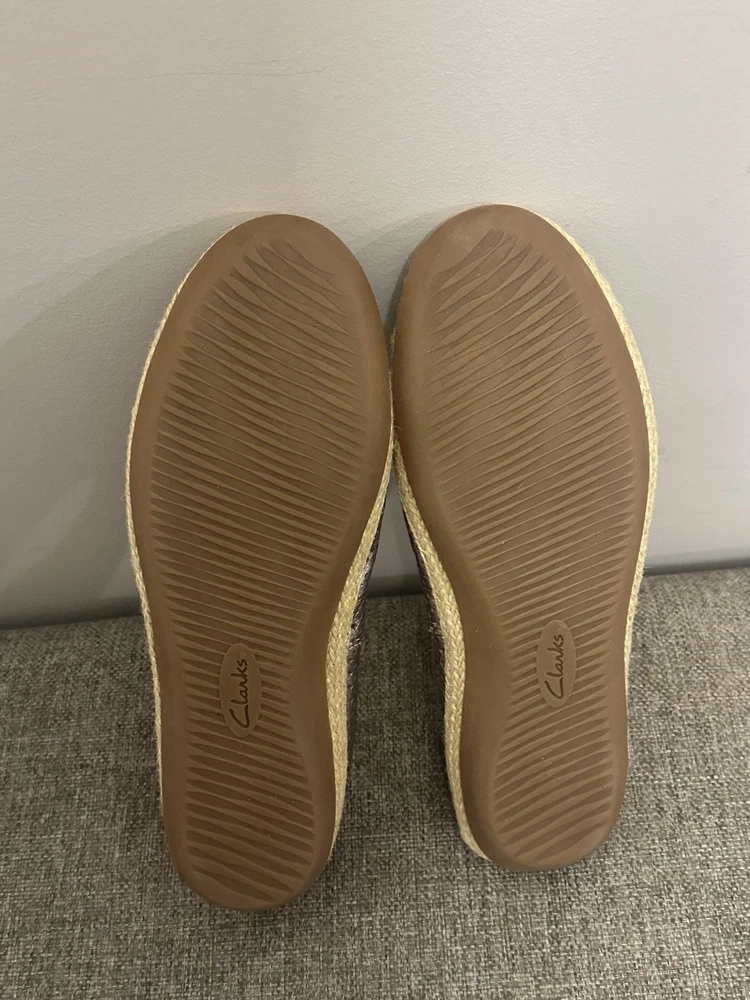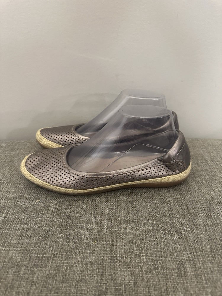 The Clarks Collection Silver Leather Slip On Espadrille Flats in size 8 are stylish and comfortable flats perfect for women on the go. With a slip-on design and cushioned insole, these shoes are easy to wear and provide all-day comfort. The metallic silver color adds a touch of sophistication to any outfit, making them suitable for travel, casual outings, or business meetings. Made with high-quality leather and featuring a rubber outsole, these flats are durable and fashionable, ideal for any woman's wardrobe. Preowned Good Condition