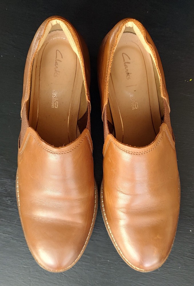 Clarks Cushion Light Brown Leather Slip-on Loafer Dress Shoes Women's 8 US. Shoes are in very good pre-owned condition with only light general wear including some writing and light wear to soles as pictured. Please review all images prior to purchasing.